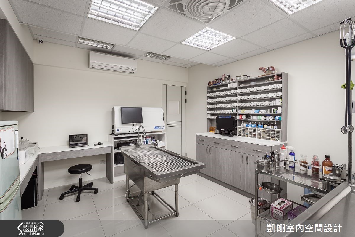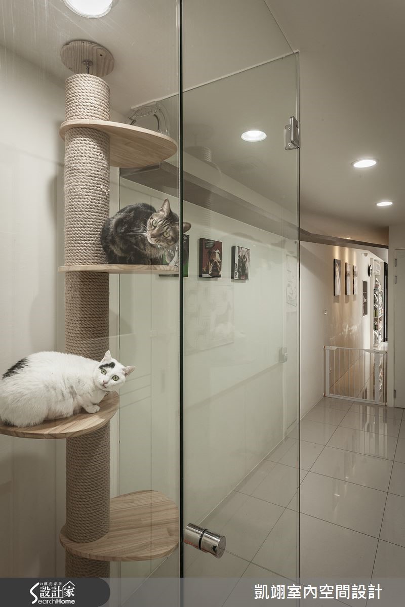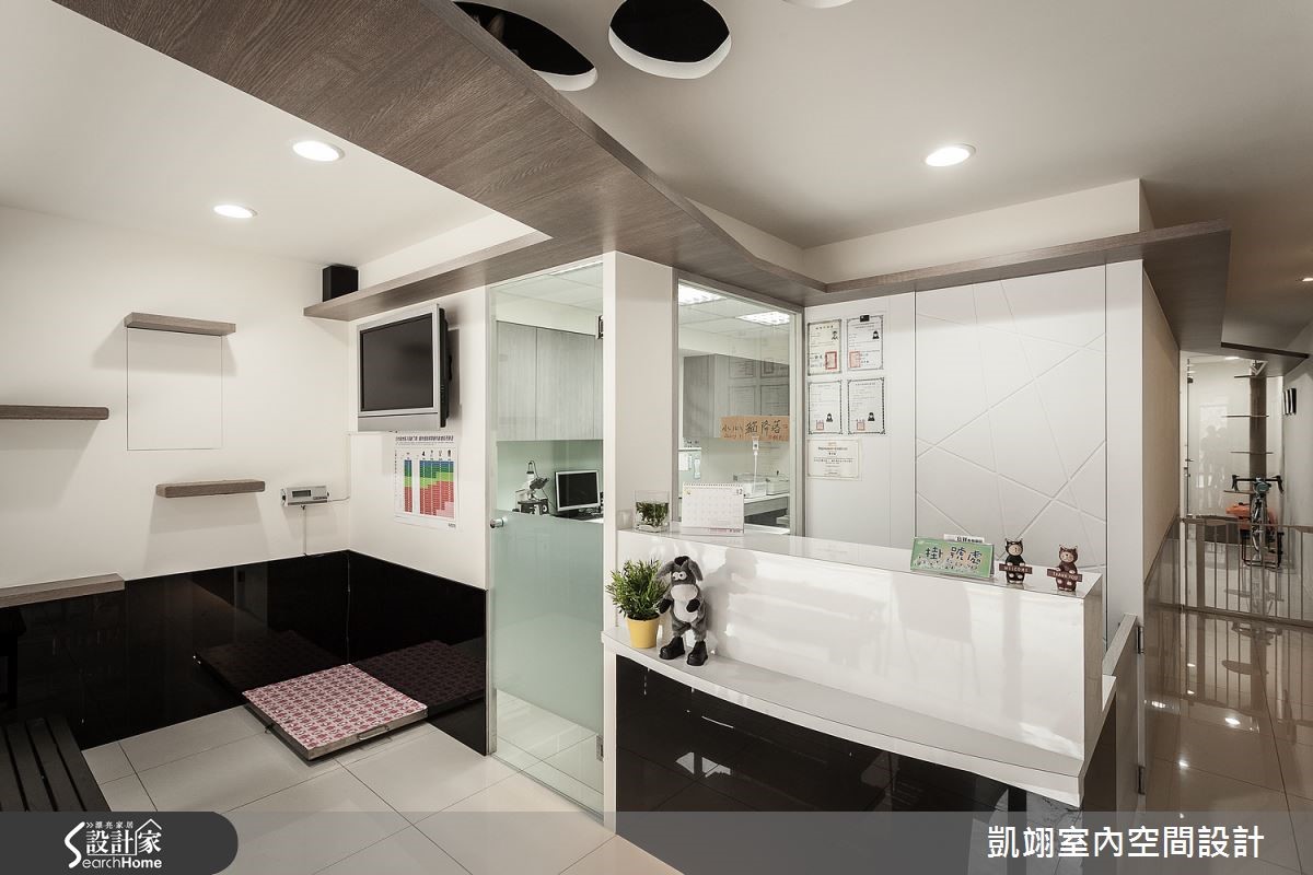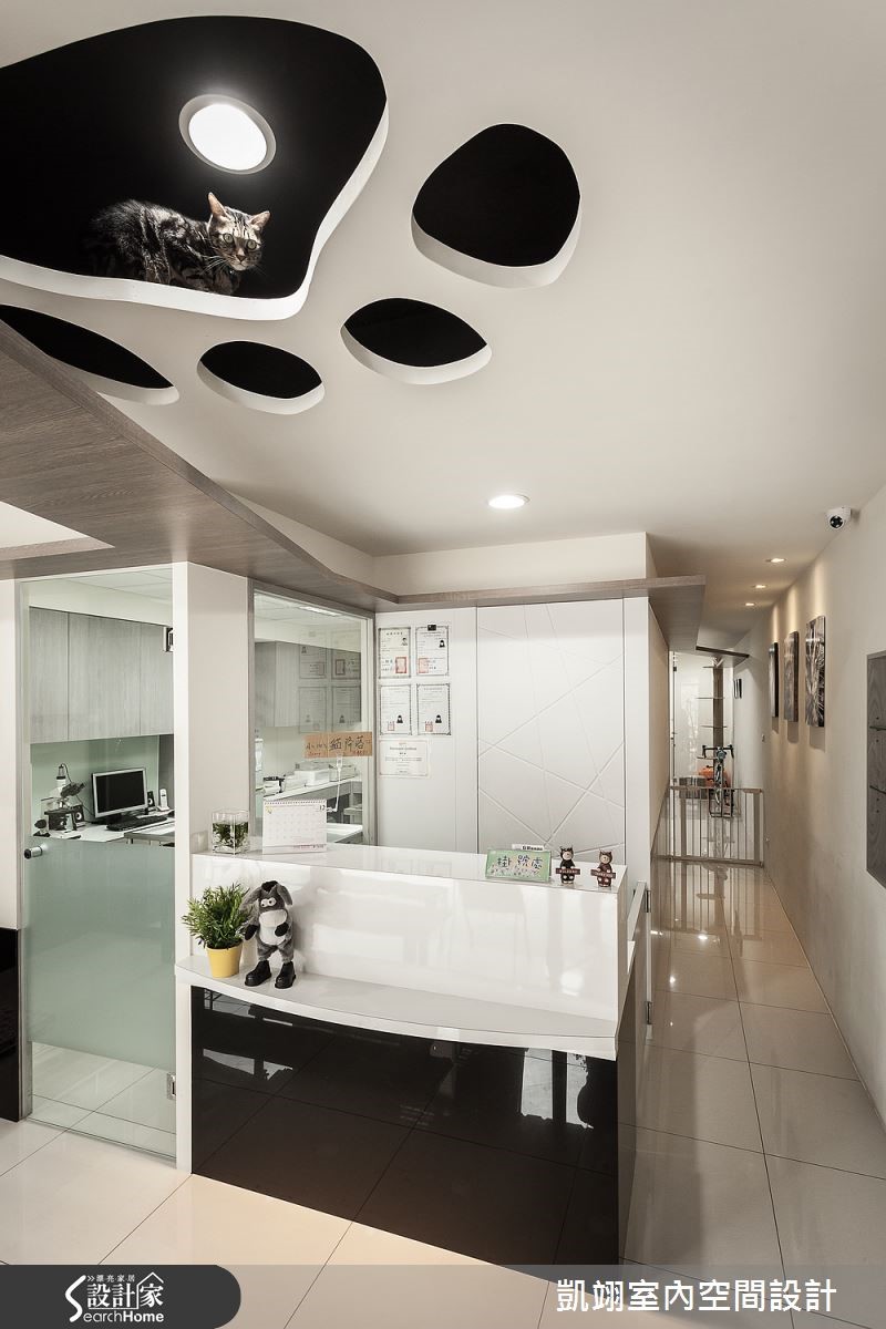 收养了2只猫咪的兽医,希望诊所中能有让爱猫玩耍的空间,以及完整的医疗区、仪器设备收纳。设计师除了解决壁癌、老旧管线和通风不良的问题外,并加入让猫宝贝可以自由活动的区块,打造出合宜的格局和流畅的动线规划。【天花融入猫脚印,增加趣味感】大面玻璃窗引入日光营造明亮空间,时尚氛围跳脱对医院的刻板印象。从门外便能看见为猫孩子特别打造的猫爬架,向上延伸,以树枝造型转接动线,形成专属的天空跑道。天花上的黑色猫脚印,则提供了猫咪躲藏的小空间,镂空的设计,同时也是间接照明的光线来源。诊疗间、手术室特别与公共领域区隔,避免精密仪器或是问诊时受到猫咪活动打扰。向内继续前进,诊间旁还设有一处猫爬架,特别选用黄麻绳捆绑,让猫咪可以磨爪子。上方并设置一个高空观景台,满足猫咪喜欢从高处看风景的喜好。