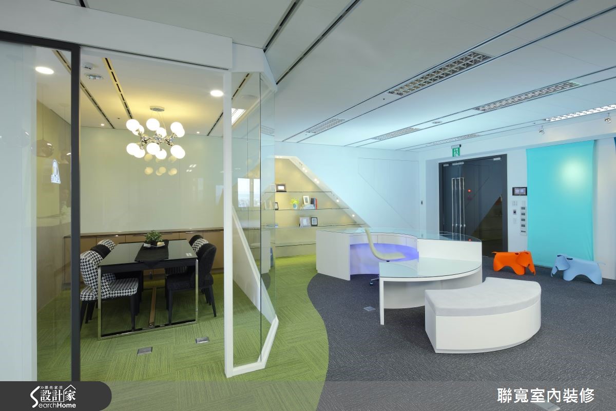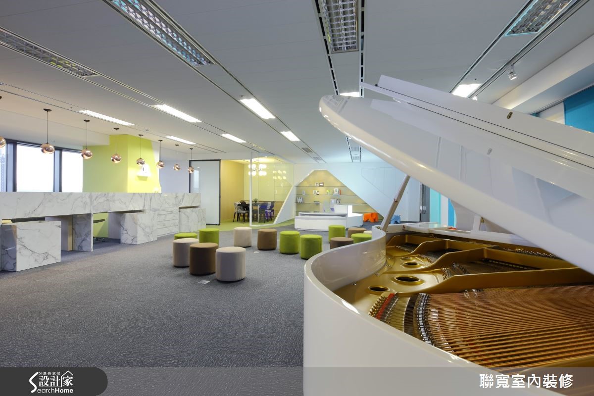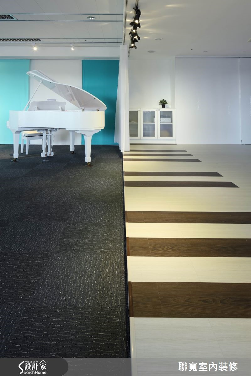由钢琴外型联想,为音乐教室引申出优美的空间弧线,再辅以清爽明亮的色调、材质,在这个宽敞开阔的空间中,无论是大人或小孩,都能徜徉音乐的无穷魅力!【大开间规划,与弧形动线赋予更多可能】188平方米的开放式空间,兼具多功能展示及上课教室的机能性,圆弧形的接待处,设计师将原本支撑的柱体做出包覆设计,进而延伸出几何造型展示柜及会议区,另外,也利用地坪的色彩及材质取代实墙,成为自然轻盈的领域分野。绿色弧形为会议区块,而灰色处是活动的空间;舞台区则以不同色调的超耐磨地板拼接,运用深浅分色在地坪上划出钢琴键盘,即使在行走中,也彷佛正在轻快地弹奏乐曲;而一旁以美耐板为桌面覆上石面质理,可移动设计增加更多使用弹性,既是工作桌 也可作展示柜。