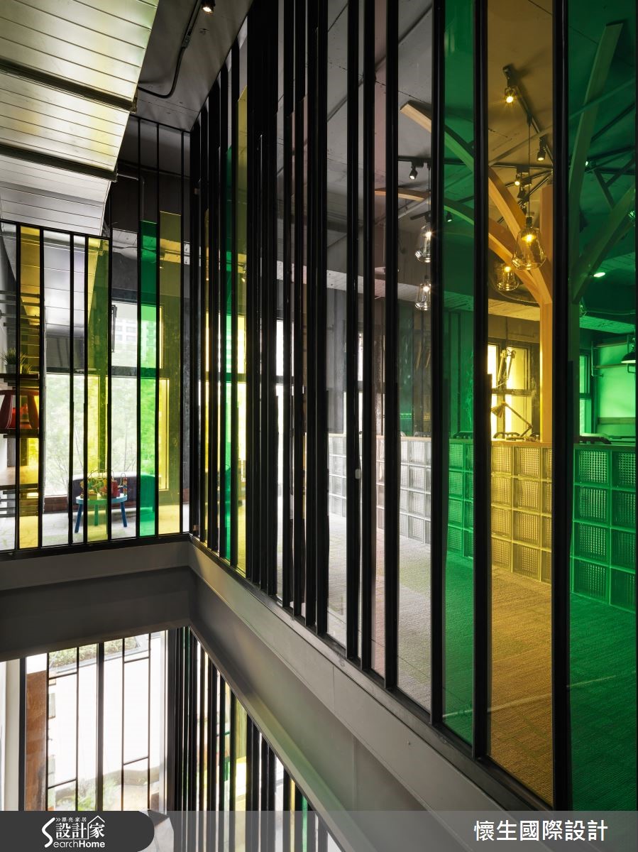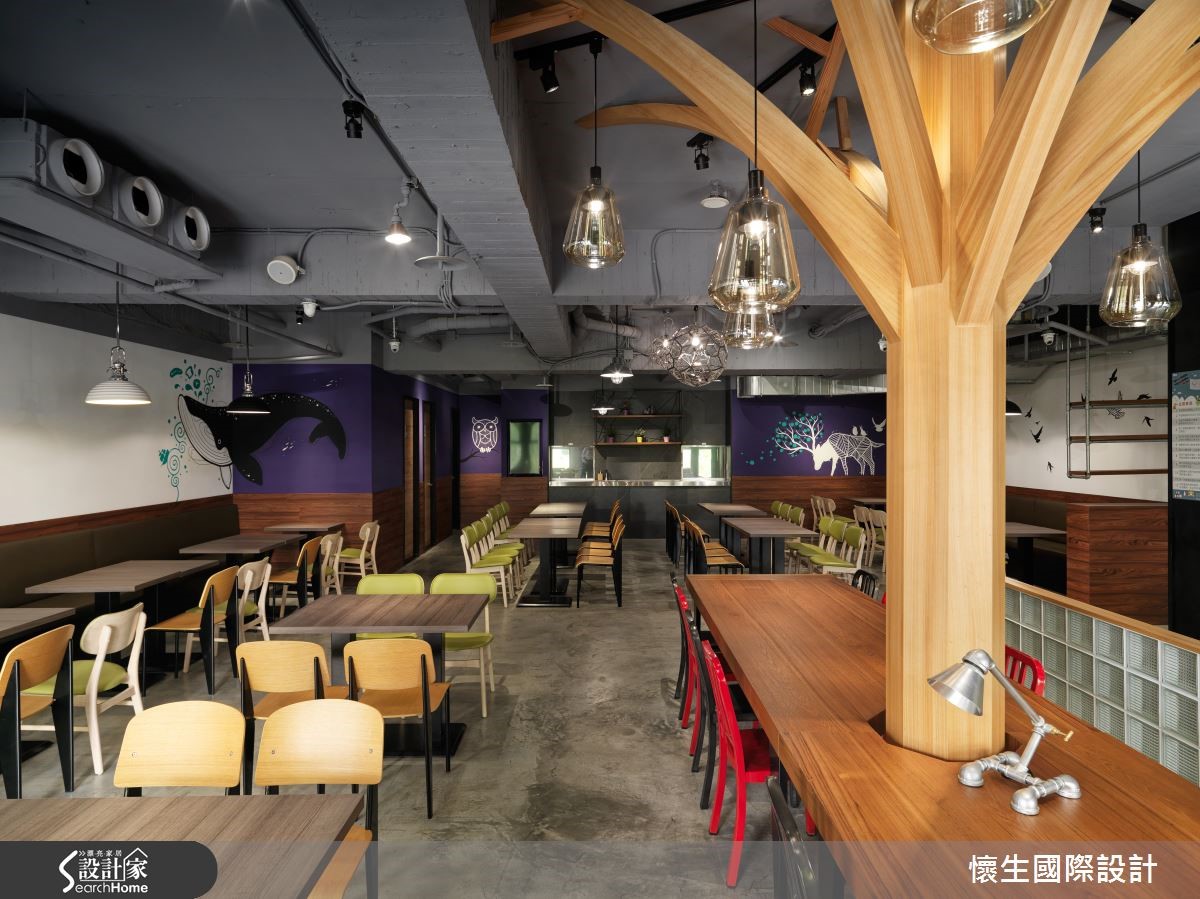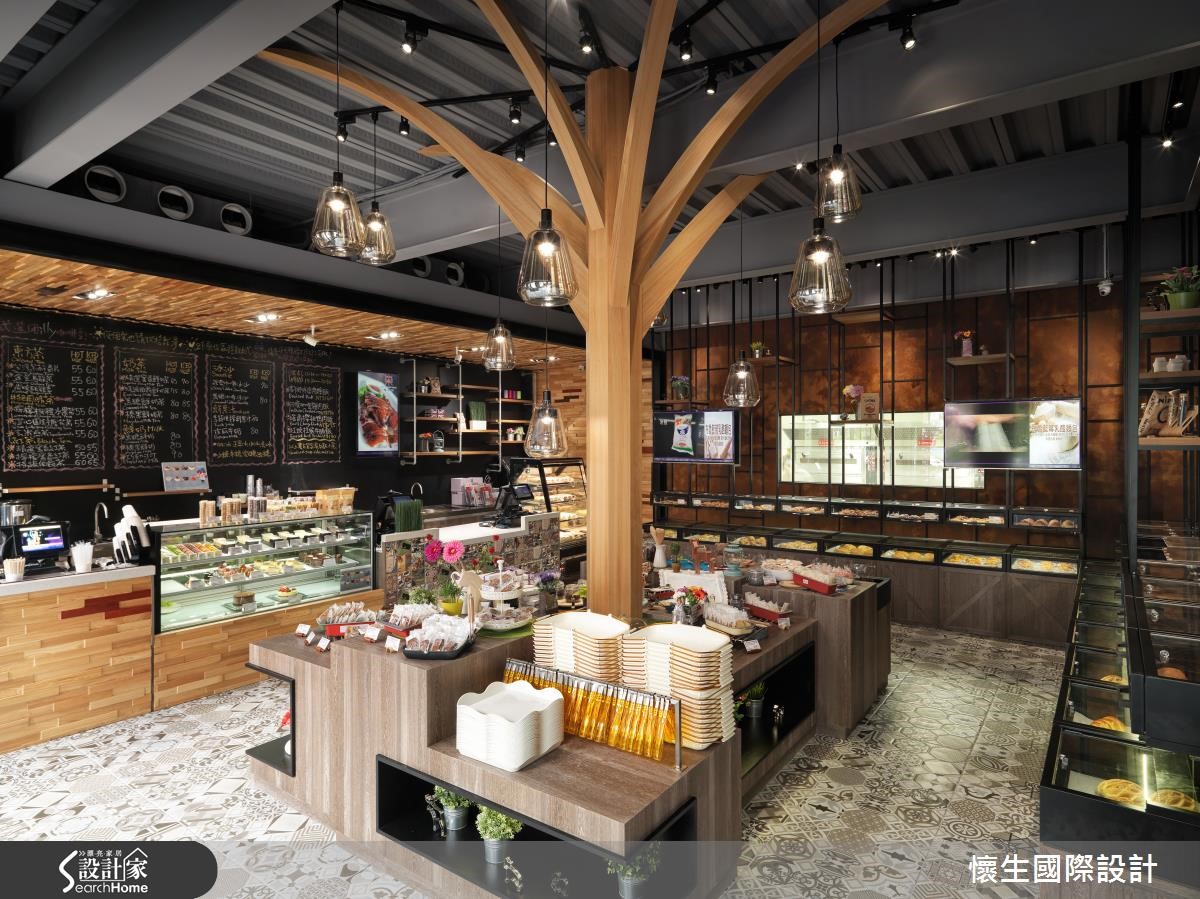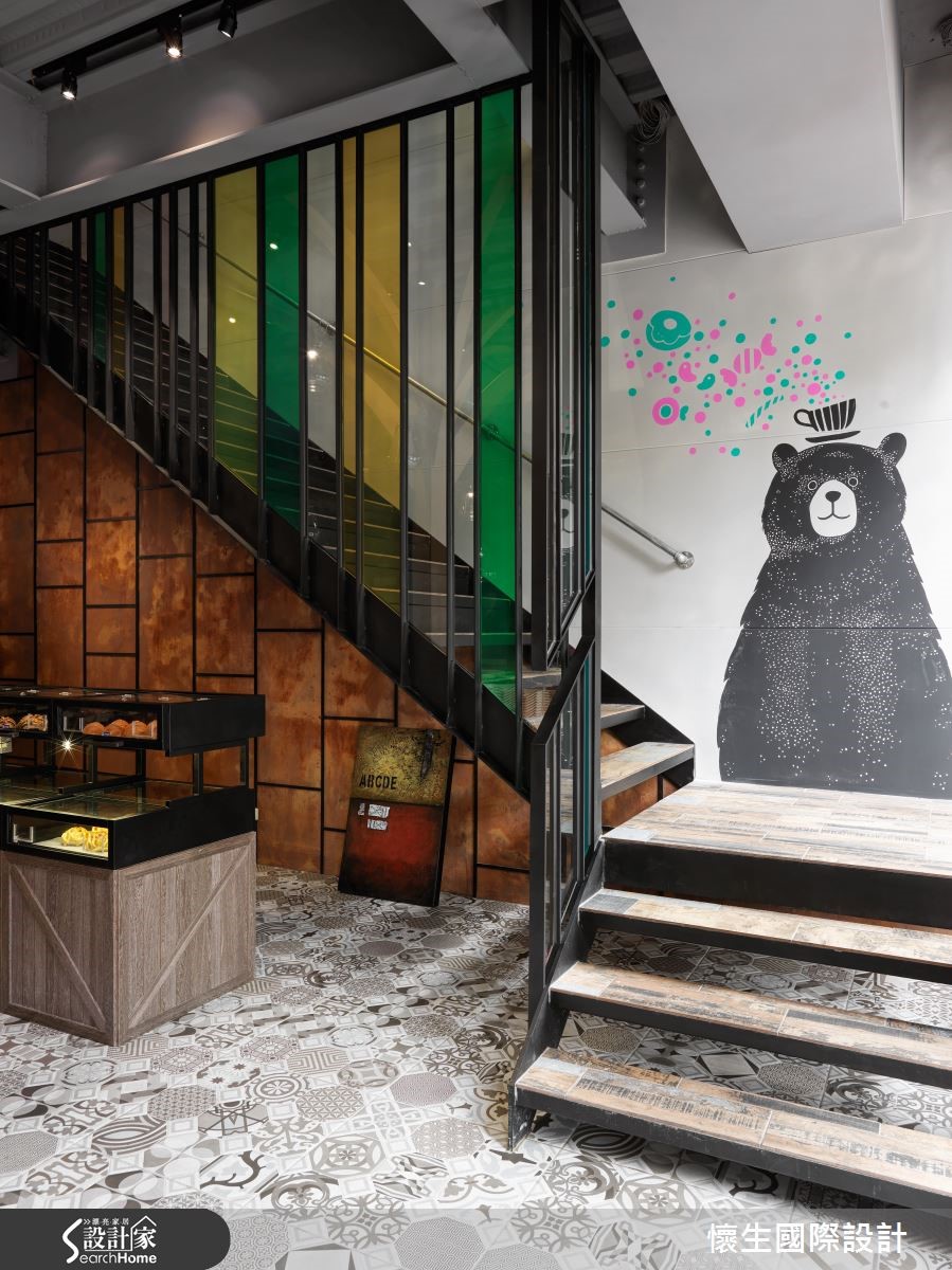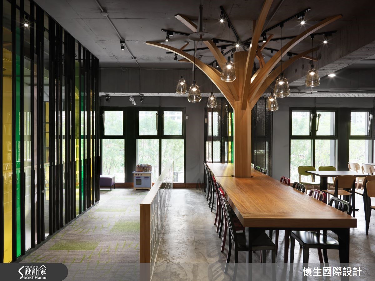 推门走进座落于都市的烘焙坊,空间整体以Loft风作为主轴,挹注大地木质色彩,铺述温馨优雅的格调,且透过装置艺术、灯饰造型等带入森林野餐意象,开启丰富有趣的视觉飨宴。【大型树木装置,引领视觉焦点】入门后,可见拱立的树状艺术装置结合造型灯饰,由此引领顾客视觉焦点,并透过此大树造型,象征令人玩味的"野餐"意涵;整体采以木质色调烘托大地气息,并在墙面加入锈蚀视感,搭配地面砖材点缀,以多种材质强调层次感。【彩色玻璃墙,呈现缤纷童趣】楼梯间配置黄绿交错的彩色玻璃墙,带出多彩缤纷的透光效果,走上二楼,于靠楼梯旁圈划出儿童游戏区,并延续大树主题,结合多种款式餐椅与鲜艳的墙面色彩,创造缤纷的视觉意趣!