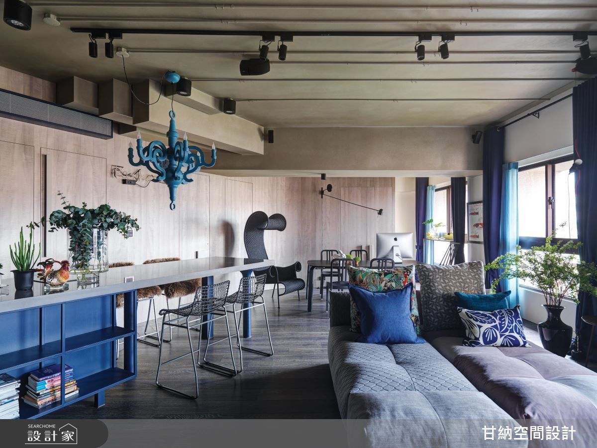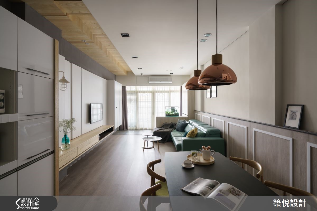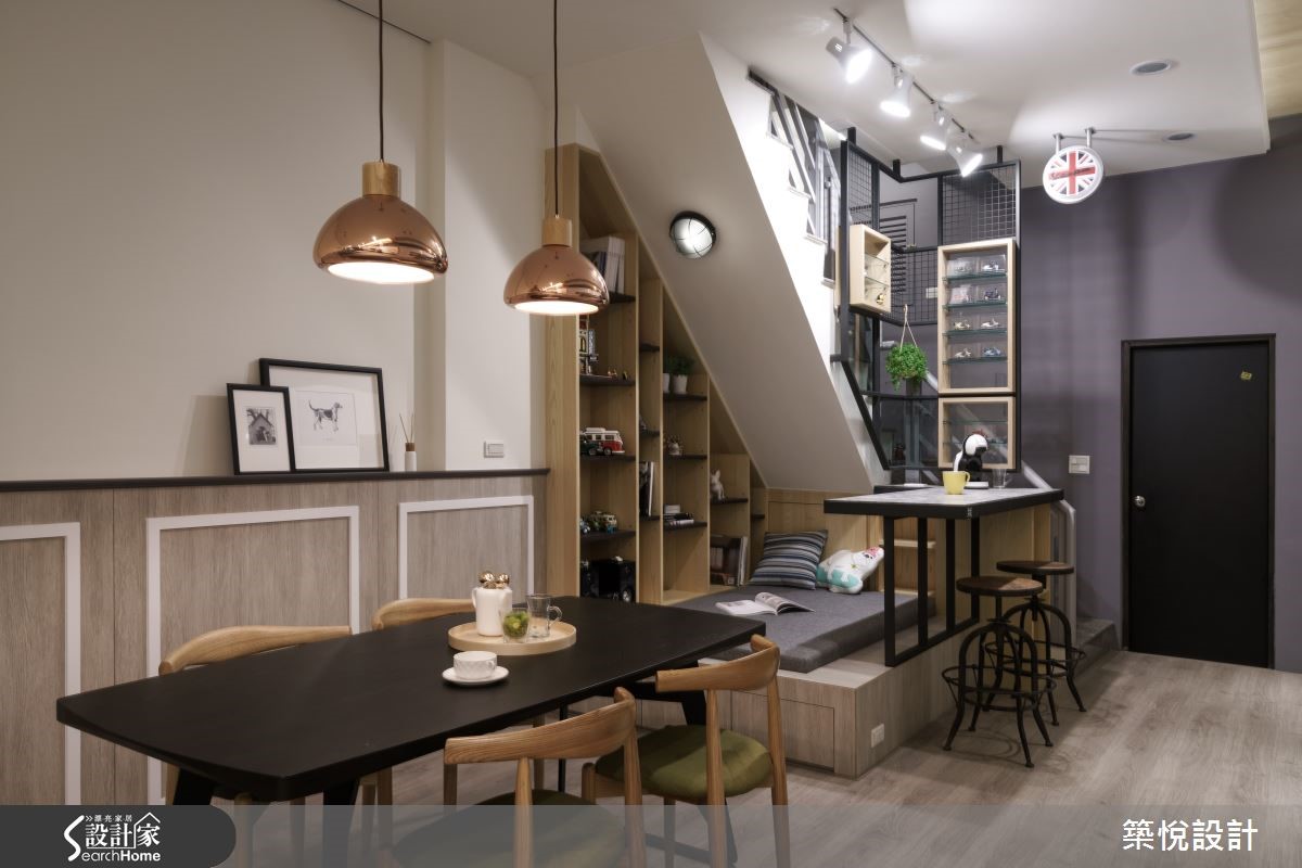 66平米的二手房,原先屋况动线与空间使用率不良,于是设计师重整格局,以开放式设计打造扩容效果,也让亲子的生活互动亲密无间,同时采以轻Loft风定调,少了粗犷与冷冽,多了几分活泼轻盈,描绘出让一家子都心生向往的居家风景!【开放式格局,串连全家生活动线】在横向的长型公共空间中,设计师以开放式格局串连全家人的生活动线,增进日常的情感互动;而为了消弭墙面与柱体间的落差,巧妙做出凹凸立体造型,不仅修齐墙面突兀感,更增添空间立体表情。配色上则采以木地板搭配腰板、木柜等型塑大地色调,替净白色基底染上温润气息,并加入蓝绿色沙发、草绿色餐椅、铜色吊灯等软件细心配色,构筑出轻盈带有个性的视觉感受。【楼梯下的大妙招!规划成阅读小飘窗】梯间梁下空间则予以善用,架高底部规划成可任意躺卧的小型飘窗,墙面配置柜体增加置物机能,更将黑色铁网连结楼梯侧墙,将展示功能向上延伸,一旁连结了L型桌体,作为简易型吧台兼书桌使用,充分发挥每一吋空间。
