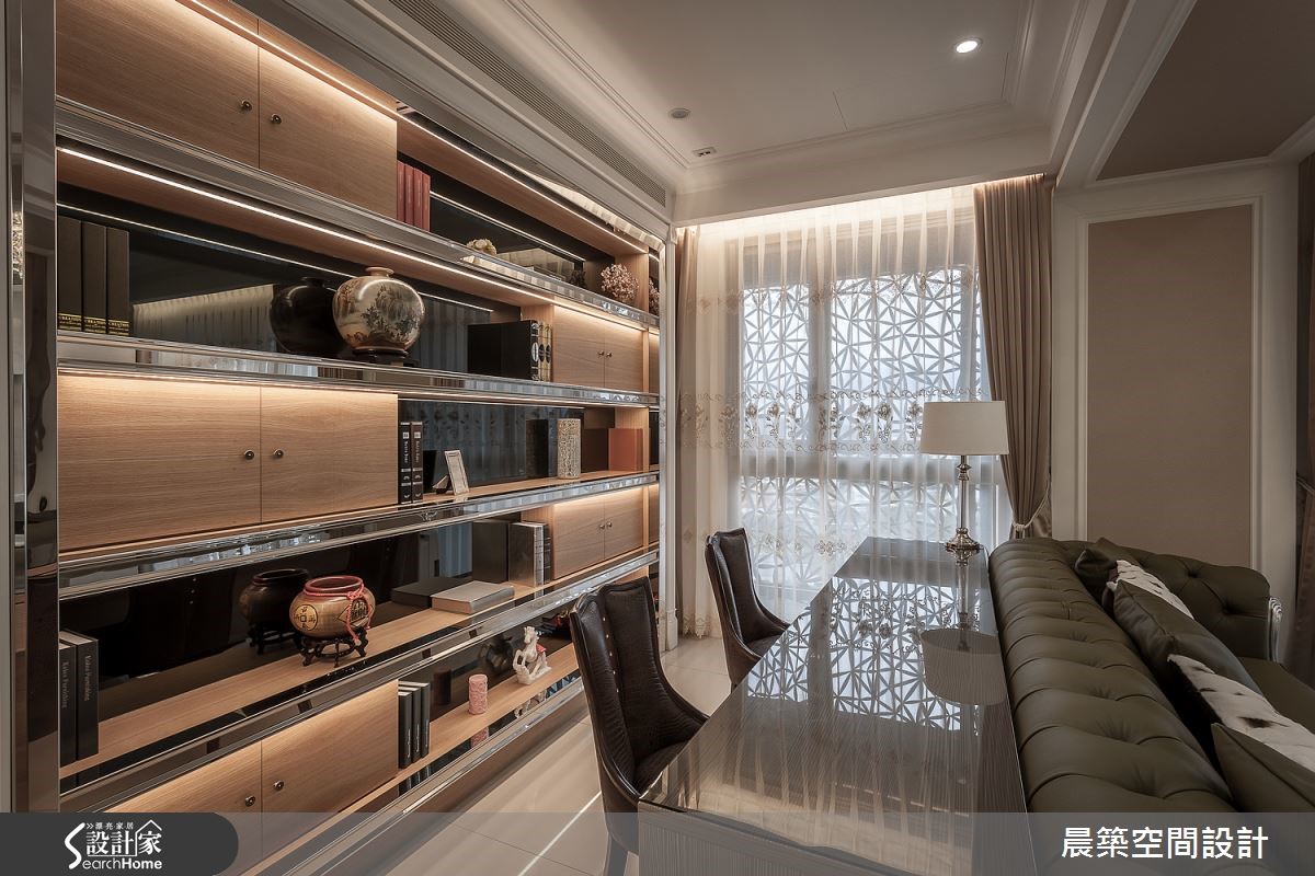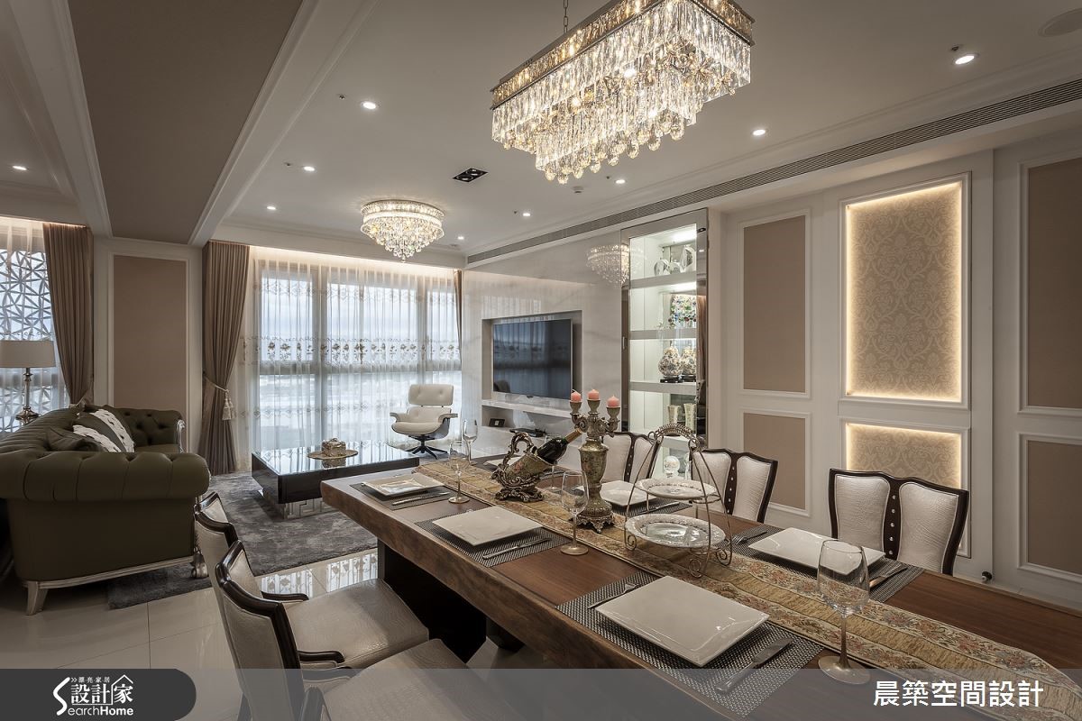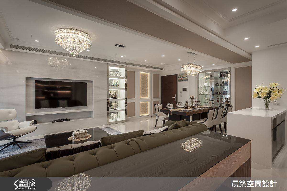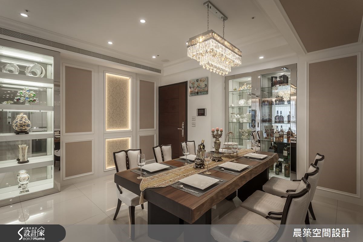 此案为 58 坪退休宅,设计师考量到屋主平时好客,于是给予大器开阔的格局规划,且简化线板形式,加入不锈钢、镜面及壁纸来增加空间质感,打造出简单舒适的新古典好宅,快跟着小编一起去看看吧!公领域中,将客厅、餐厅、书房採开放式格局规划,将大樑予以包覆美化,在简化视觉压迫的同时,也形成场域区块的简单划分;并于空间融入大量的玻璃展示柜体结合灯光投射,辅以金属不锈钢作量体饰边,透过收藏艺品、餐具与藏酒的妆点,强调整体高贵意象,且收掉繁複线条,保留新古典的简约线板元素,採浅茶色壁纸局部铺排壁面,达到完美的视觉平衡,电视主墙则呼应白色轻盈底调,以浅灰大理石创造和谐画面,再加上水晶吊灯、沙发软件与植栽妆点等,画龙点睛地透出端庄奢华的效果,而书房书柜则型塑端景画面,兼具展示及收纳效果,透过不锈钢及镜面的材质运用,延伸视觉景深,勾勒时尚表情!小编的最爱私领域则重划格局,将原有 3 房 2 厅重新区分,把一间卧房纳入主卧内,且揉入茶色的视觉主调,营造安稳的睡眠氛围!