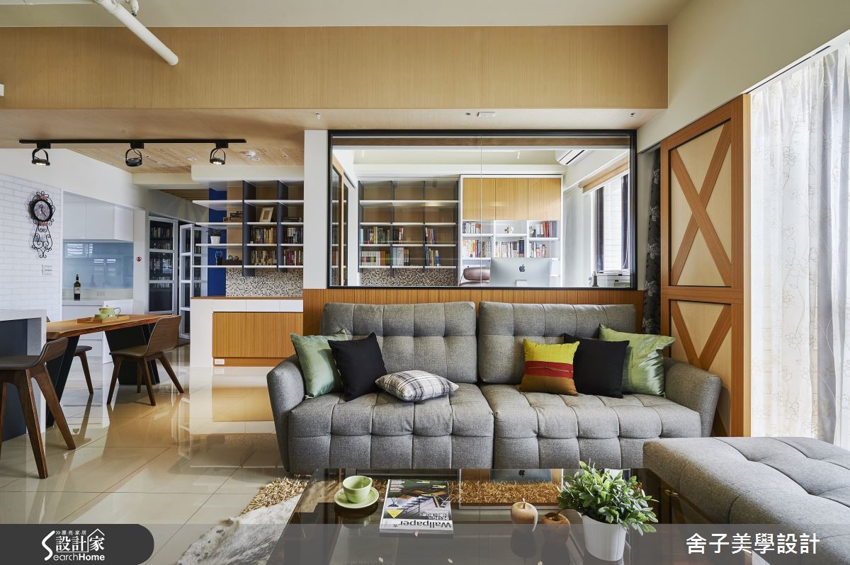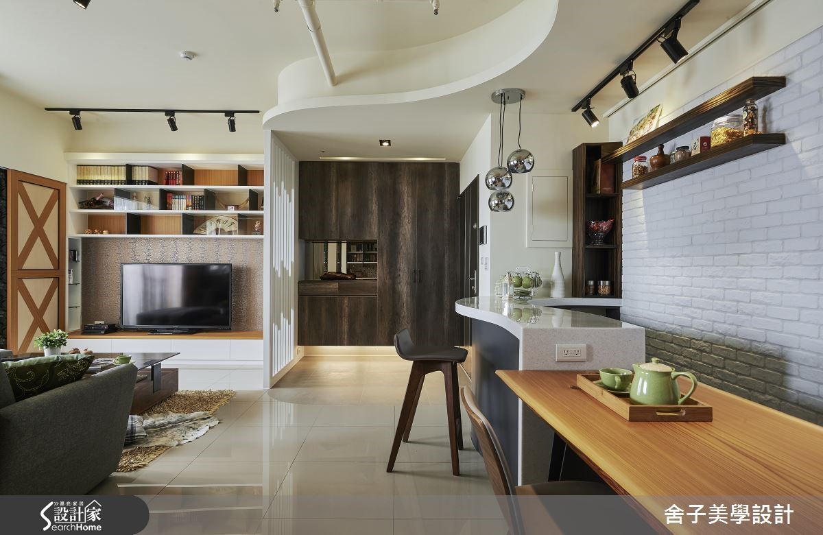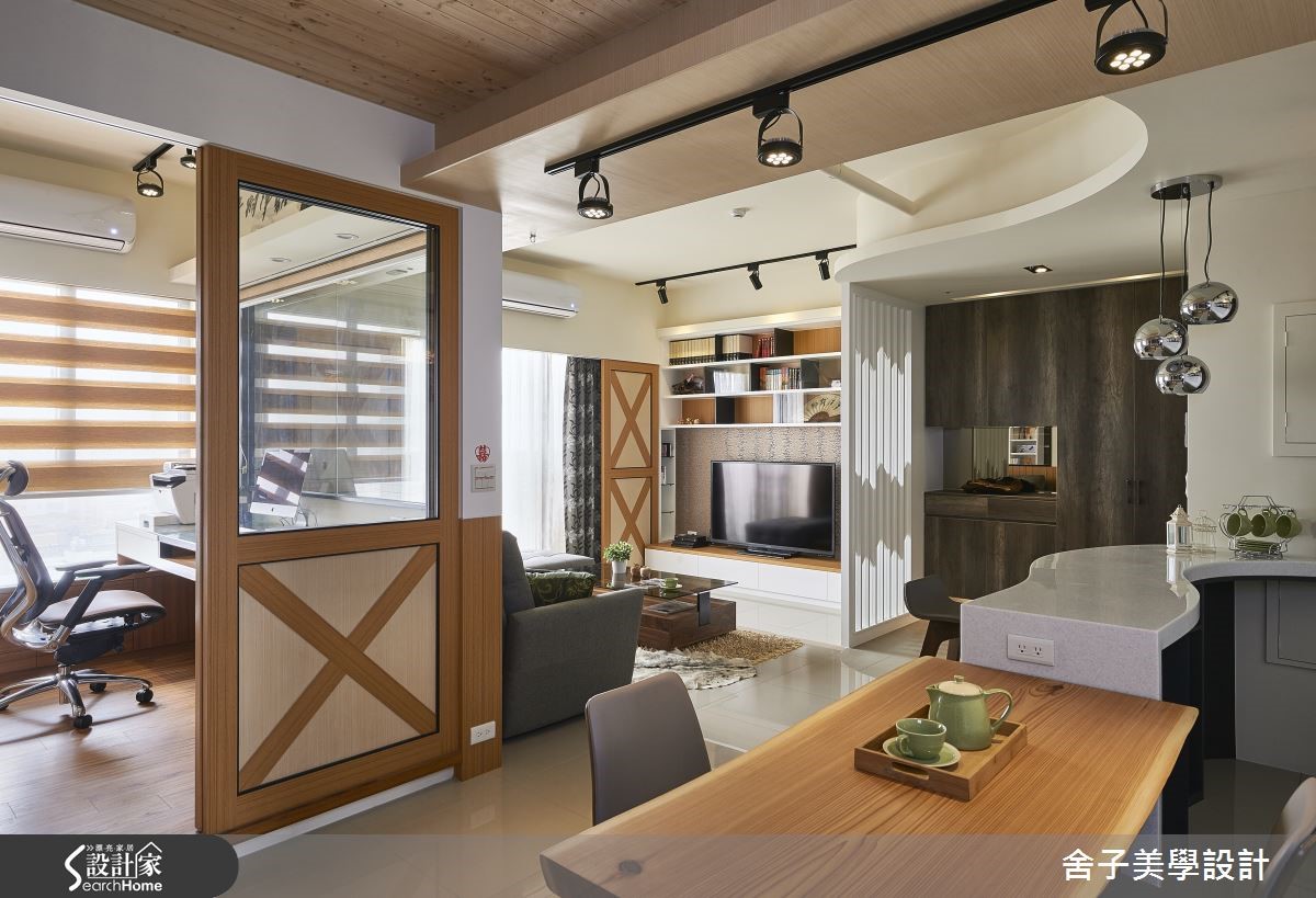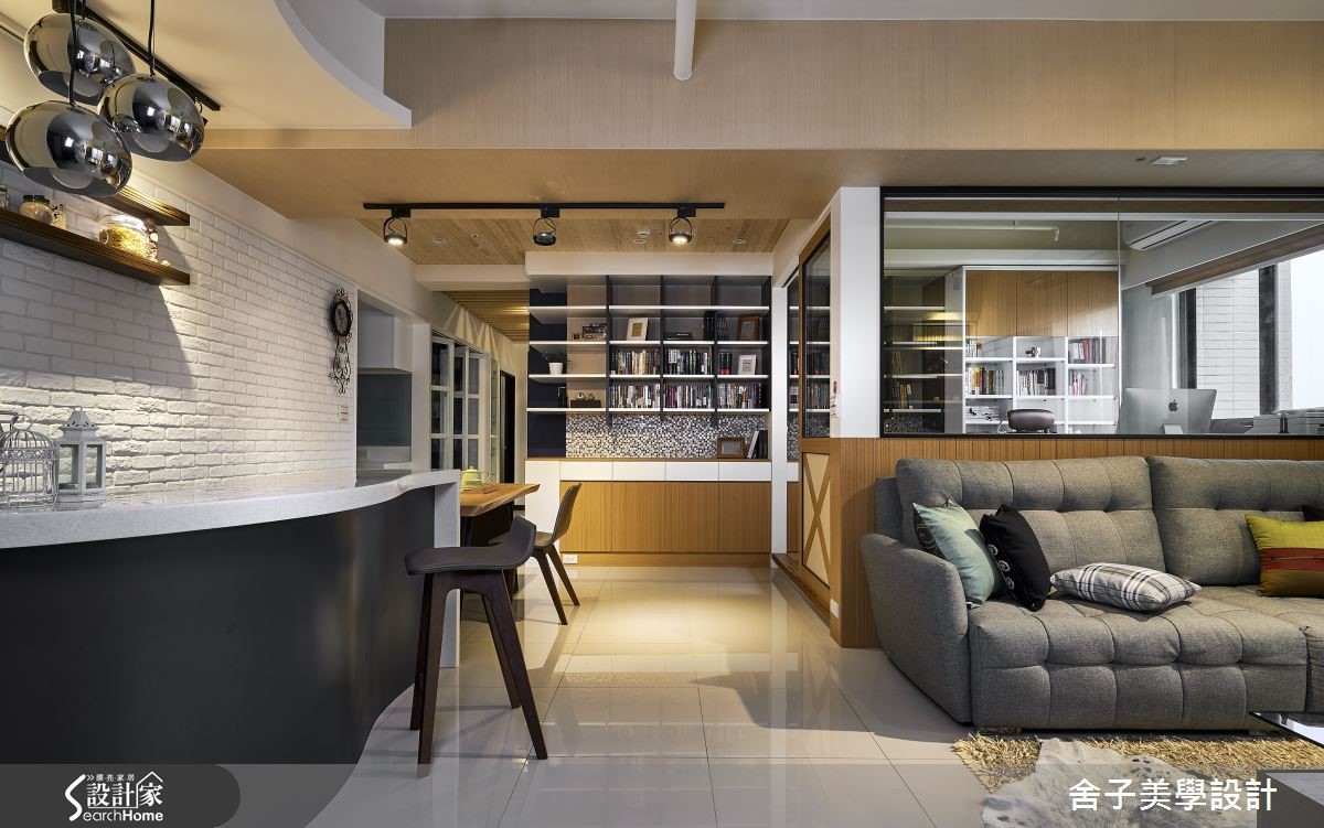 位于河畔的99平方米美式宅,以休闲感作为设计初衷,让楼板呈裸露设计并加入局部天花造型,搭配温润木色及异材质变化,使整体显得活跃生动,让屋主一回到家,即能体验到全然放松。【造型书墙串连空间,成吸睛焦点】走进大门,可见玄关与室内空间铺陈不同地面材质,藉此达到界定领域作用,并规划一道白色屏风,以镂空的虚实手法体现轻盈感。客厅电视墙则结合展示柜,透过材质搭配与适度比例分割,彰显大方生动的墙面表情,同时透过落地窗引入采光风景,注入愉悦的居家氛围。客厅后方安置书房领域,以清玻作为二者隔断,达到领域的独立性与通透感,且于书房配置一面造型书墙,一路延伸至餐厅,不仅做足收纳,更让客厅、餐厅、书房各区巧妙串联。主卧内,则考量到床头上方横亘梁柱,以柜体设计缓解压迫感受,并透过花色墙纸铺贴,营造唯美优雅的意境,同时沿着窗边做出飘窗,给予悠闲放松的私人角落。