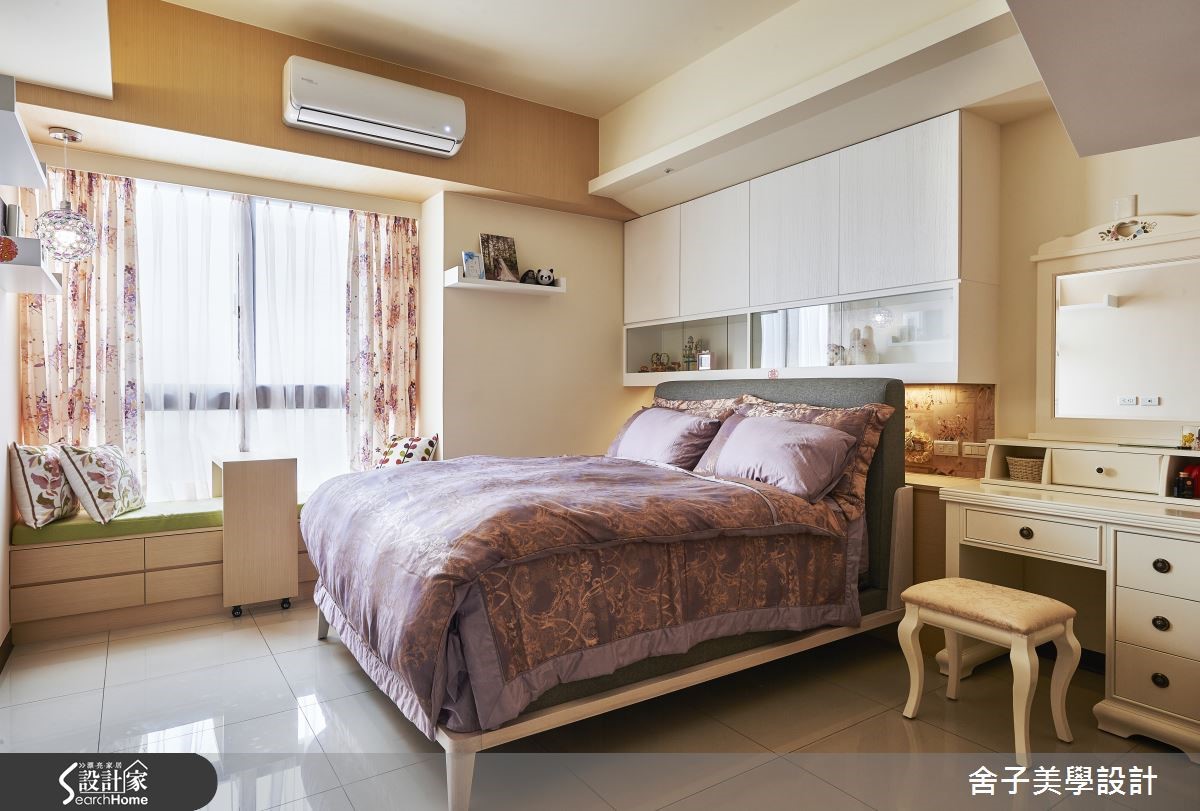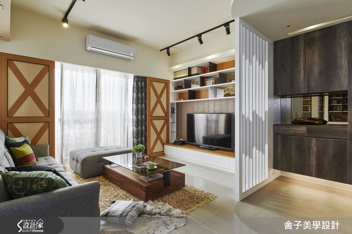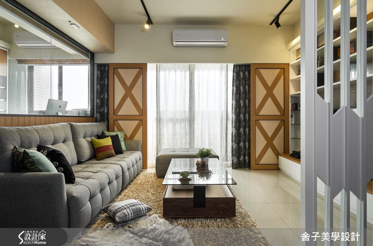 位于河畔的99平方米美式宅,以休闲感作为设计初衷,让楼板呈裸露设计并加入局部天花造型,搭配温润木色及异材质变化,使整体显得活跃生动,让屋主一回到家,即能体验到全然放松。【造型书墙串连空间,成吸睛焦点】走进大门,可见玄关与室内空间铺陈不同地面材质,藉此达到界定领域作用,并规划一道白色屏风,以镂空的虚实手法体现轻盈感。客厅电视墙则结合展示柜,透过材质搭配与适度比例分割,彰显大方生动的墙面表情,同时透过落地窗引入采光风景,注入愉悦的居家氛围。客厅后方安置书房领域,以清玻作为二者隔断,达到领域的独立性与通透感,且于书房配置一面造型书墙,一路延伸至餐厅,不仅做足收纳,更让客厅、餐厅、书房各区巧妙串联。主卧内,则考量到床头上方横亘梁柱,以柜体设计缓解压迫感受,并透过花色墙纸铺贴,营造唯美优雅的意境,同时沿着窗边做出飘窗,给予悠闲放松的私人角落。
