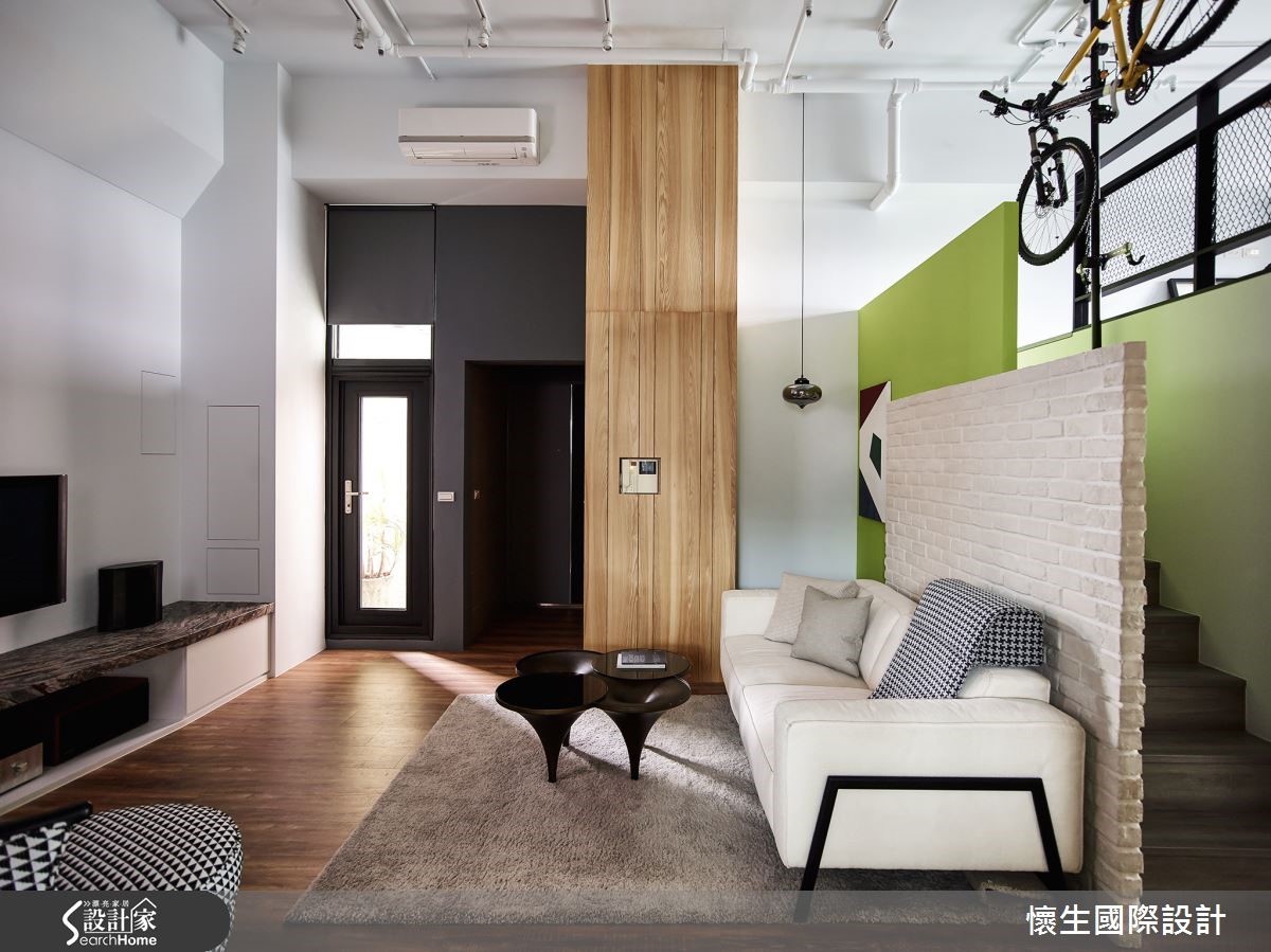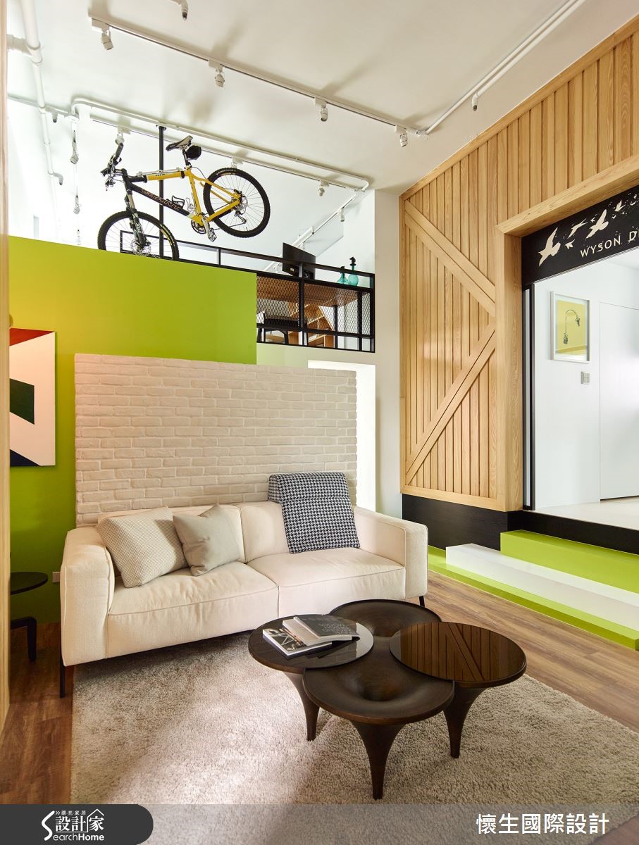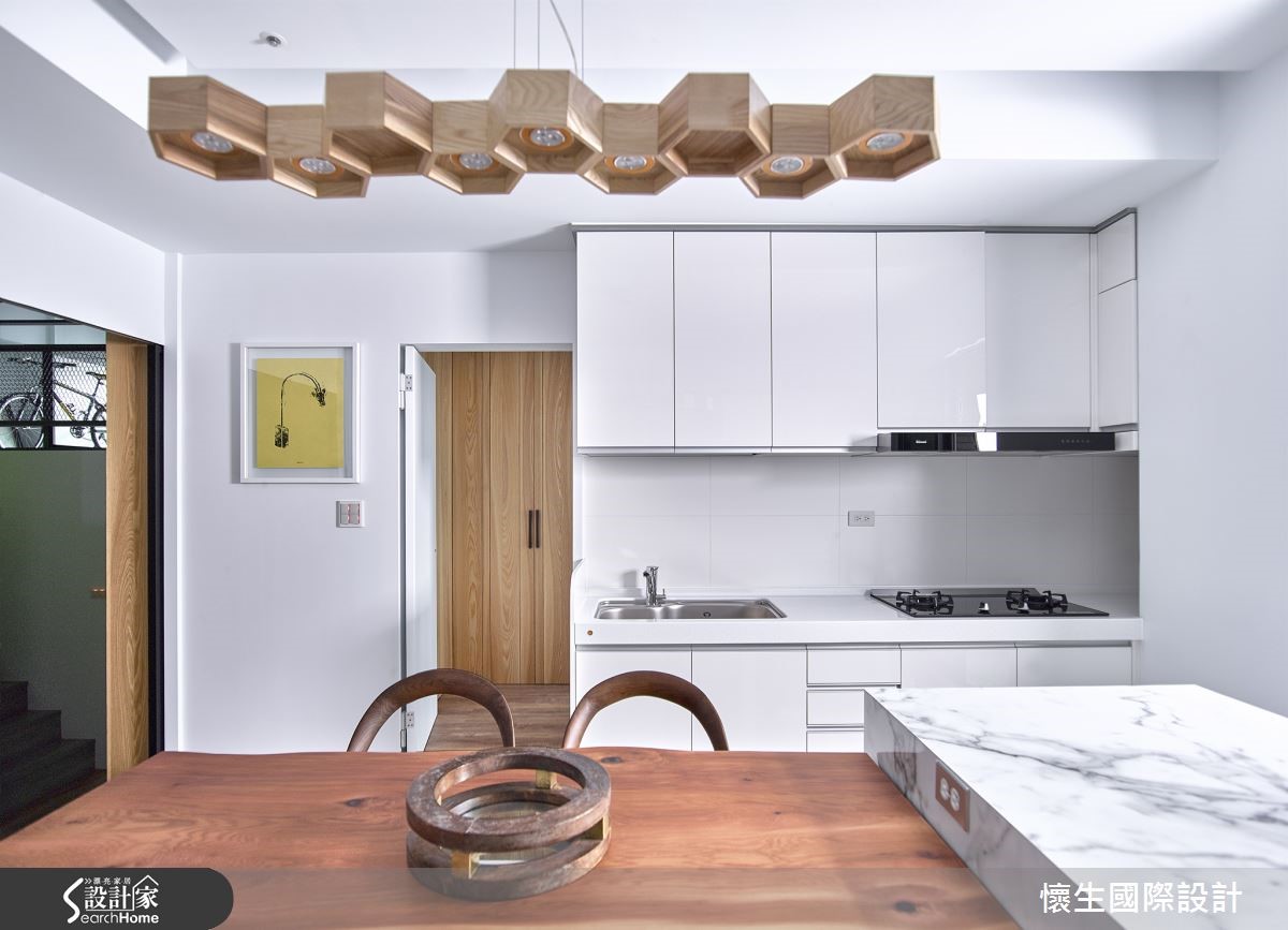 设计师微调本案二手屋原先格局,将132平方米居家的公共区域规划为适合全家人相聚的开放空间,并善用挑高优势设置跃层,使每个空间兼具独处与欢聚的机能性!【玻璃门引光,营造明亮感受】设计师巧妙援引光源,为开放餐厨设置大面积玻璃门片,并于墙面与地板运用大量木质元素,藉由木作与日光营造北欧风的润泽温馨。且更改原先的隔断,除文化石墙外,更加设通往跃层的楼梯,并利用清新苹果绿点缀墙面与餐厨的阶梯,增添童趣。纯白的餐厨空间,透过大理石台面与实木长桌的结合,佐以六角造型灯饰,创造时尚自然的气息。而利用金属圆柱与扩张网,创造粗犷不造作的跃层空间,特殊设计的斜角柜体,兼具展示与收纳功能;一旁的桌椅则提供了舒适的单人阅读空间。
