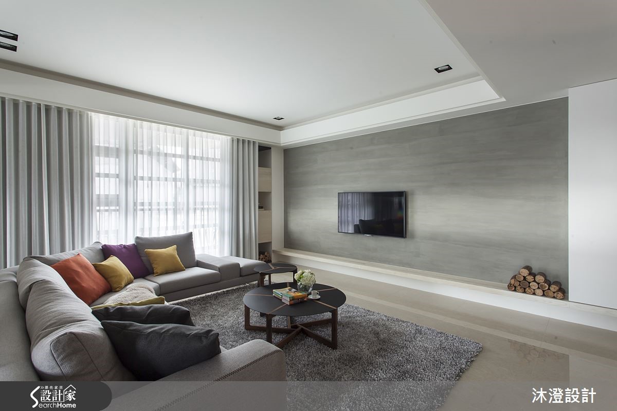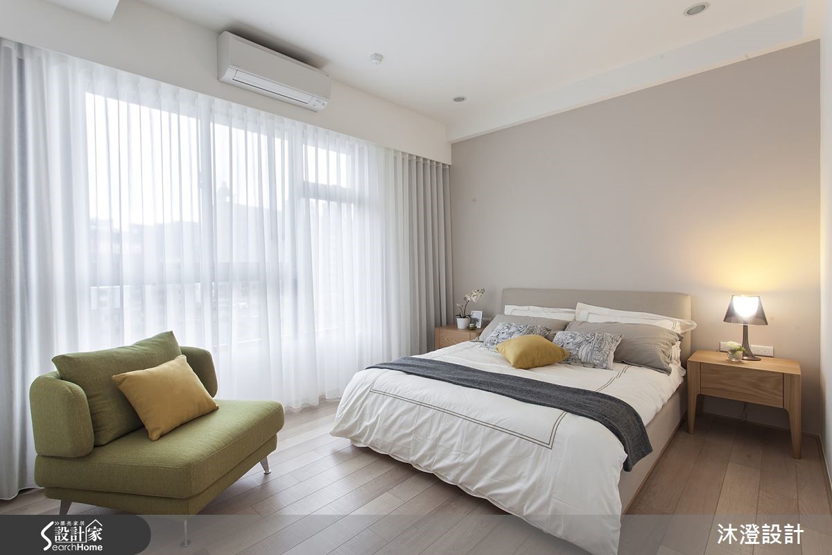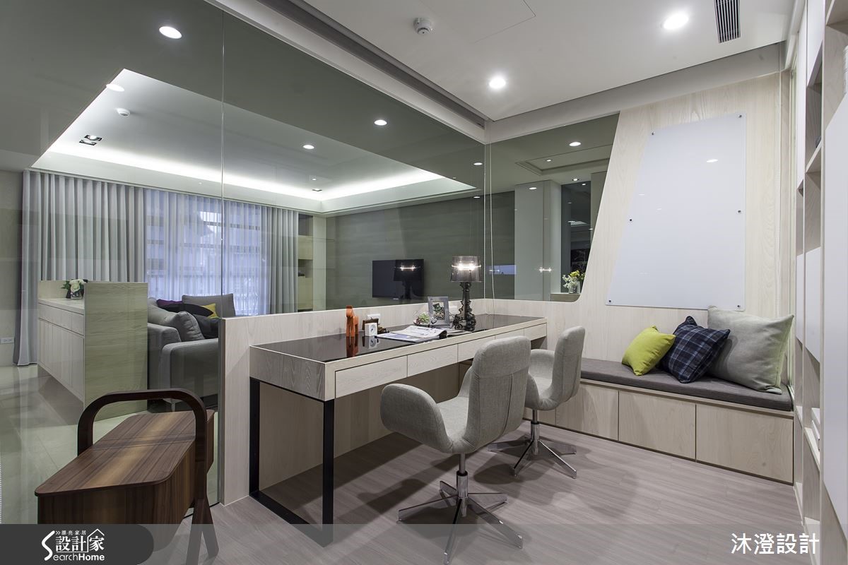 想营造舒适的居家生活,除了美观,当然实用度也要满足居住者的需求!过大的客厅,经过设计师修整后,在公共空间新增一间大书房,并赋予充足的收纳,拥有时尚好品味之余,也有让生活更加舒适的实用机能。【穿透开放书房,丰富空间表情】即使隔出了一间大书房,公共空间仍然感觉相当宽广。玄关处规划一面收纳柜,利用纯白和浅木色调铺饰清爽印象,书房外部延伸穿鞋椅,让出门时更加方便。书房与公共空间以灰玻璃隔断,加上灯光点缀,让空间显得通透而不失隐私性。餐厨区以矮柜界定与客厅的分野,开放式厨房容纳更多生活的可能,可以一边做菜一边和家人聊天,也可以邀请朋友来家中作客,让空间中满溢温暖的美食香气。卧室则以活泼的跳色单品点缀愉悦氛围,并在私密空间设计更衣室,创造更多的收纳效益。
