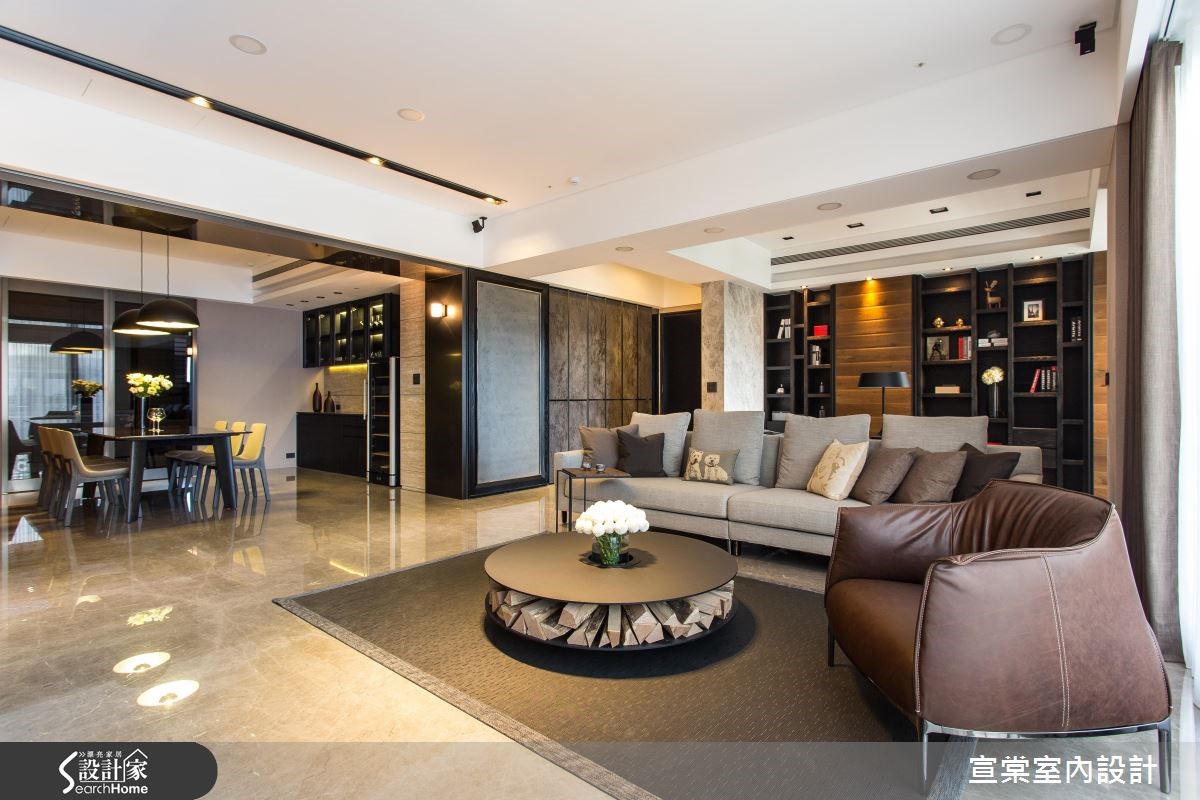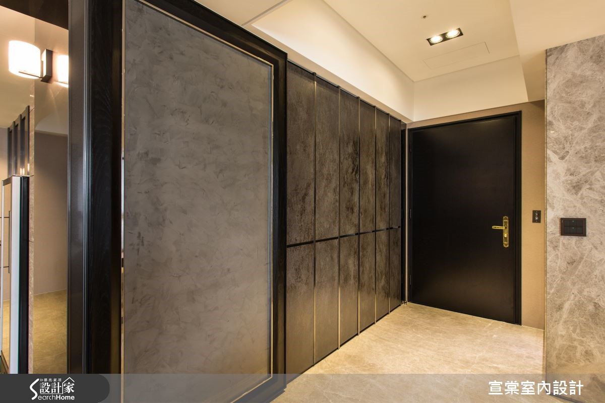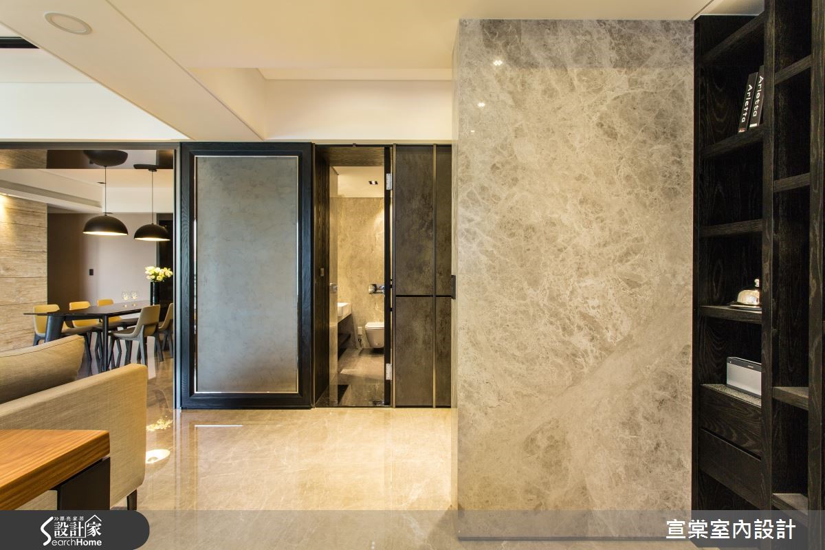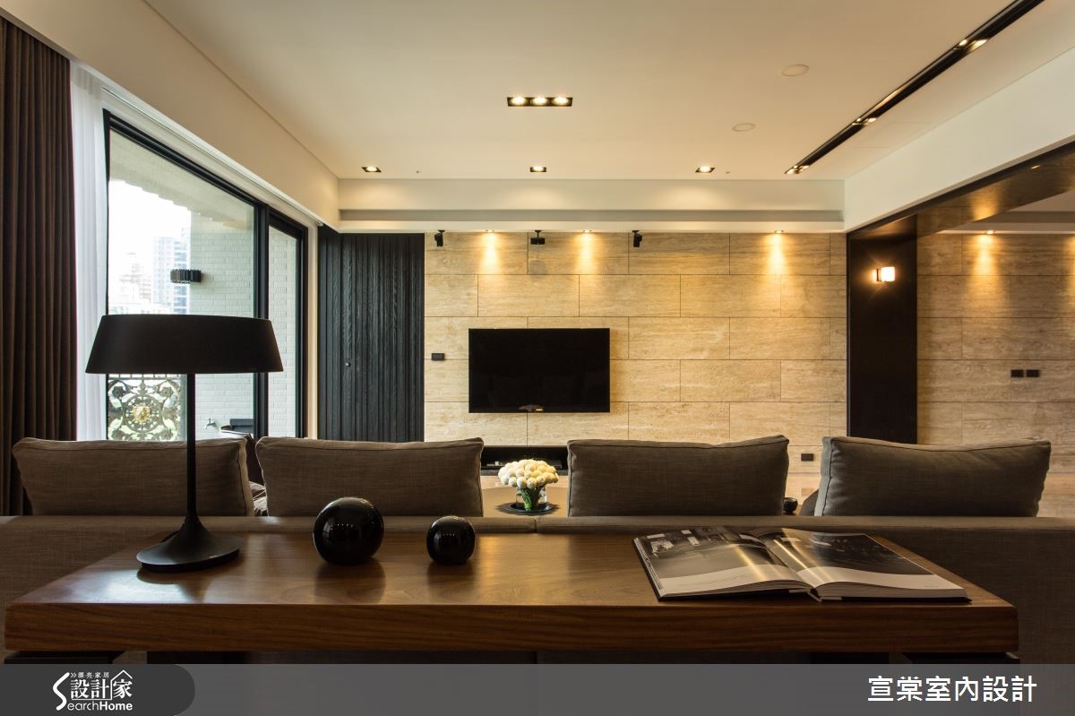 顺应原有的大面积空间,设计师给予大器的居家氛围,运用十字轴线的框架做出隐性界定,妥善安排每个空间位置。并透过细节设计与材质纹理,强调低调奢华的生活质感,强调光影照明,在夜幕低垂时点燃惬意气氛,描绘出充满情感的视觉画面。【全室开放设计,视觉不干扰】设计师规划整面仿铁锈薄砖面鞋柜,一旁连结客卫门片,透过材质延续弱化入口存在感。居宅整体则呈开阔视野,客厅电视墙采用浅色洞石以交丁手法铺陈,并将视听设备收整于下方,创造完整的立面视觉。书房安置于客厅后方,且细心计算沙发高度,让书房也能同享视听娱乐,并配置整面书柜,中央穿插两道木质门片做为隐形开口。餐厅则沿梁柱设置镀钛门斗,同时在墙面延续洞石材质,展现温润质感。主卧地面铺陈木地坪,并透过深色布面铺出床头质感,温暖宜人。