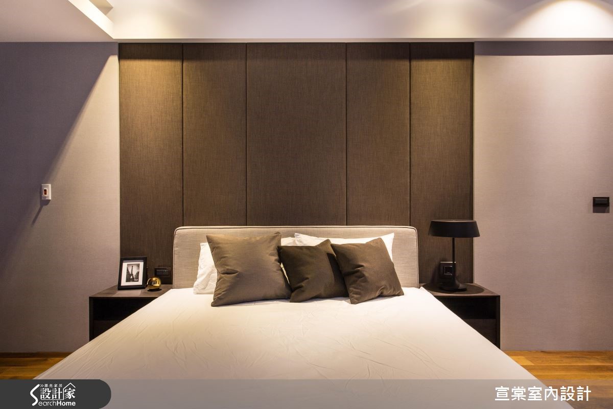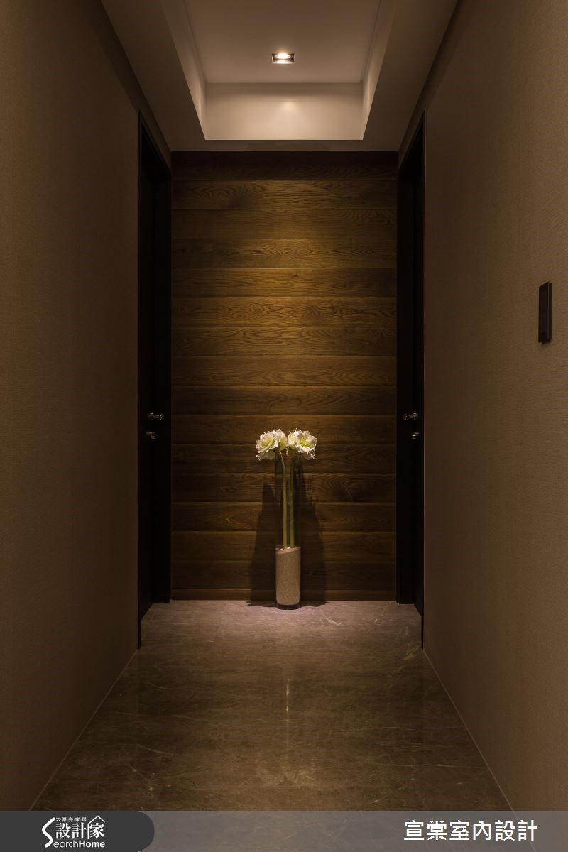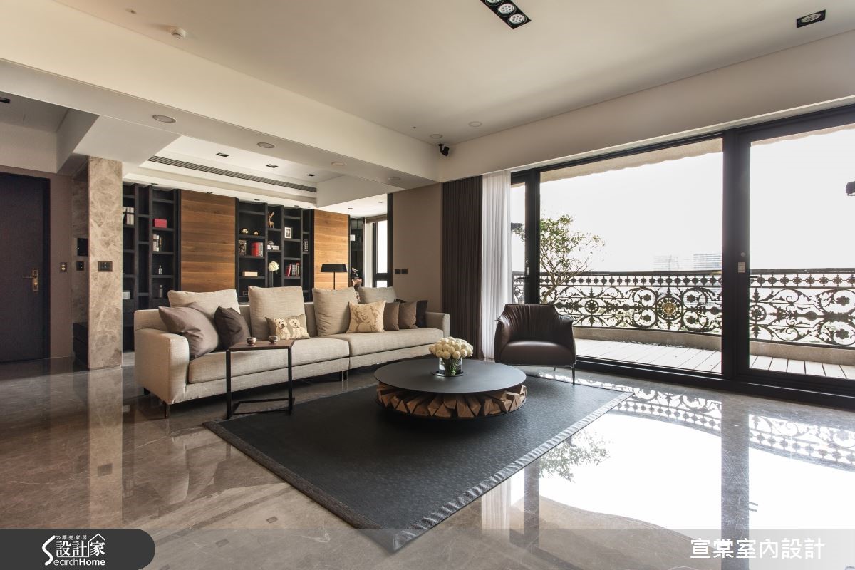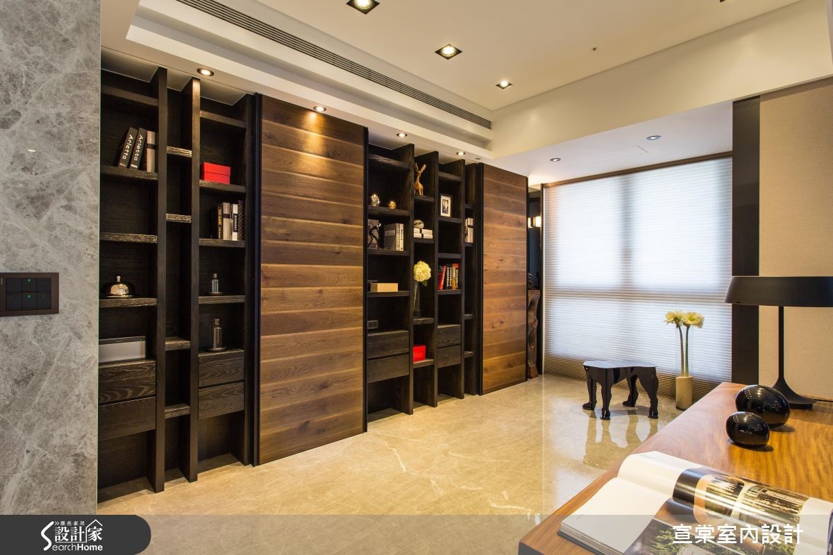 顺应原有的大面积空间,设计师给予大器的居家氛围,运用十字轴线的框架做出隐性界定,妥善安排每个空间位置。并透过细节设计与材质纹理,强调低调奢华的生活质感,强调光影照明,在夜幕低垂时点燃惬意气氛,描绘出充满情感的视觉画面。【全室开放设计,视觉不干扰】设计师规划整面仿铁锈薄砖面鞋柜,一旁连结客卫门片,透过材质延续弱化入口存在感。居宅整体则呈开阔视野,客厅电视墙采用浅色洞石以交丁手法铺陈,并将视听设备收整于下方,创造完整的立面视觉。书房安置于客厅后方,且细心计算沙发高度,让书房也能同享视听娱乐,并配置整面书柜,中央穿插两道木质门片做为隐形开口。餐厅则沿梁柱设置镀钛门斗,同时在墙面延续洞石材质,展现温润质感。主卧地面铺陈木地坪,并透过深色布面铺出床头质感,温暖宜人。