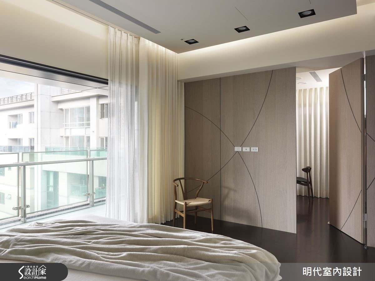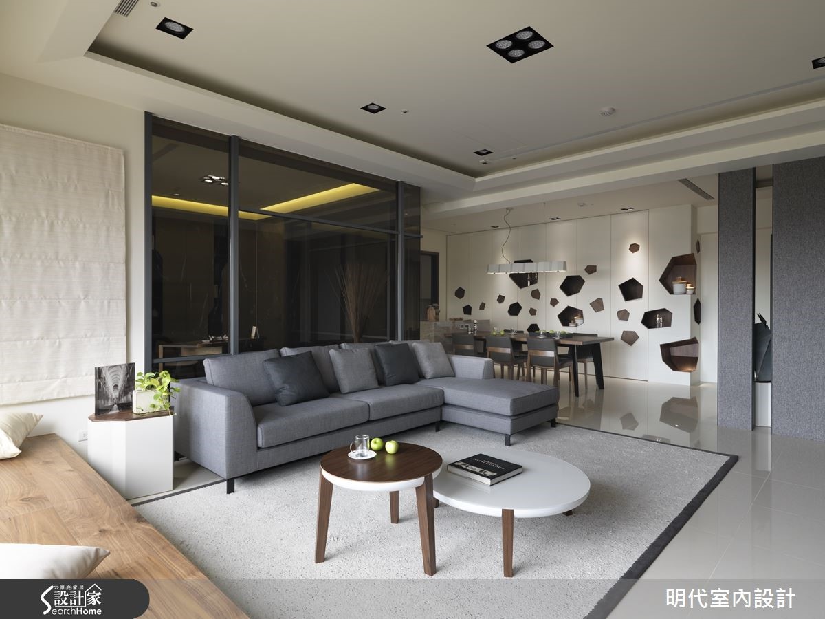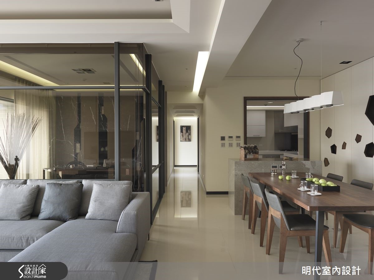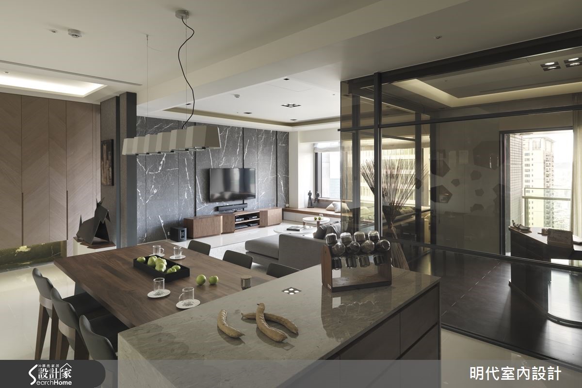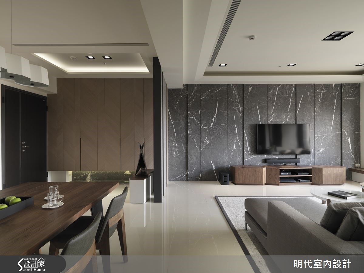 198平方米的現代宅,設計師將此宅名為"夢田",延續字意,將住宅化為居住者的夢想園地,把屋主兒時夢想結合生活實用意義,演出獨特的生活風貌。【拆解隔断 让采光无阻碍】 拆解客厅后的一间居室,将之改为半通透隔断,使书房与餐厅、客厅之间的采光、视野无阻,增添场域之间的对话与交流,同时采以复古面大理石建构电视墙,再搭配胡桃木皮妆点柜面,挹注生活里的天然风韵。【美感及机能兼具的餐厨空间】餐厅墙面将则巧妙结合开放展示柜,锐角元素融合展示机能,以错落散布、大小不一的多边角结构,成就美感及机能兼具的立面表情;主卧内,则创造有别于公领域的线条架构,在与更衣室的隔间立面上勾勒曲线,透过曲线设计柔化生活氛围!