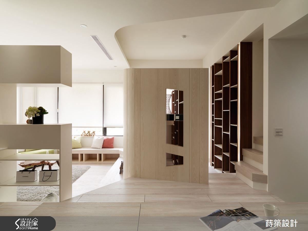 打破框架限制,激荡出饶富趣味的空厅,不仅地板有高低,连客厅都不是呆板的方正。设计师以橡木染白的电视墙做出圆弧造形,可以当座椅的窗台一路连接到通往阁楼书房的阶梯,下方都有照明,既营造氛围,又能兼顾行走安全。