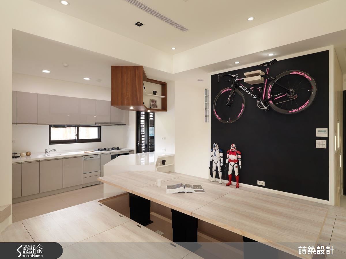 其次,餐厅主墙则以黑板磁性漆粉刷,架上男主人的爱车,不仅深具文青气息,小孩子尽情涂鸦也没问题。