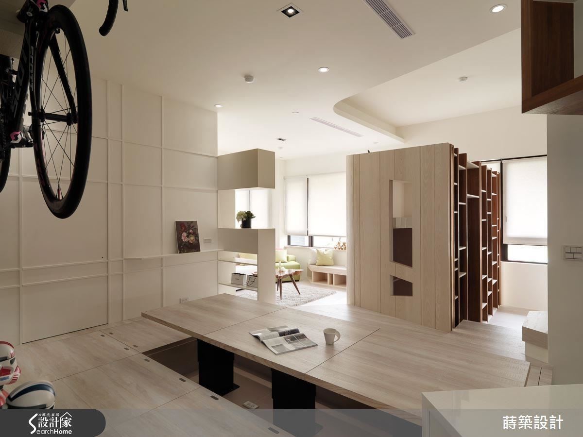 餐厅采用电动升降桌当餐桌,而且刻意分成三部分,可以依人数随时调整要升降的范围,而且40厘米的深度坐起来很舒适;尤其特别的是,架高的地板下都是收纳,采上掀式门片,收纳量相当惊人。