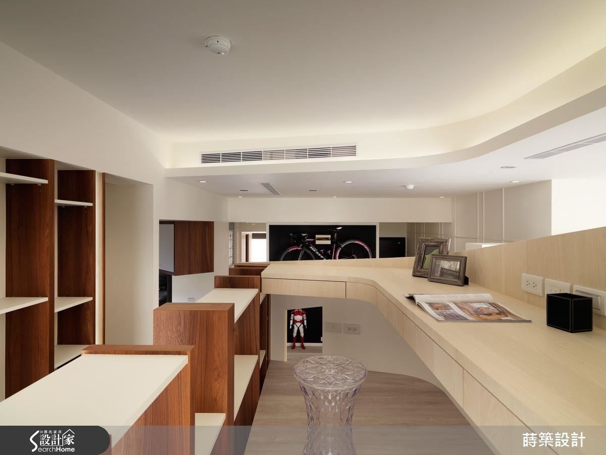 男主人需要的书房就在半空中!将原本与客厅同侧的两间小房间之一做出圆弧形的储藏室,上方就做出开放书房,连天花板及书桌都顺势做出弧形,而且壁面向着厨房的那边做出斜面切角,目的是为了家人互动。