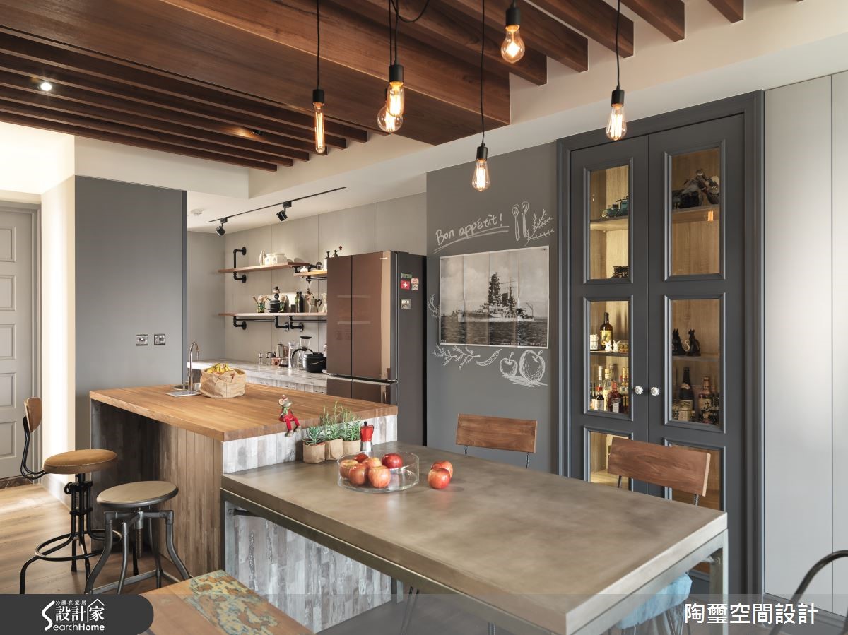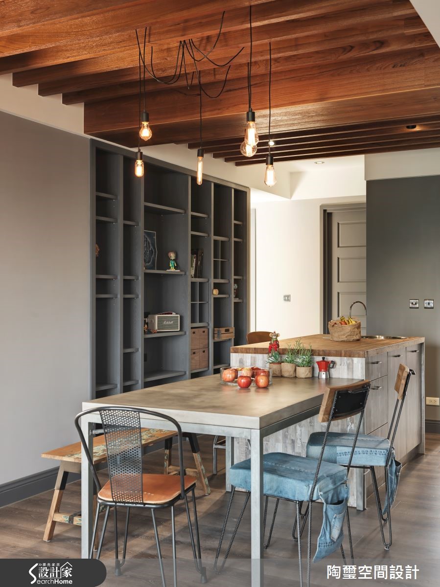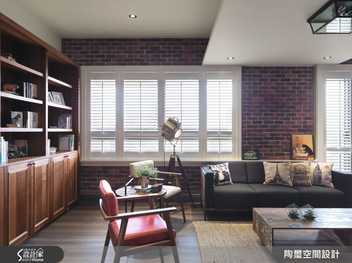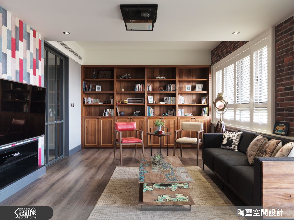 居住空间给予Loft风格定调,并将原先无玄关的格局予以界定,避免入门直见客厅,使室内外空间有所区隔,此外更融入红、蓝等高明度色调,构筑缤纷愉悦的生活氛围,快跟着小编一起走进来看看吧!【自然与丰富的居家风貌】玄关采以艺术挂画与仿旧家具堆砌,搭配灯光聚焦妆点,呈现充满复古格调的印象;客厅则加入红砖元素铺述墙面,与天然木地板相互映衬,传递朴实的视觉之美,并点缀具风格图纹的软件单品,挹注人文美学涵养。两面相对而立的书墙,在木质与深蓝的对话之中,罗列展示藏书珍品,昭告屋主的生活品味,电视墙则延续红与蓝配色,做出错色拼接处理,丰富墙面表情;转折进入餐厨场域,将中岛及餐桌合而为一,延伸台面的使用尺度。并于餐厅区的墙面妆点随性涂鸭、或让酒柜间接型塑唯美的展示功能,打造随兴不拘泥的用餐氛围!卫浴墙面铺叙深浅具层次的复古砖面,创造仿旧美感,并以疗愈的浅绿定色,带来放松身心的纾压效果!