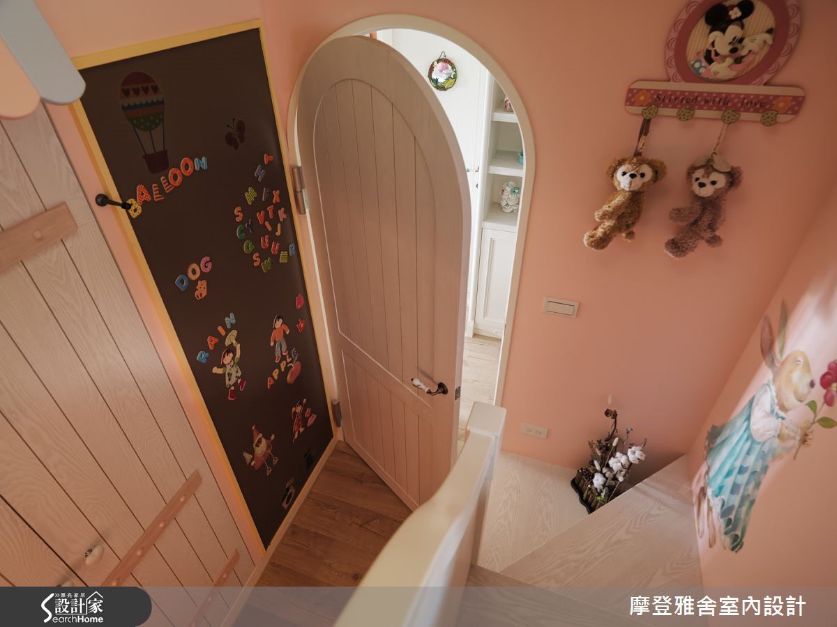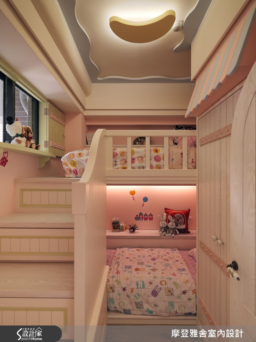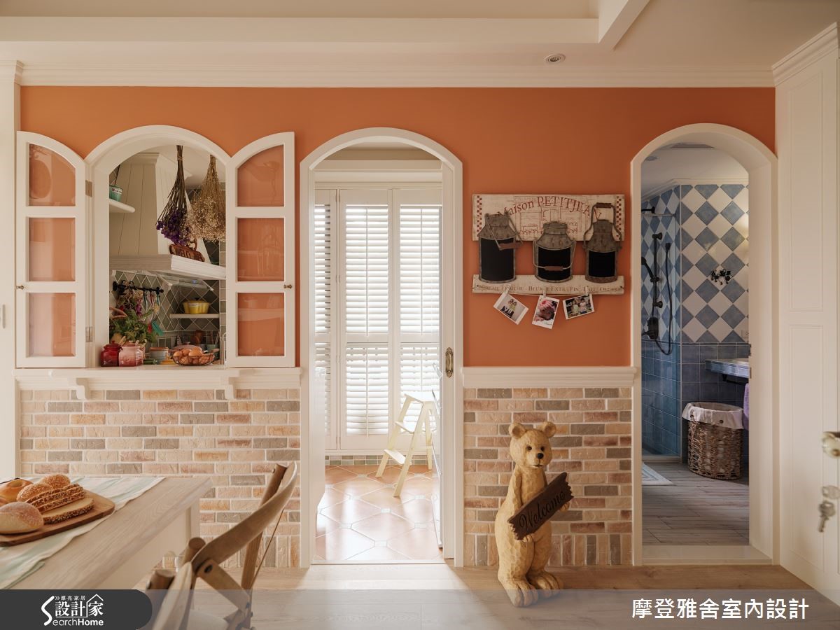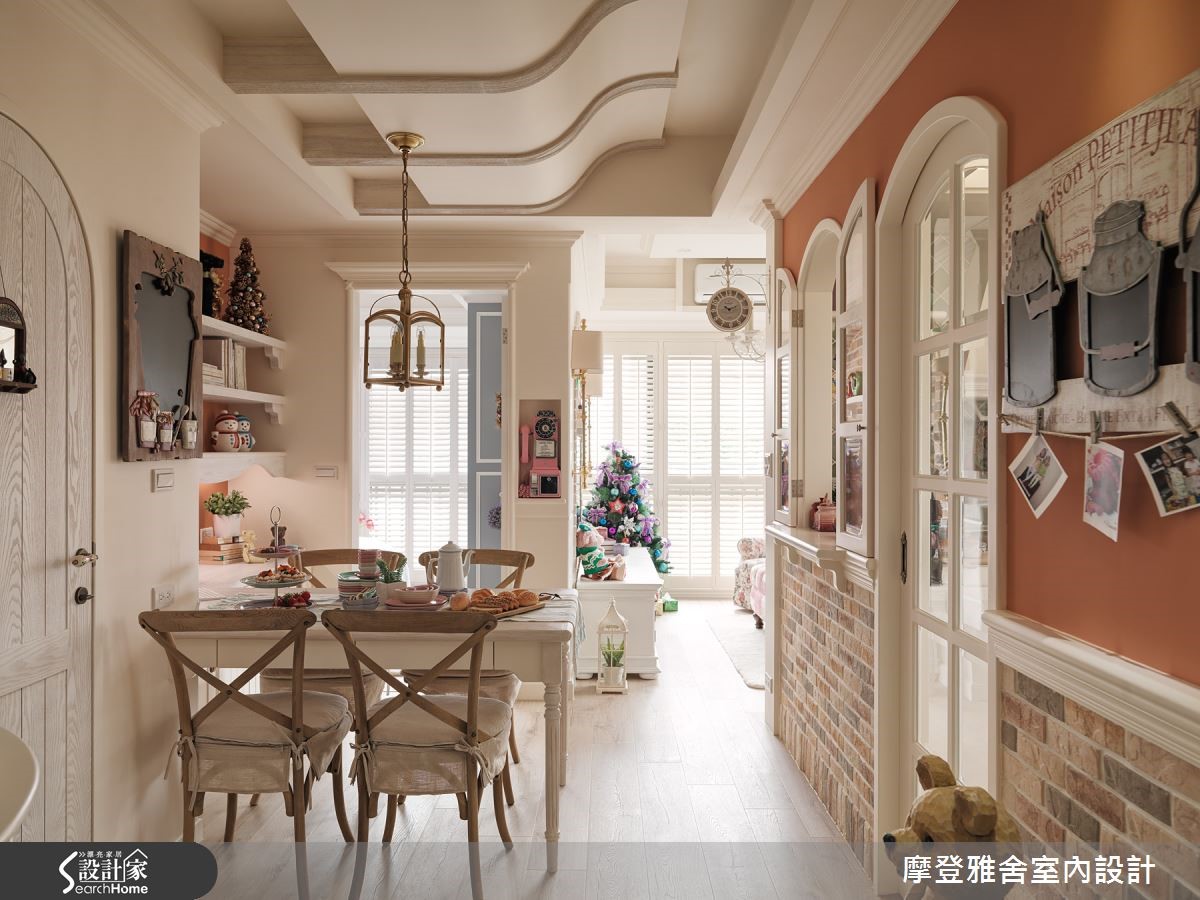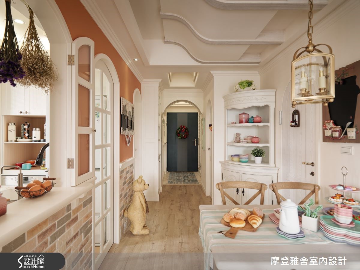 爱家的男主人,为了妻子及双胞胎女儿,找来设计师合作,不仅将一字型厨房改造为内外区隔的L型厨房,满足爱妻的料理梦,同时也为女儿们创造独享的玩耍园地,快跟着小编一起去看看吧!【多层次设计,展现浓郁乡村风】空间内,将三室改成两室,利用电视墙区隔主卧与客厅,使生活中的场域位置各得其所;客厅采以白色作为基调,搭配粉紫色妆点,融入多层次线板、文化石壁炉电视墙、双面钟、浪漫的烛台灯等,展现浓郁的乡村风格。【线条与色彩,释放活泼生活氛围】走进餐厅,则可见曲线巧妙修饰的天花板造型,且在减轻压迫感的同时,也增添线条趣味,同时刻意打开拱型室内格窗,串联餐厨场域,且经由饱满的橘色替墙面定调,释放秀色可餐的生活氛围。【客制化寝卧,挥洒空间创意】主卧则导引良好采光,以英国Wedgwood瓷器色彩作为色调灵感,融合法式线板,营造优雅品味!小孩房采取高低床规划,天花加入星星、月亮造型灯饰,设计可尽情挥洒创意的黑板墙,让寝卧突破制式印象,彻底变身梦幻童话屋!