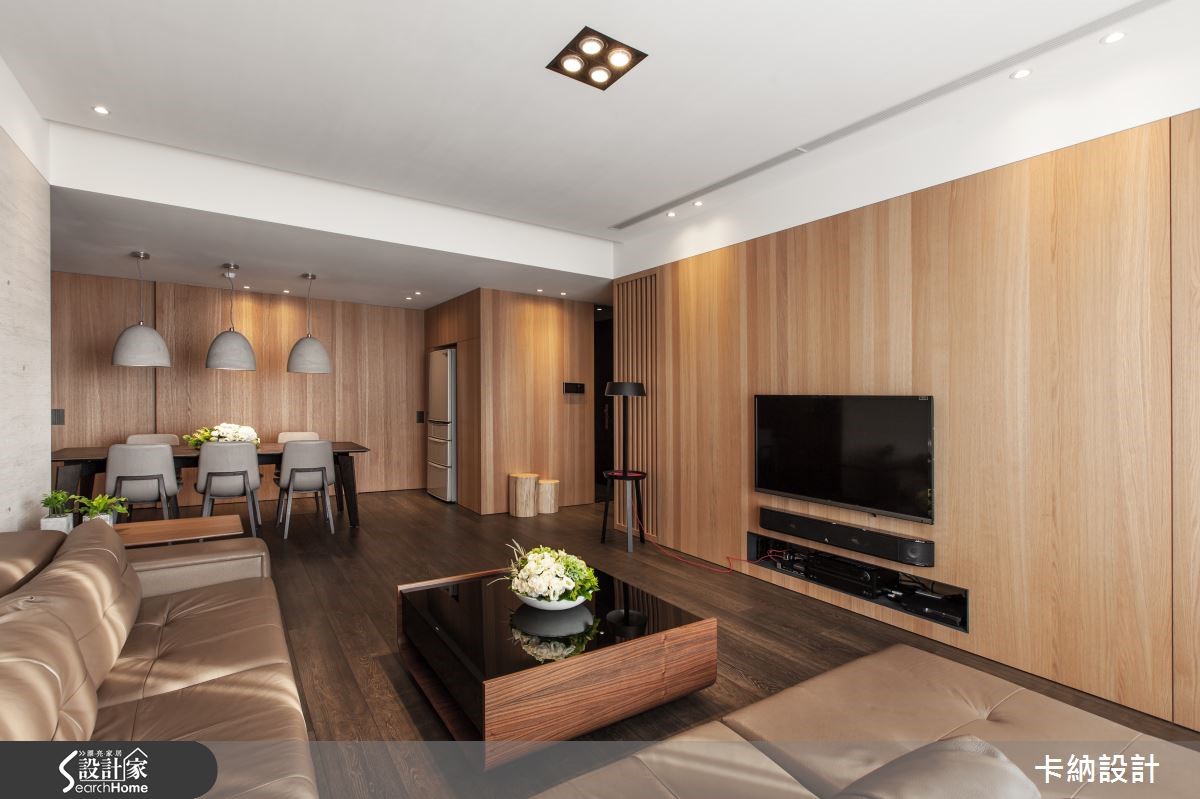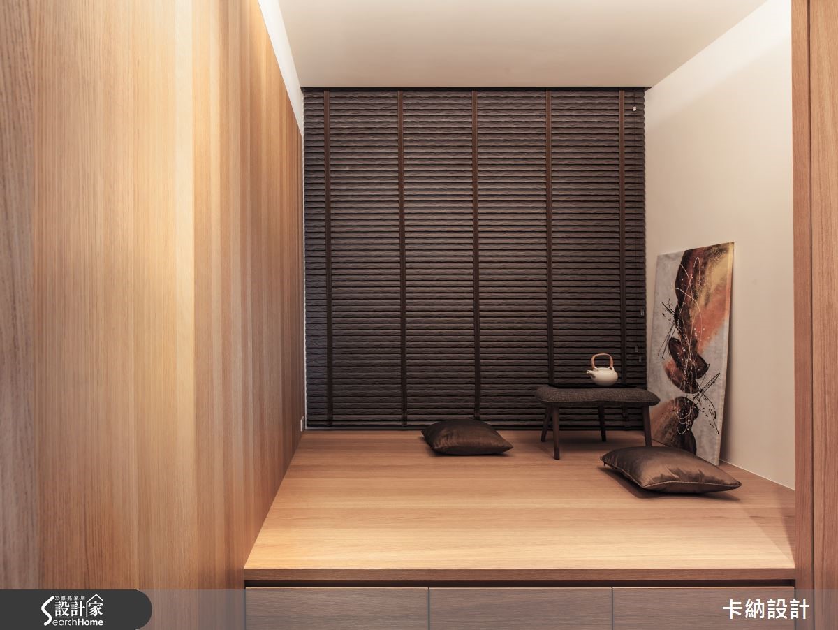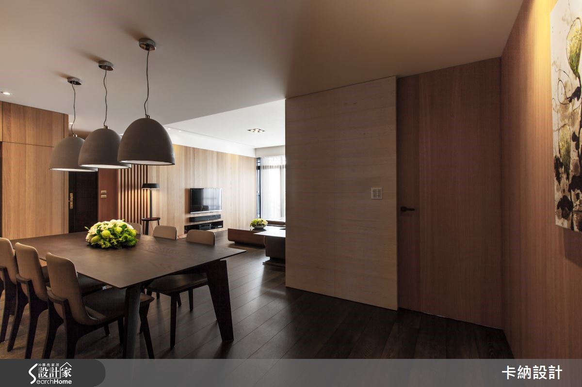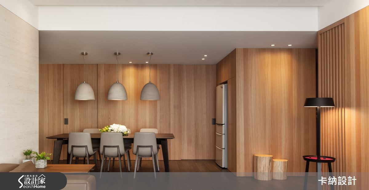 设计师在148.8平方米的住宅中巧妙分配6口的生活空间,让三代同堂的日常时光显得宽敞舒适。因此将重点放在公领域规划,也需解决三代同堂的大量收纳问题。 【直线木纹,拉高空间感受】设计师以扩容为主要设计轴心,注入大量木元素,为开放式空间提升视觉温度。以色调轻浅、带着修长纹路的木质饰面,为客、餐厅墙面增添温润感受,成为纯白天花与深棕地坪的缓冲色调;更利用白色石材平衡色调浓重的大地色系,进一步注入自然清新的气息。原先餐厅格局较不稳定,因此设计师以开放设计,让用餐空间拥有宽敞动线,并将大型电器巧妙纳入隔断,抹除视觉杂乱的可能性,更提升收纳量。为符合长辈的生活习性,设计师特意打造了和室空间,地坪下方更可作充足收纳。