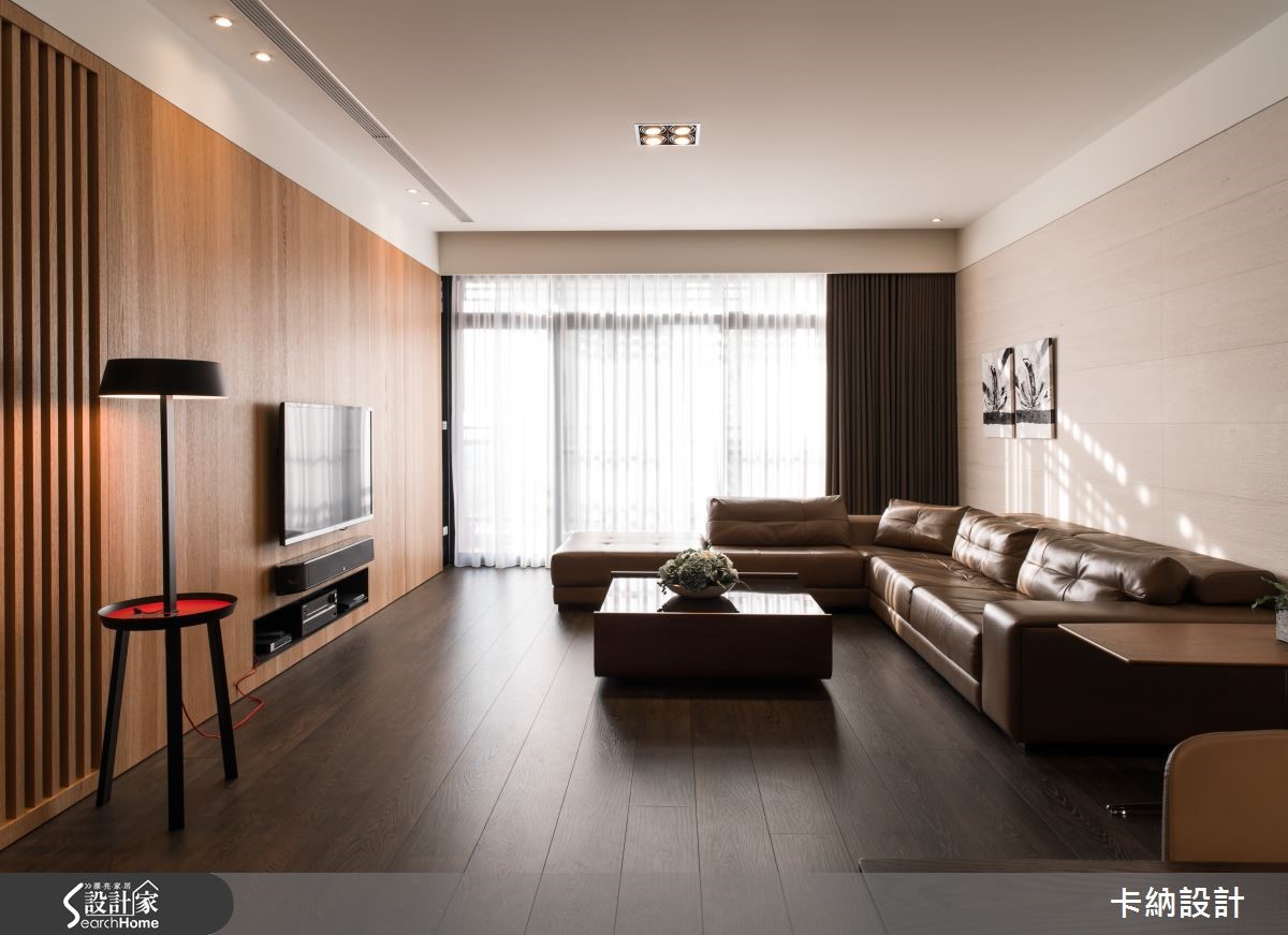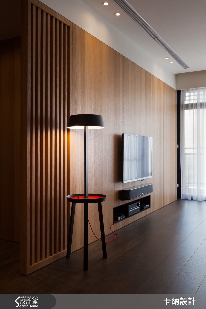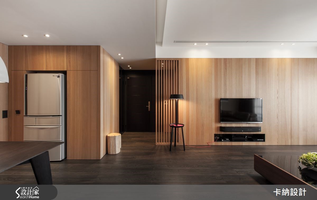 设计师在148.8平方米的住宅中巧妙分配6口的生活空间,让三代同堂的日常时光显得宽敞舒适。因此将重点放在公领域规划,也需解决三代同堂的大量收纳问题。 【直线木纹,拉高空间感受】设计师以扩容为主要设计轴心,注入大量木元素,为开放式空间提升视觉温度。以色调轻浅、带着修长纹路的木质饰面,为客、餐厅墙面增添温润感受,成为纯白天花与深棕地坪的缓冲色调;更利用白色石材平衡色调浓重的大地色系,进一步注入自然清新的气息。原先餐厅格局较不稳定,因此设计师以开放设计,让用餐空间拥有宽敞动线,并将大型电器巧妙纳入隔断,抹除视觉杂乱的可能性,更提升收纳量。为符合长辈的生活习性,设计师特意打造了和室空间,地坪下方更可作充足收纳。
