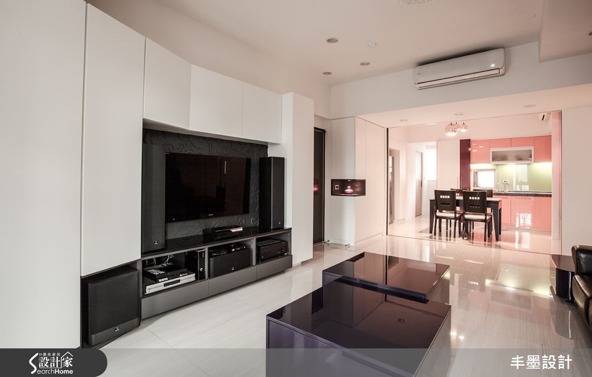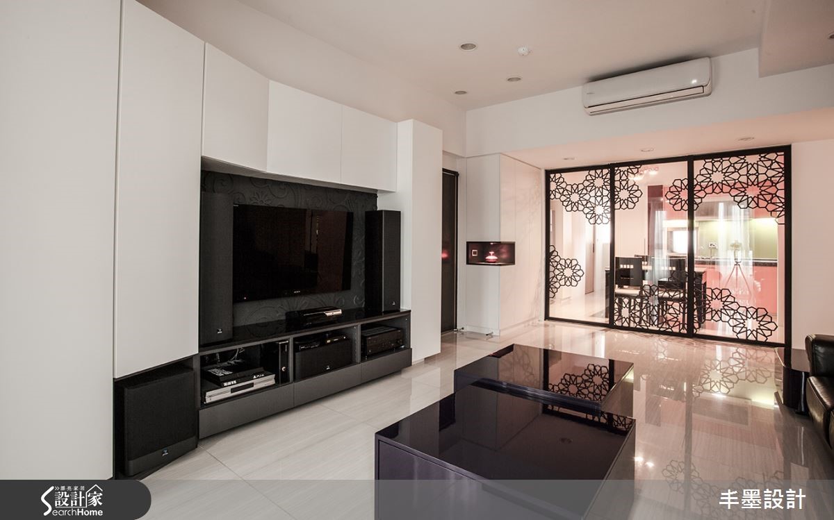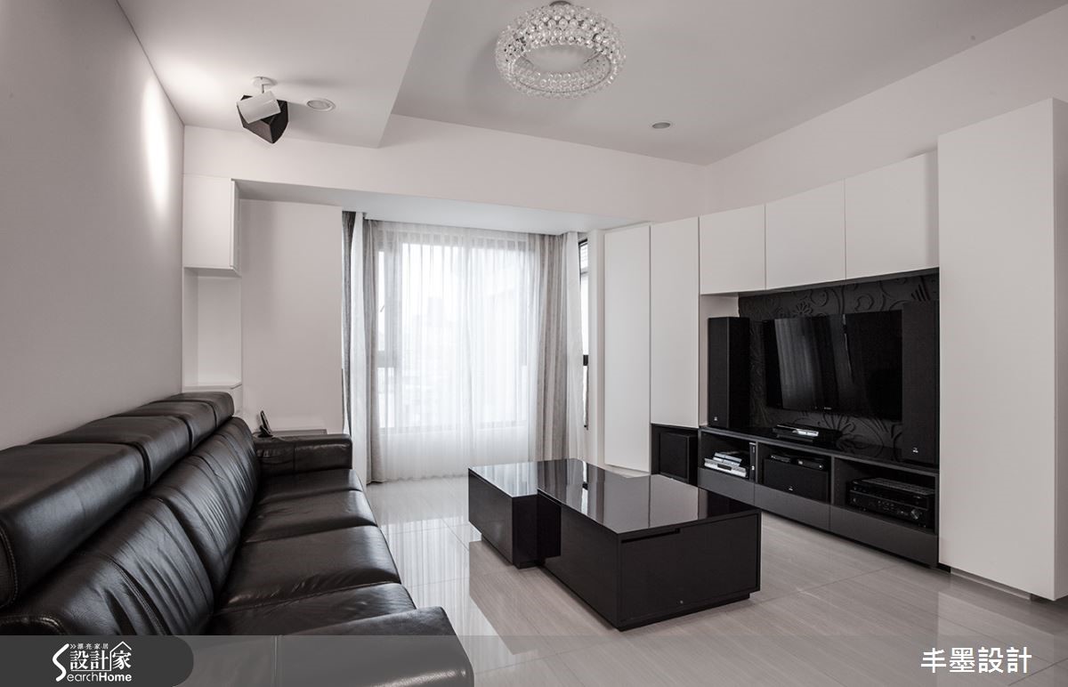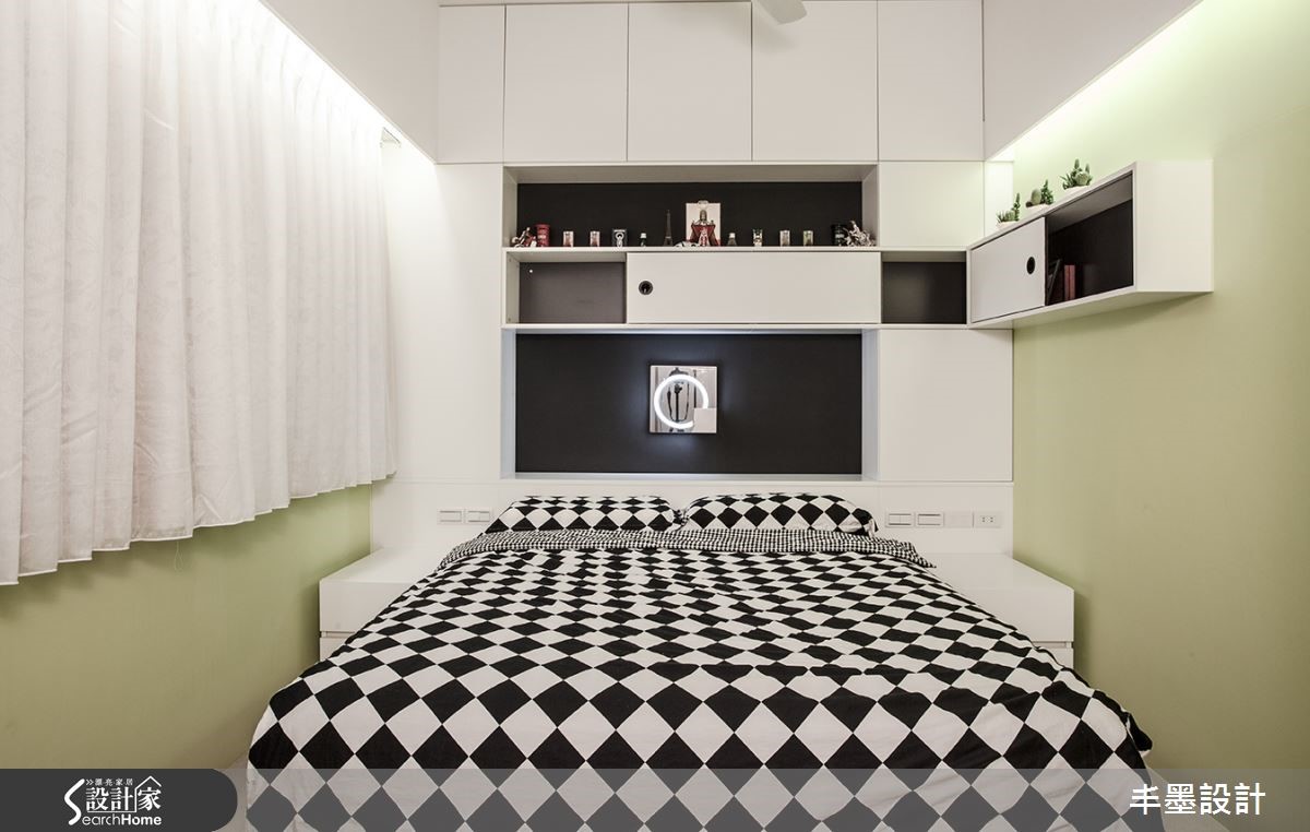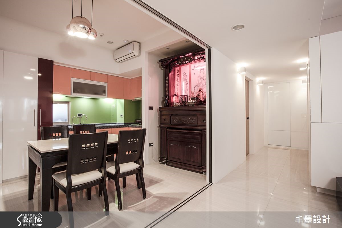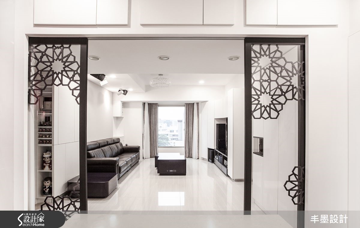 本案整体以白色铺底,局部点缀黑色,呈现色调对比的美感,并让空间感自客厅延伸至餐厅、厨房,给予格局上的层次铺排,让家释放简约魅力。透过线条框架,轻盈地将客餐厅做出衔接,构成美好生活画面。【厨房跳色,空间感年轻好几岁】客厅采用对比强烈的黑白色系妆点,透过简单风格呈现,予人理性的生活氛围,并于电视墙融入特殊造型折线,结合收纳及展示机能,搭衬空间中的利落块体,呈现现代雕塑意象。客、餐厅之间则配置雕花玻璃隔断推拉门,隔绝油烟也促进区域间的采光交流。将神龛隐藏在餐厅一角,并选配餐桌椅进行色调统合,使神龛不致突兀。而厨具设备则多跳色,展现缤纷异趣。卧房沿袭公领域的经典黑白,于床头规划柜体,满足机能并暗示空间层次,墙面则挥洒大片淡绿色,挹注几分清新,呈现出既年轻又摩登的生活主题。