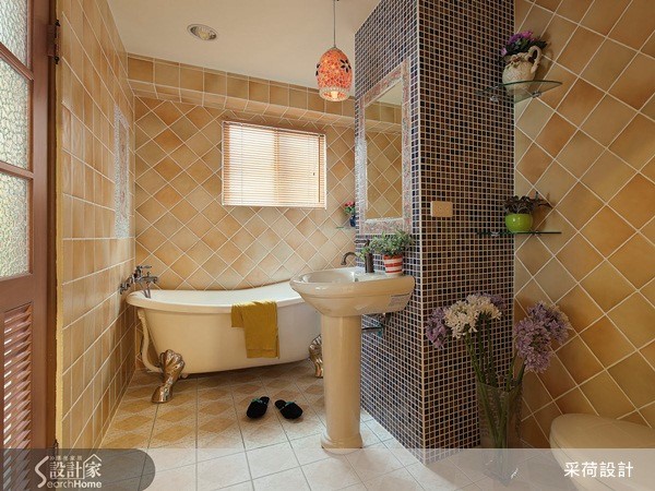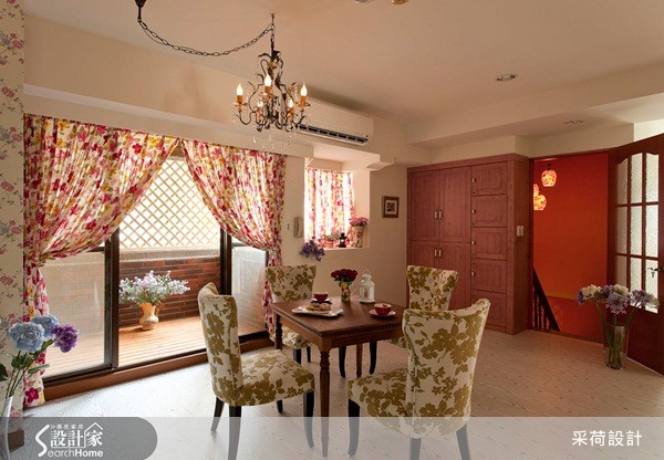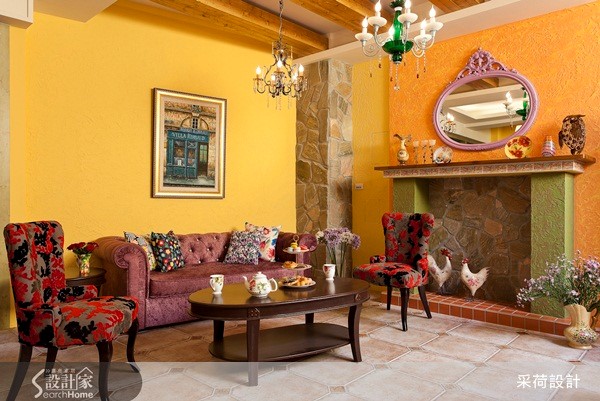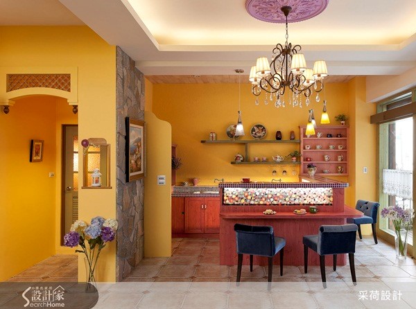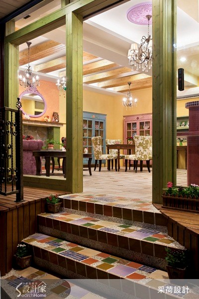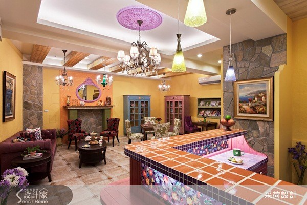 83平二手房中的原先地板、墙壁与管线都已老旧不堪使用,经由设计师重新改善建物机能后,藉由明亮愉悦的色彩主题,搭配家具家饰,营造出令人身心放松的乡村风复合餐厅。【暖黄搭配桃红,造愉悦用餐氛围】餐厅入口采以草绿色漆木框结合清玻璃打造而成,搭配复古砖拼贴的手工台阶,开启浓郁的乡村风况味;一楼的餐厅,区分为轻食吧台区、座位区与盥洗区,以暖黄作为空间主调,让人走进空间,即可立即享受甜蜜愉悦的视觉感受。座位区特别安排壁炉打造吸睛焦点,与大量天然石材构成田园氛围,加上水晶灯饰点亮,构筑出一幅视觉上的美感飨宴。轻食吧台采用粉红色喷漆木作材质,且规划台面架高设计,使工作流理台得以隐身其后,兼具实用与美感。二楼则作为SPA会馆使用,延续整体的甜美乡村调性,以造型优雅的水晶灯饰妆点空间,搭衬窗帘、抱枕等碎花图腾,透过自然花卉的设计,营造令人身心放松的纾压氛围。