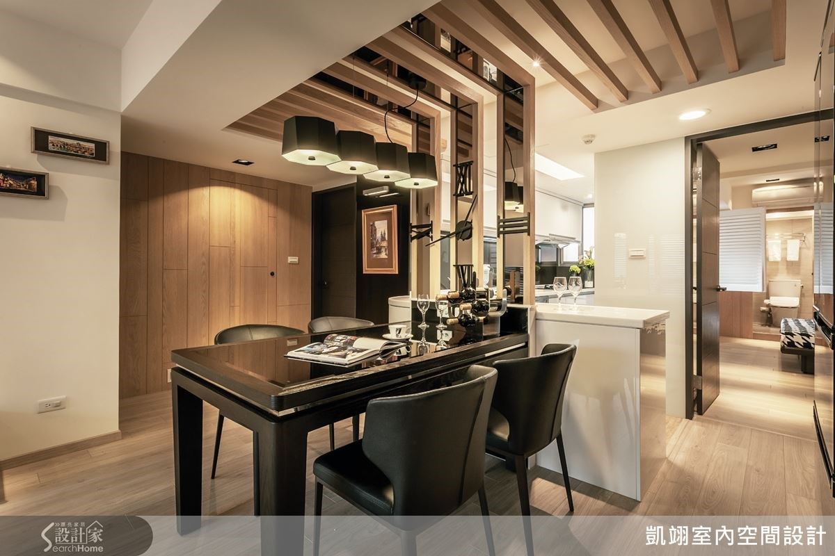 卸除厨房局部墙后,并将餐厅移至厨房和客厅之间,同时还注入了转角吧檯,不仅让机能满满,打通后的空间也能让光线渗透入室。这一带有横樑经过,设计师经由茶镜、木格栅、挂鐘的修饰后,化解掉压迫感,成为一家人最爱伫足的区域。