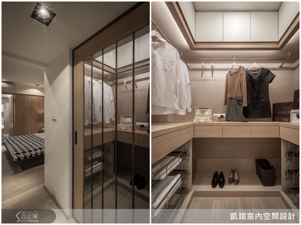 整合主卧与一旁的空间并改为更衣间后,让卧室的机能更加的完整,使用上也更便利。在更衣室部分同样也是做足收纳柜体满足置物需求,此外还辅以拉门设计,既可以半开放也能完整闭阖,可随使用方式做调整。