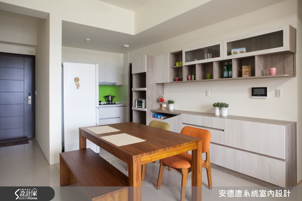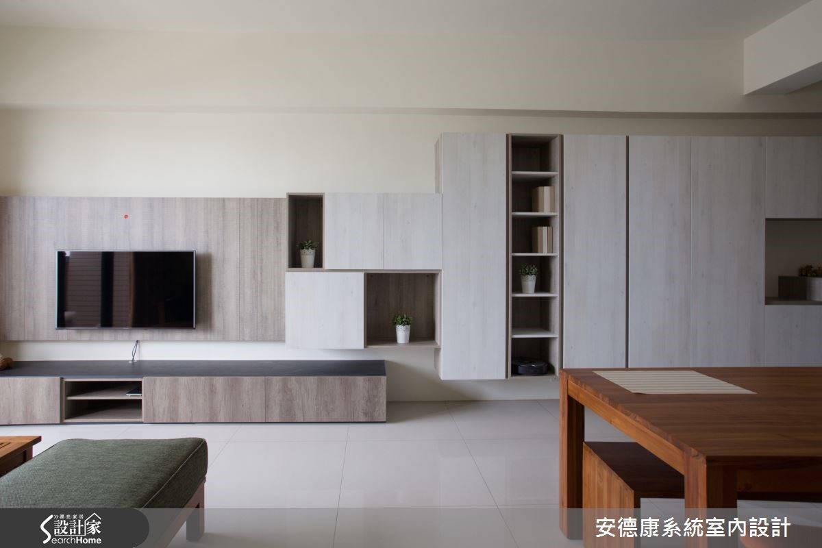 在有限预算之内,为了达成屋主期待,设计师集中在扩充收纳机能上,加入系统柜满足需求,也兼具视觉的美感变化。透过合理的功能分配和简约设计,让空间更舒适。快跟着小编一起走进来看看吧。【机能家具,空间使用更有弹性】全室利用系统柜完成屋主的收纳需求。从玄关起始,即配置悬空柜体做出延伸,一路延续至电视墙,透过材质与造型变化,使视觉更轻盈活泼。并在简约利落的空间内,陈列清新柚木家具,带出实木的古朴质感。餐厨领域则延续系统柜配置,将柜体收整于墙、维持不凌乱的整齐观感。搭配原木餐桌椅,型塑温柔和谐的氛圍。同时规画出和室,架高地板配置升降收纳桌,可兼具客房、储物室或麻将间等多种用途,让空间可依照使用需求做出弹性变化。