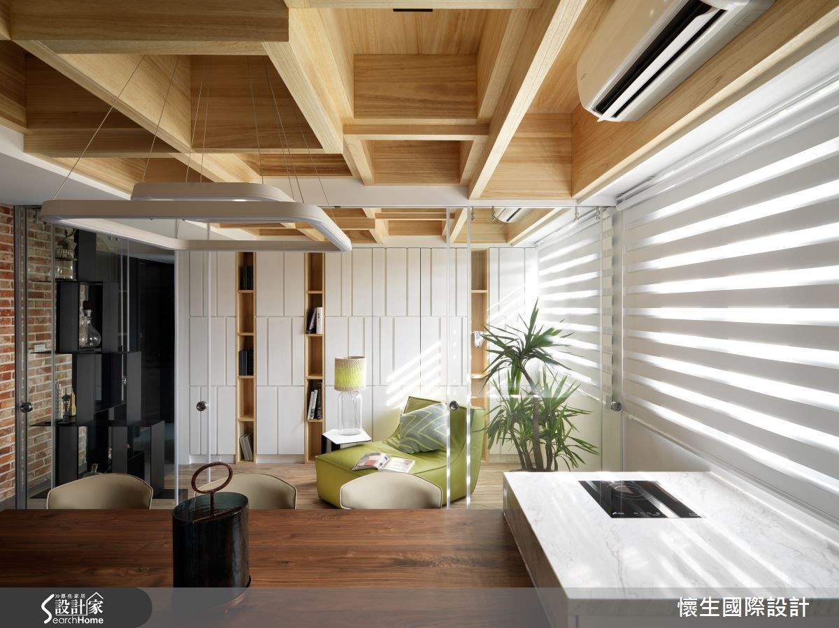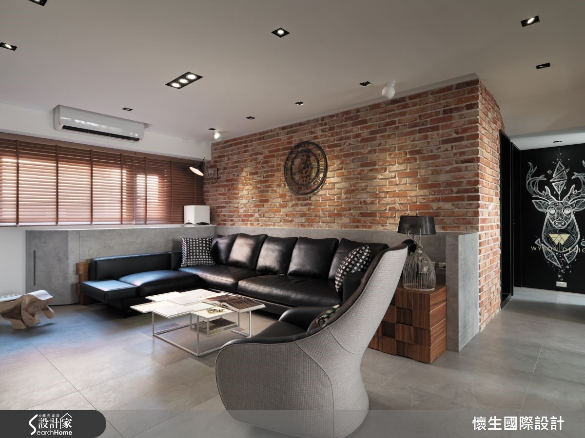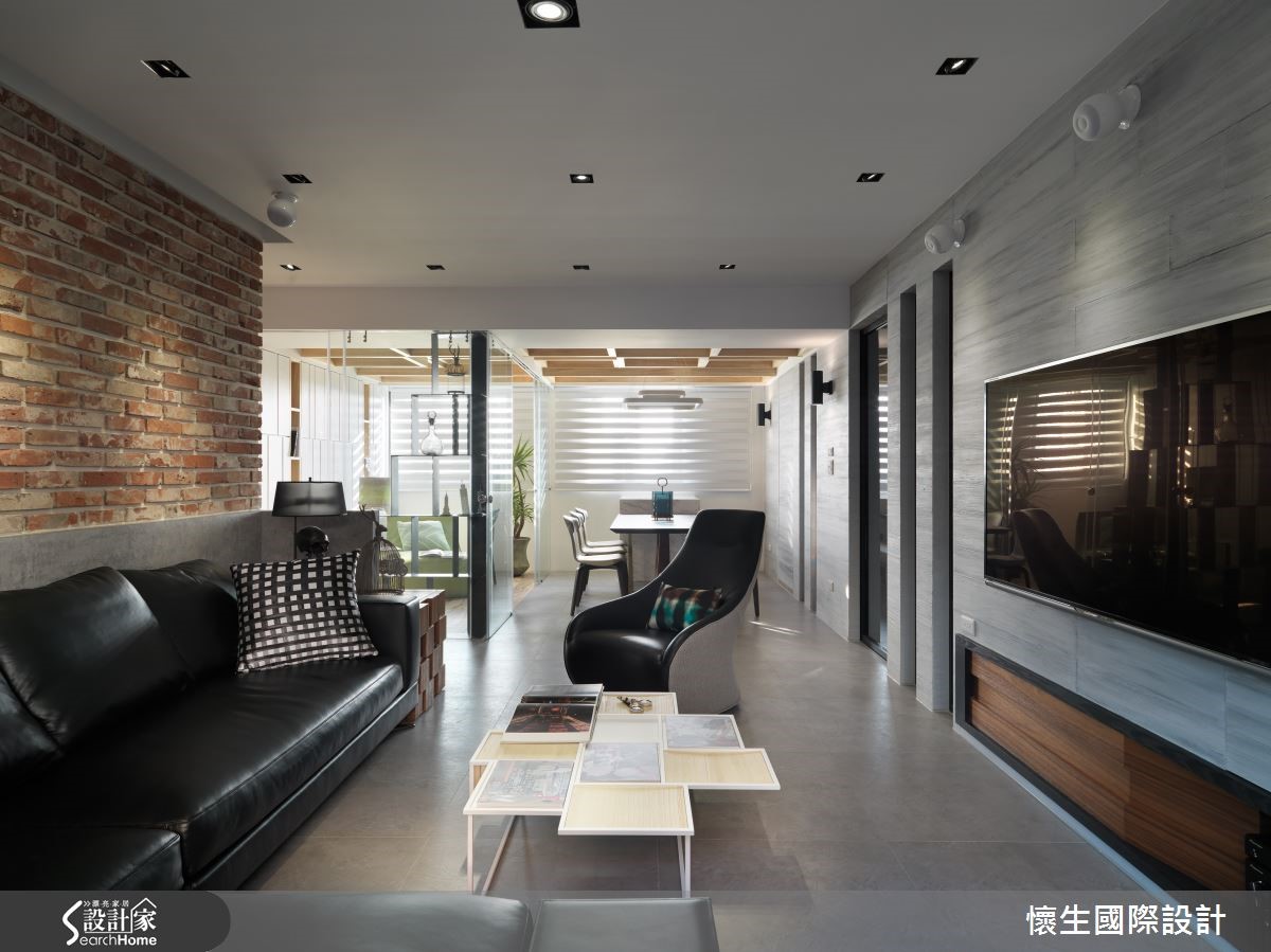 99平方米的大龄老屋,设计师给予改造计划,透过多元材质拼搭运用、创造美丽的墙面表情,并导引日光创造明亮氛围,同时将机能不着痕迹地隐于无形,使老屋改头换面,兼具风格与机能,彰显无限潜力。【复古红砖墙,营造原始工业风貌】客厅采复古红砖打造沙发背墙,带出极具原始个性的工业味道,相对应的则是仿木纹灰色电视墙,内部暗藏收纳机能,透过暖、热对比的墙面对话,碰撞出异材质冲突美学。【打造玻璃屋,引进通透视野】灰色电视墙延续至餐厅场域,期间穿插深色玻璃作出线性设计,保留光线、视觉的隐约穿透;而多功能室则采以清玻璃围塑而成,达成串联视线、视觉扩容的作用,伴随自然光挹注流转,构筑出有如玻璃屋的迷人氛围。【格状天花结构,提升空间层次】同时在多功能室、餐厅天花加入木作格状结构,除了彰显原始的自然况味,更形成挑高视感;主卧则为营造静谧感,给予深灰色调的大面积铺陈,墙角处融入黑线、木纹勾勒几何块状,搭衬吊灯装饰,在素净的整体基调之中,展现明快的重点式强调!