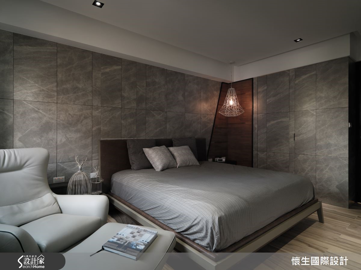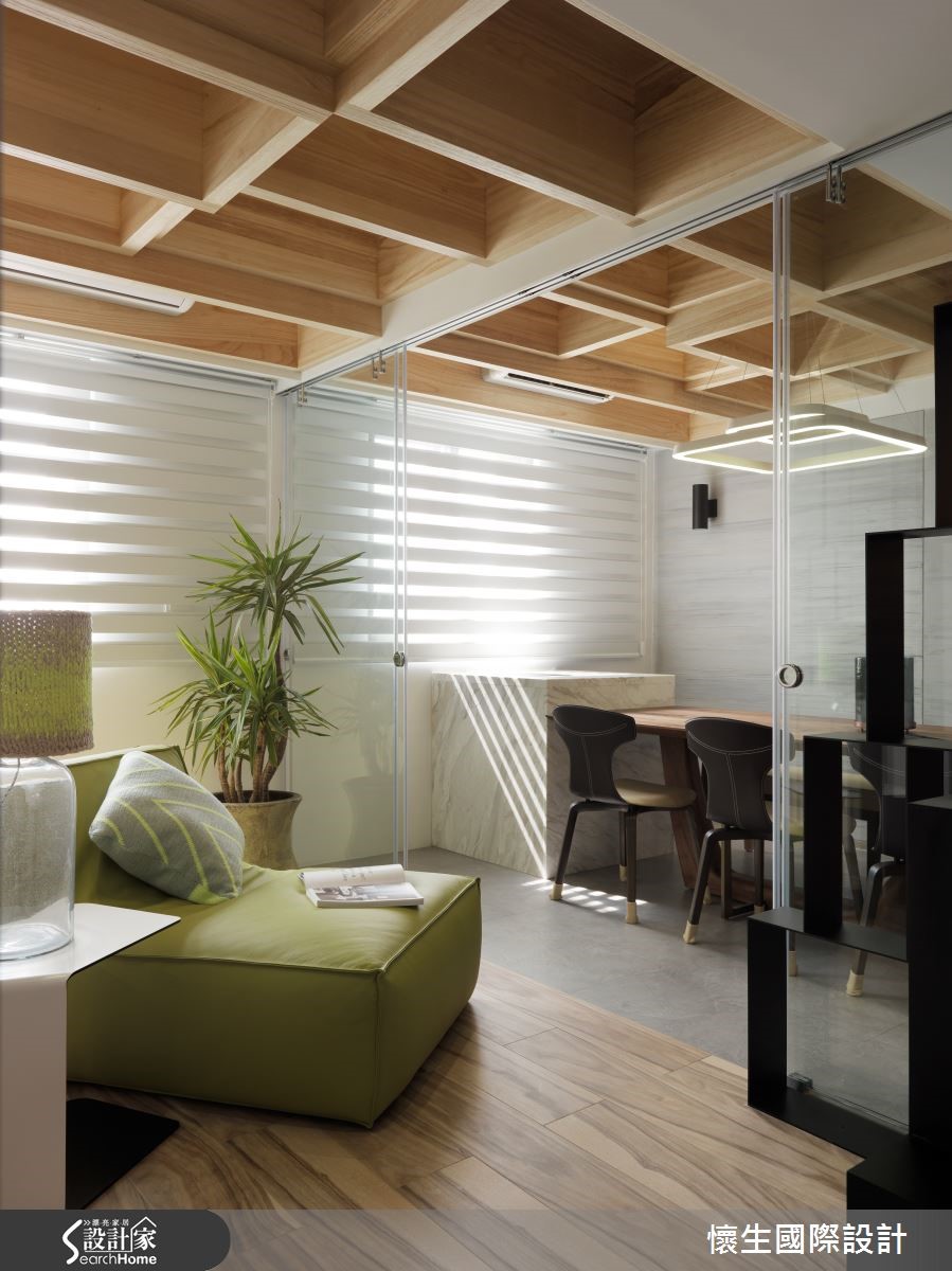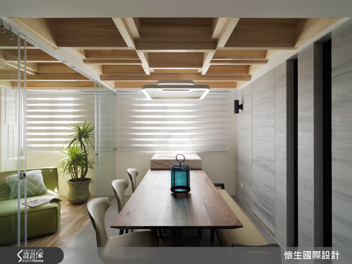 99平方米的大龄老屋,设计师给予改造计划,透过多元材质拼搭运用、创造美丽的墙面表情,并导引日光创造明亮氛围,同时将机能不着痕迹地隐于无形,使老屋改头换面,兼具风格与机能,彰显无限潜力。【复古红砖墙,营造原始工业风貌】客厅采复古红砖打造沙发背墙,带出极具原始个性的工业味道,相对应的则是仿木纹灰色电视墙,内部暗藏收纳机能,透过暖、热对比的墙面对话,碰撞出异材质冲突美学。【打造玻璃屋,引进通透视野】灰色电视墙延续至餐厅场域,期间穿插深色玻璃作出线性设计,保留光线、视觉的隐约穿透;而多功能室则采以清玻璃围塑而成,达成串联视线、视觉扩容的作用,伴随自然光挹注流转,构筑出有如玻璃屋的迷人氛围。【格状天花结构,提升空间层次】同时在多功能室、餐厅天花加入木作格状结构,除了彰显原始的自然况味,更形成挑高视感;主卧则为营造静谧感,给予深灰色调的大面积铺陈,墙角处融入黑线、木纹勾勒几何块状,搭衬吊灯装饰,在素净的整体基调之中,展现明快的重点式强调!