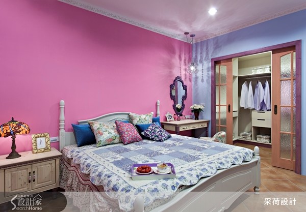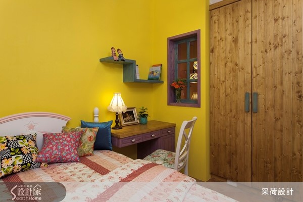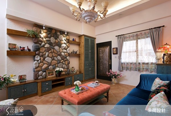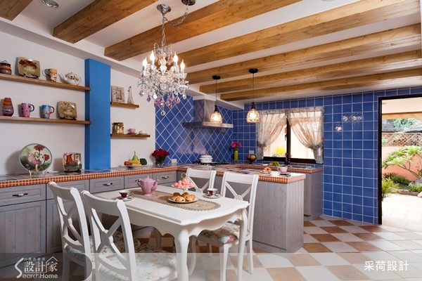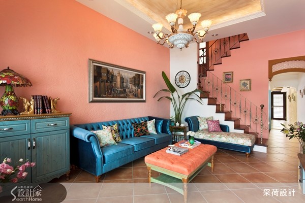 位在郊区的50年独栋楼,有着老屋常见的问题,没有自来水系统且楼板矮小,早已不符现代生活需求。因此设计师重划格局、进行风格营造与机能规划,打造符合一家四口想望的梦幻欧式乡村别墅。【注入鲜明色彩,缔造南欧热情】设计师为老屋注入西班牙式的开放格局,并将楼板拉高以利阳光进入室内。利用色彩鲜明的油漆为每一个空间的壁面刷上专属于南欧的热情与活力,客厅更混搭粗犷的石材与缤纷的家具、门片,让异材质碰撞出另类的炫目美感。设计师特意使带有雕花栏杆的楼梯外露,达成风格营造的完整性。餐厨空间采用欧式斜屋顶与木梁,搭配深浅不一的蓝色系方砖与墙面,给予人沁凉舒爽的视觉享受。铺设缤纷砖面的U字型吧台与复古砖地坪相互呼应,配合屋外后花园的绿意,创造地道的乡村风景。每一个卧房皆抓住南欧乡村风格的精髓,以蕾丝、碎花软件搭配壁板柜面及门片,最后以鲜艳的跳色墙面创造优雅、浪漫或活力的意象。设计师更因应人口组成与需求,将屋主幼时的房间改造为明亮且附有马赛克砖浴池的浪漫卫浴。