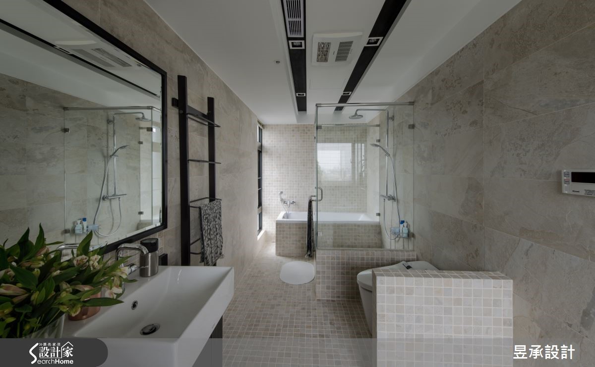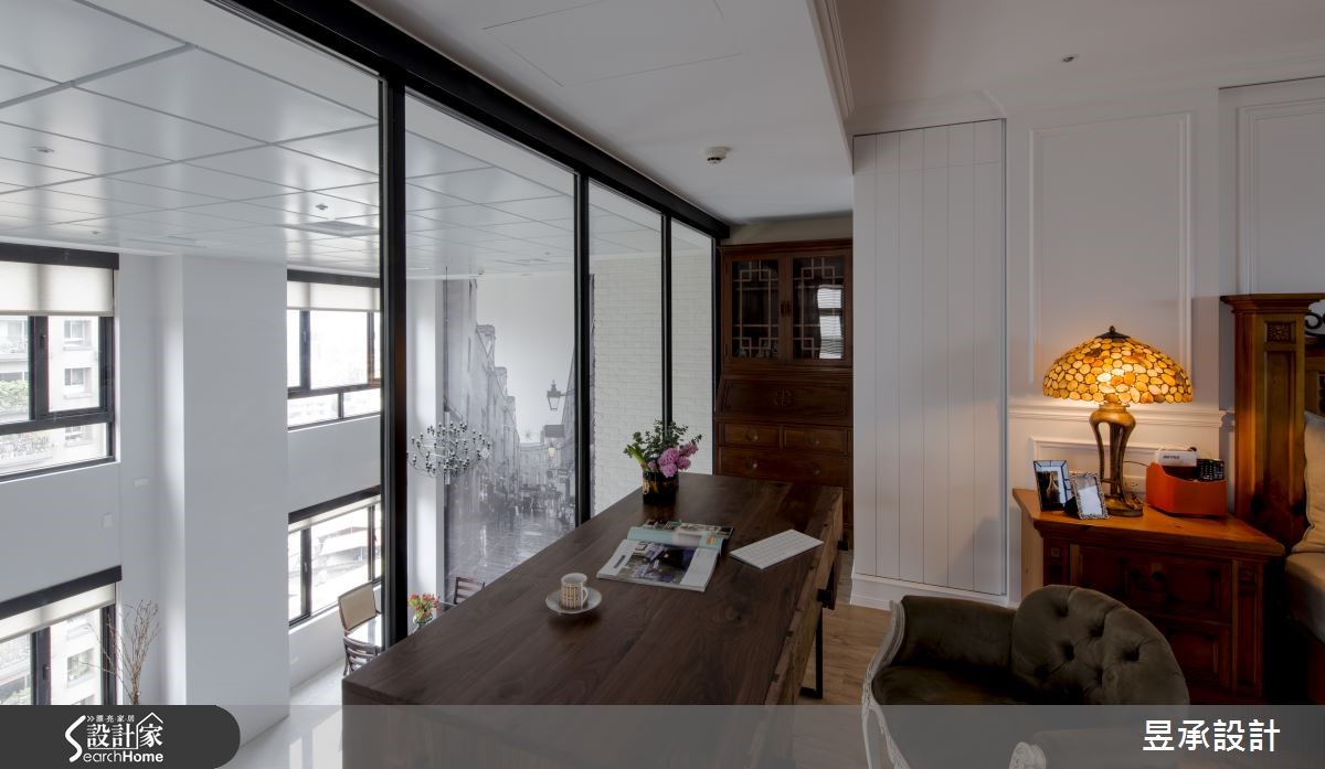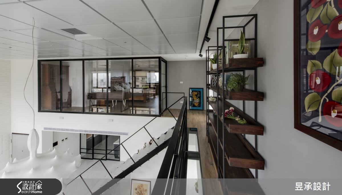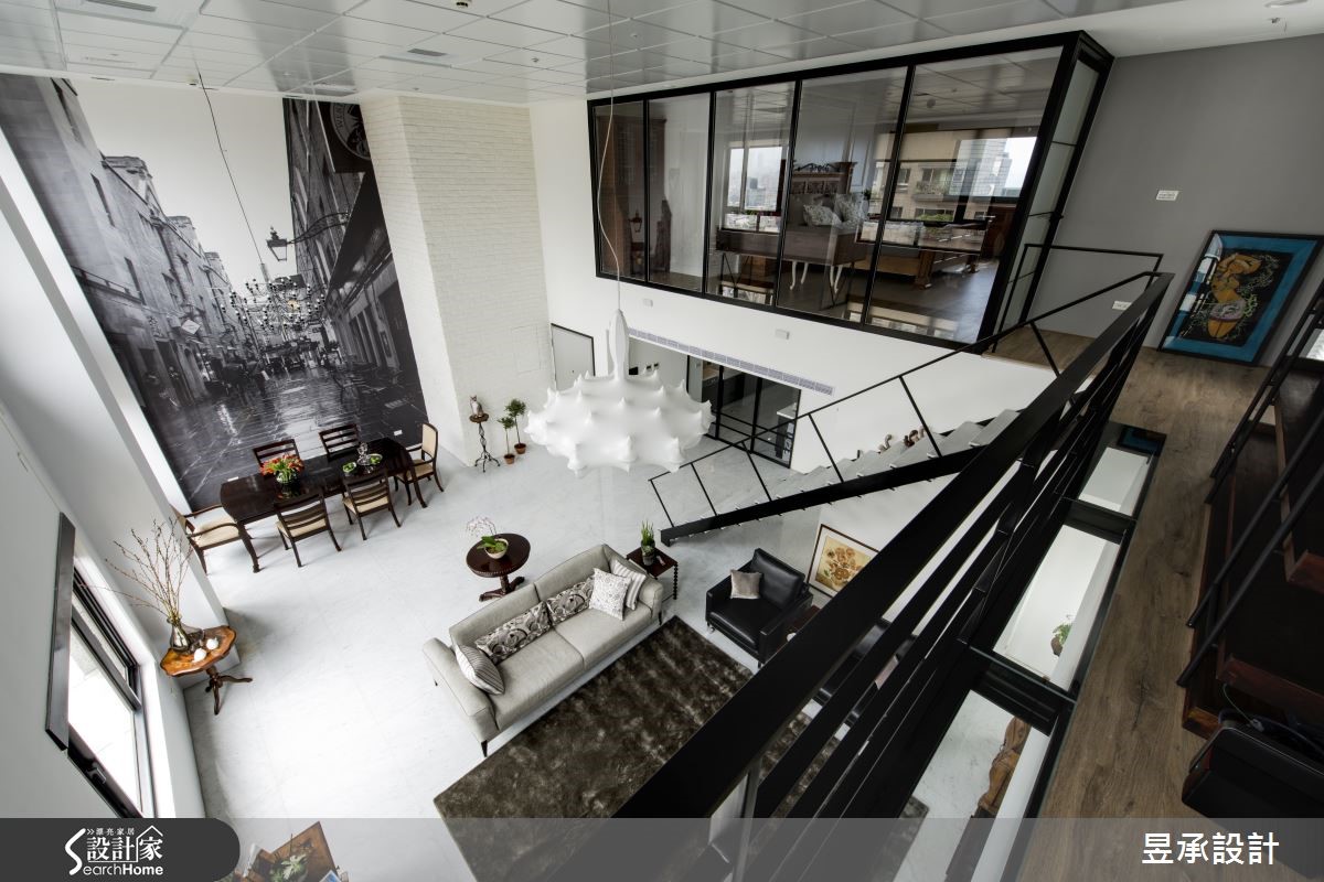 有鉴于屋主对于风格的接受度相当广泛,设计师决定融合屋主喜爱的美式风格与铁件元素,打造工业风为主、美式风为辅的221平方米居家,透过重塑展现异国混搭风格。 【大型照片和砖墙,展现挑高优势】在美式核心概念中,依空间条件注入工业风格,善用挑高优势,建入大型铁梯与镂空景观桥,更纳入六扇大面积窗户引入采光。除了刻画出工业风格的刚毅骨感,更塑造宛如身处旧金山阁楼错觉。铁件框架上皆采细腻的黑漆处理,卡拉拉白大理石电视墙搭配屋主挑选的实木柜与家具,同时彰显工业性格与美式摩登氛围。稍加改变原玻璃隔断色调划分公私领域。保留原始天花仅微调漆色,将管线隐于其中,省下装潢预算。开放餐厅主墙利用本身的挑高条件,整面铺满文化石并搭配街景照片,展现浓厚的大器风范。楼梯另一侧为通透的独立厨房与天蓝色的长辈房。二楼空间亮点是结合铁件与玻璃的空桥,佐以锻铁木层板架,凸显挑高格局优势。主卧室配合旧家具,以古典美式风格为主相互混搭,成为充满个人特质的美式工业风居家。为提升舒适度,设计师将主卧浴室空间放大,并设置含有工业元素的嵌灯与镜框,搭配米黄瓷砖及石纹砖,营造温润气息。