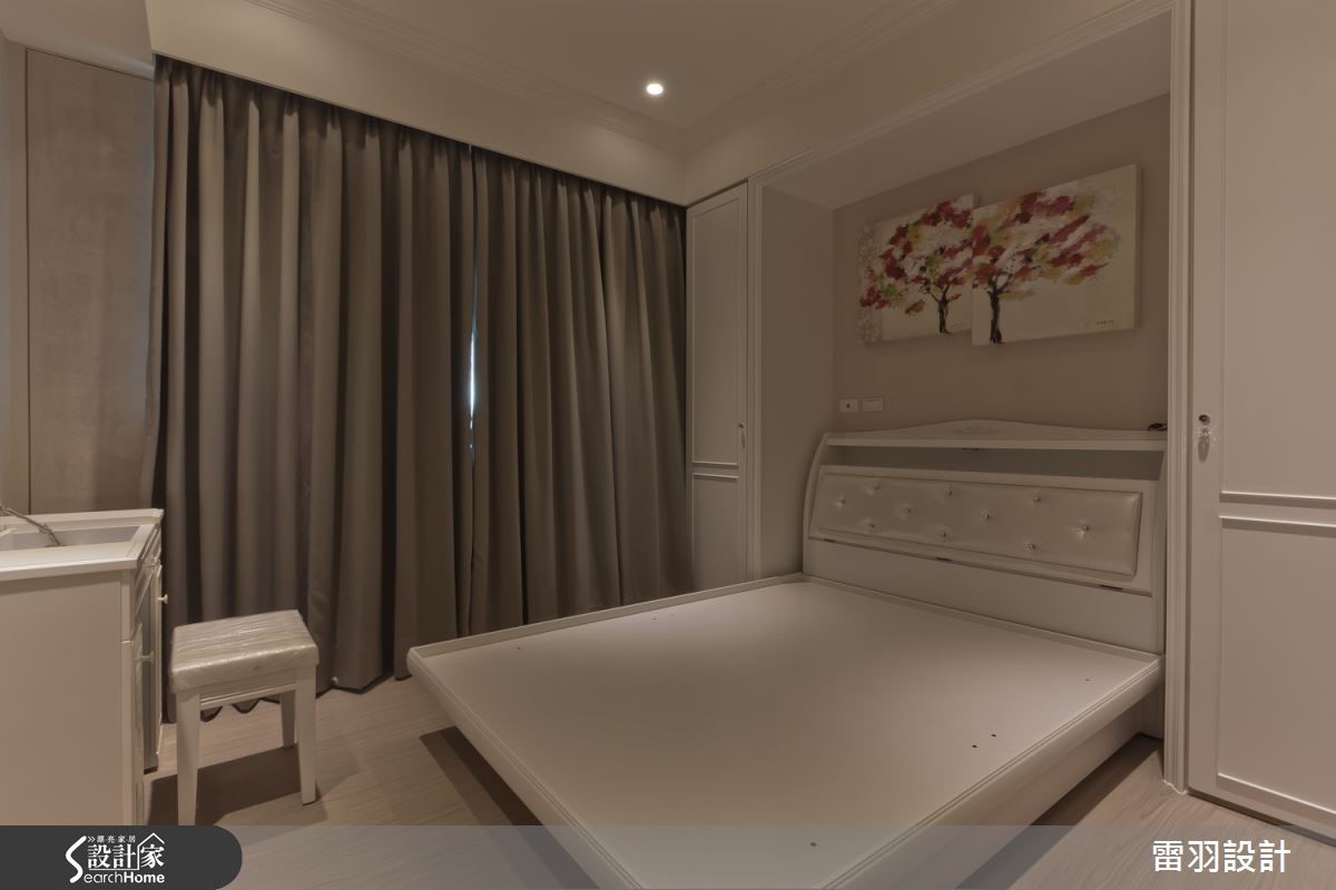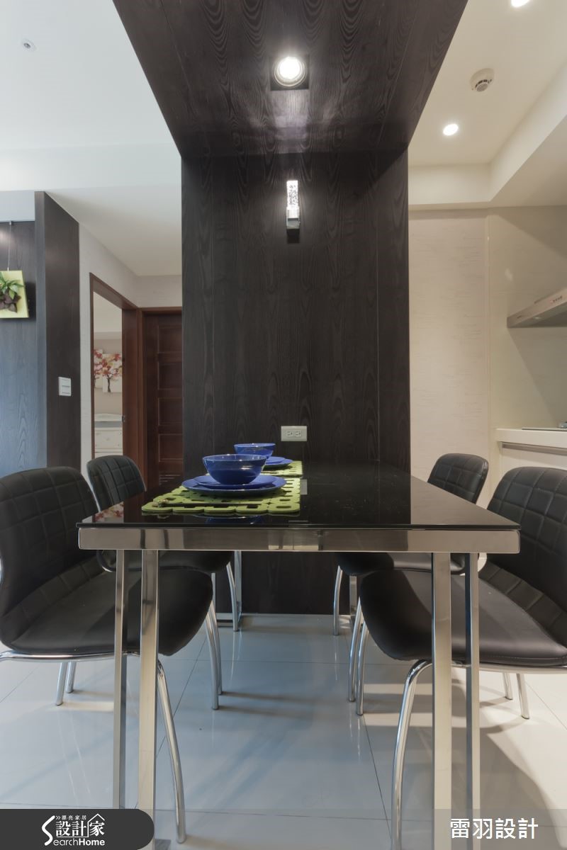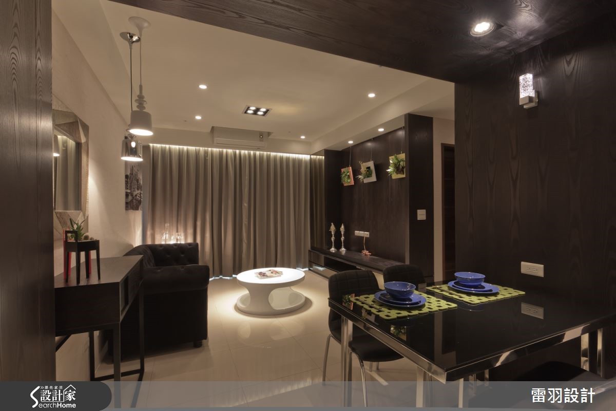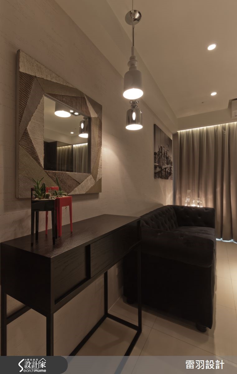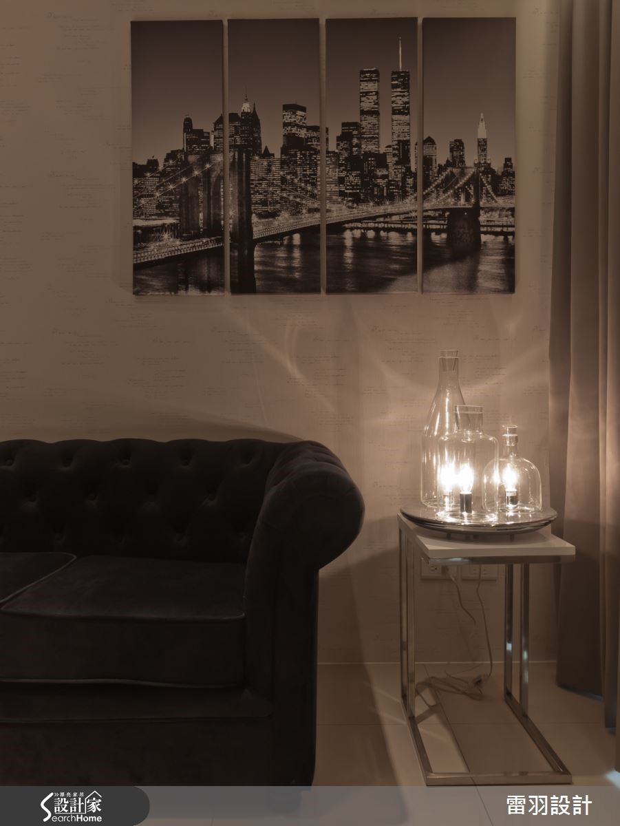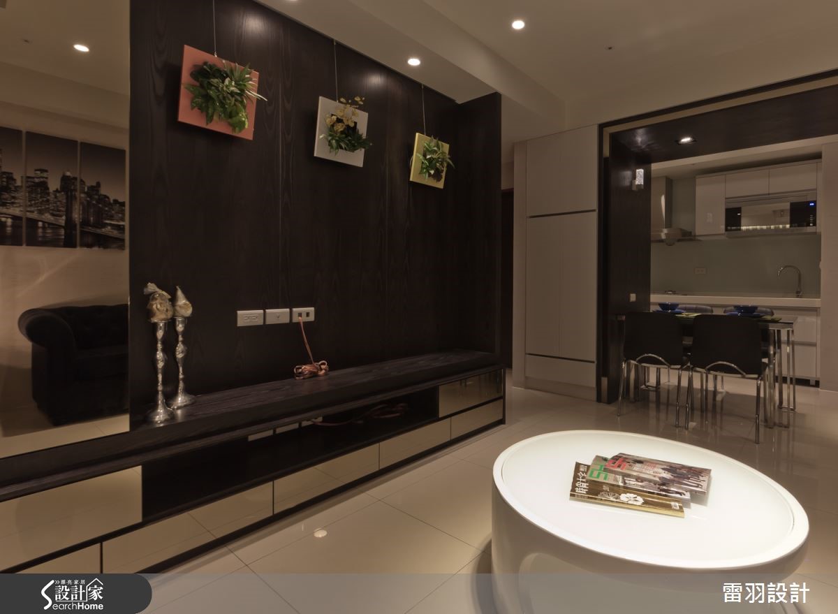 低调沉稳色彩铺排,让56平方米空间洋溢着一股神秘气息,古典贵族风格的拉扣沙发,成为空间中的华贵焦点,搭配墙面上的黑白画作,彷佛停滞在西式老电影的复古旧时光。 【镜面点缀,高冷空间添轻奢】利落的黑白对比用色,呈现摩登大器的空间质感。格局规划上则利用开放式设计连贯客餐厅空间,达成小户型的高效益。梁柱覆上深邃木色,下方规划为餐桌空间,无形中也建构日常起居和餐饮空间的隐形分界。电视柜加设镜面,具有延伸空间的效果,精致的银亮色泽也隐隐流露生活的奢华内涵,加上柔和灯光佐饰,更加凸显精品般的细腻氛围。来到卧室空间,利用梁柱下方的畸零空间,规画收纳柜体,门片融合线板细节,更显雅致。