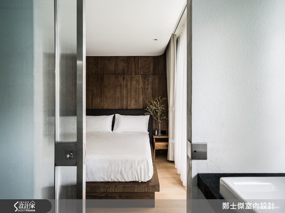 拥有大量藏书、喜爱绘画与下厨的男屋主,设计师在本案设计中,将重点放在书架、多功能书房与开放式餐厨,并重新配置格局、引入明亮采光,赋予老屋新风貌,打造充满独特品味的居家空间。【弧形书架,颜值和机能兼具】走进空间,设计师以玻璃隔断作为书房兼画室,结合鞋柜配置,形成与玄关之间的通透界线,并加入圆弧角度与投射灯照明,于墙面创造美丽的光影痕迹。走进空间内,则将主要动线移至中央,给予前后呼应的明亮采光。客厅地面采以水泥拼接木地板,做出两种视觉质感,让大沙发随性陈列,留出宽敞的通道空间。墙面嵌上高承载力的弧形书架,形成颜值与机能兼具的设计。一旁餐厨区则以中岛衔接餐桌,配置不锈钢的圆柱桌脚餐桌,引领阳刚的轻工业风格。主卧房于床头铺设深色木质基调,且搭配窗户引进日光,呈现带有疗愈感的森林气息。