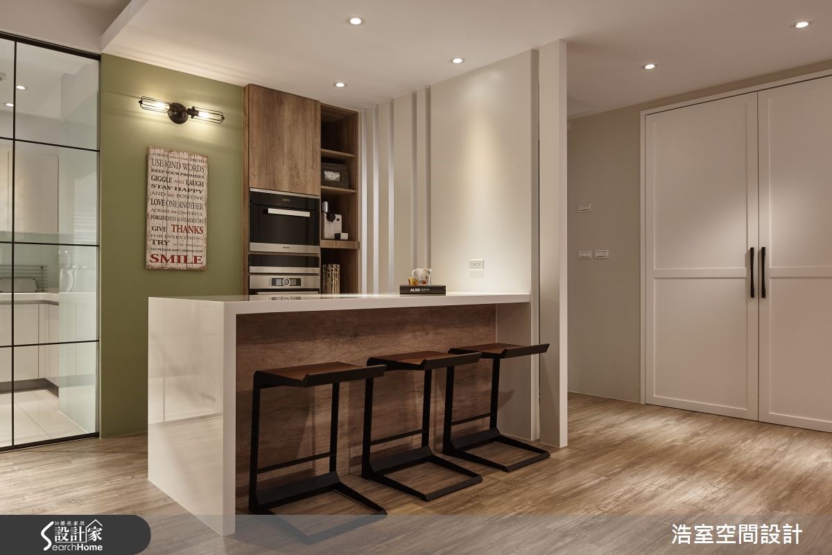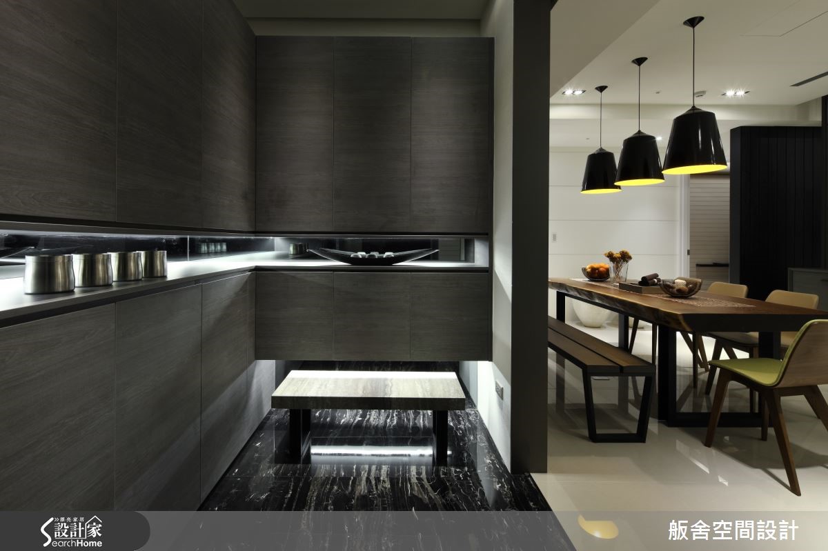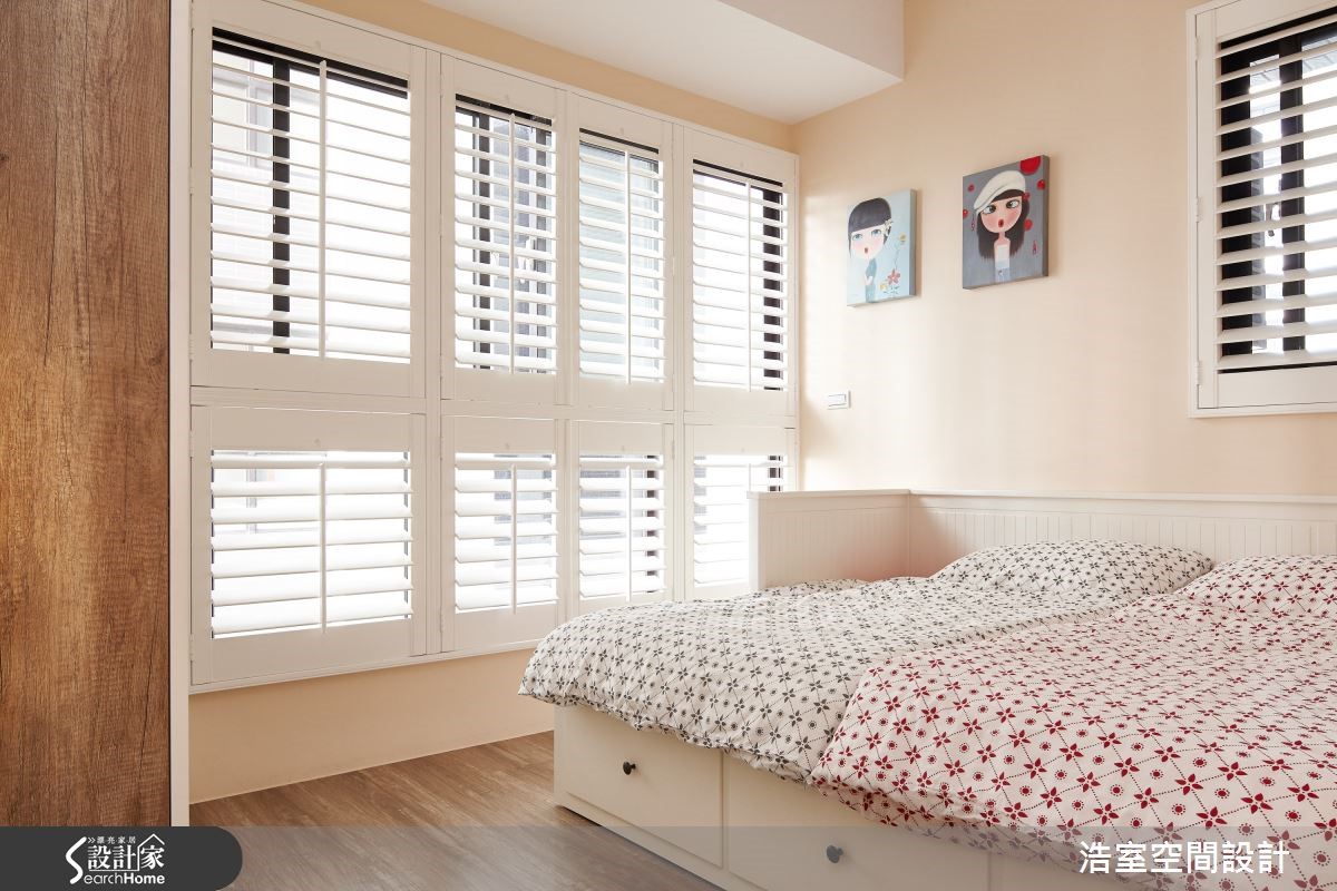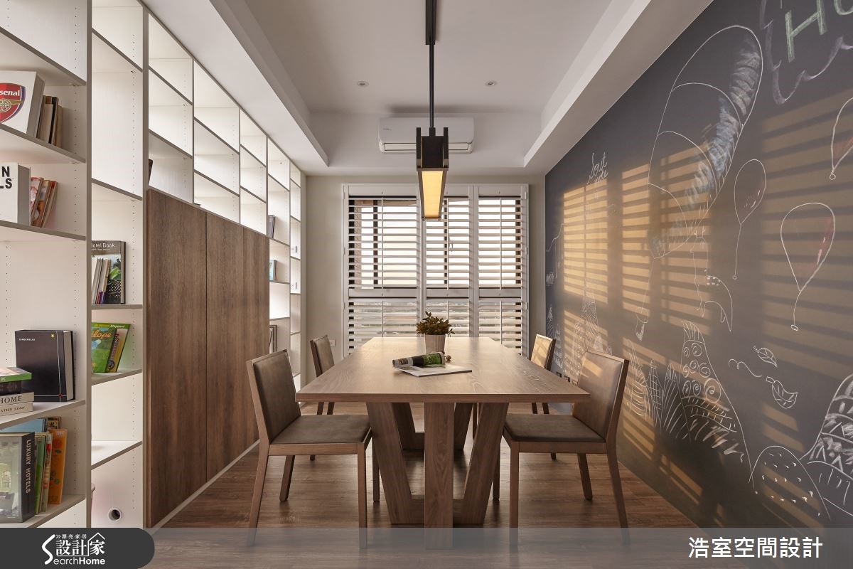 132平方米的新成屋,除了精密实用的空间规划,以及儿童的安全考虑,另外,更引渡阳光进驻,当日光斜射入内,透过木百叶和展示柜的疏漏间,让光影为一家4口的生活,成就美观的瞬间。【给孩子一个开心成长的回忆】玄关利用宽幅不一的隔断引注亮度,并与客厅接轨过渡带,创造位置相称的储藏室,无形中也牵引动线方向。客厅的另一面为书房与餐厅的复合区块,经由开放式书墙界定领域,同时也将光线无私分享,让木百叶与展示书柜的结构光影,在木地板上交织为绝美的生活印记。 书房墙面并安排可涂写的黑板墙,让家人可以画下美好日常的点点滴滴,增进家庭生活的亲情互动。主卧室则以温煦木质渲染宁静沉稳的氛围,并妥善规划充足的收纳区。儿童房选择特制的小孩床,考虑儿童使用上的安全考虑,侧边加上围栏,而床下的抽屉兼具收纳用途。