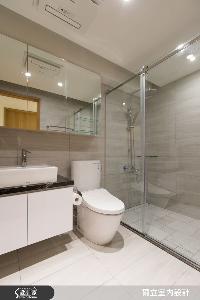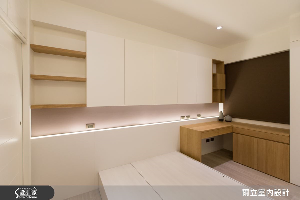 由于原始空间不敷使用,再加上动线不良,设计师重新改造92平的老屋,化为满足三代同堂需求的简约宅;没有新潮的元素,而是着重在机能规划上,让一家四口拥有舒适实用的生活环境。【防滑材质和设计,老幼皆安全】为了同时符合老中青三代需求,设计师微调居室、放大狭小的浴室空间,并着重安全性设计,包含铺设防滑木地板、抹除地面与门槛高低差,以防摔倒危险。公共空间在客、餐厅之间的连接处设置大量柜体,注入充足收纳机能、矫正零碎空间,更预留不显突兀的佛龛设计。应长辈要求设置宽敞易清洁的厨房,巧妙利用磨砂玻璃移门作为与餐厅的屏隔,营造通透效果。主卧因应夫妻大量藏书需求,将床头墙打造为大面积收纳柜;儿童房则巧妙利用斜屋顶化解大梁压迫,并以水蓝色完成童话般的趣味效果。