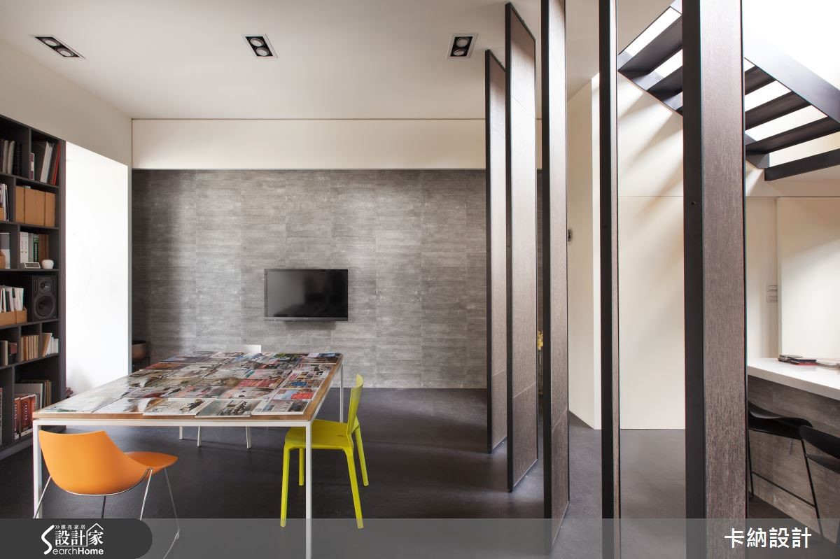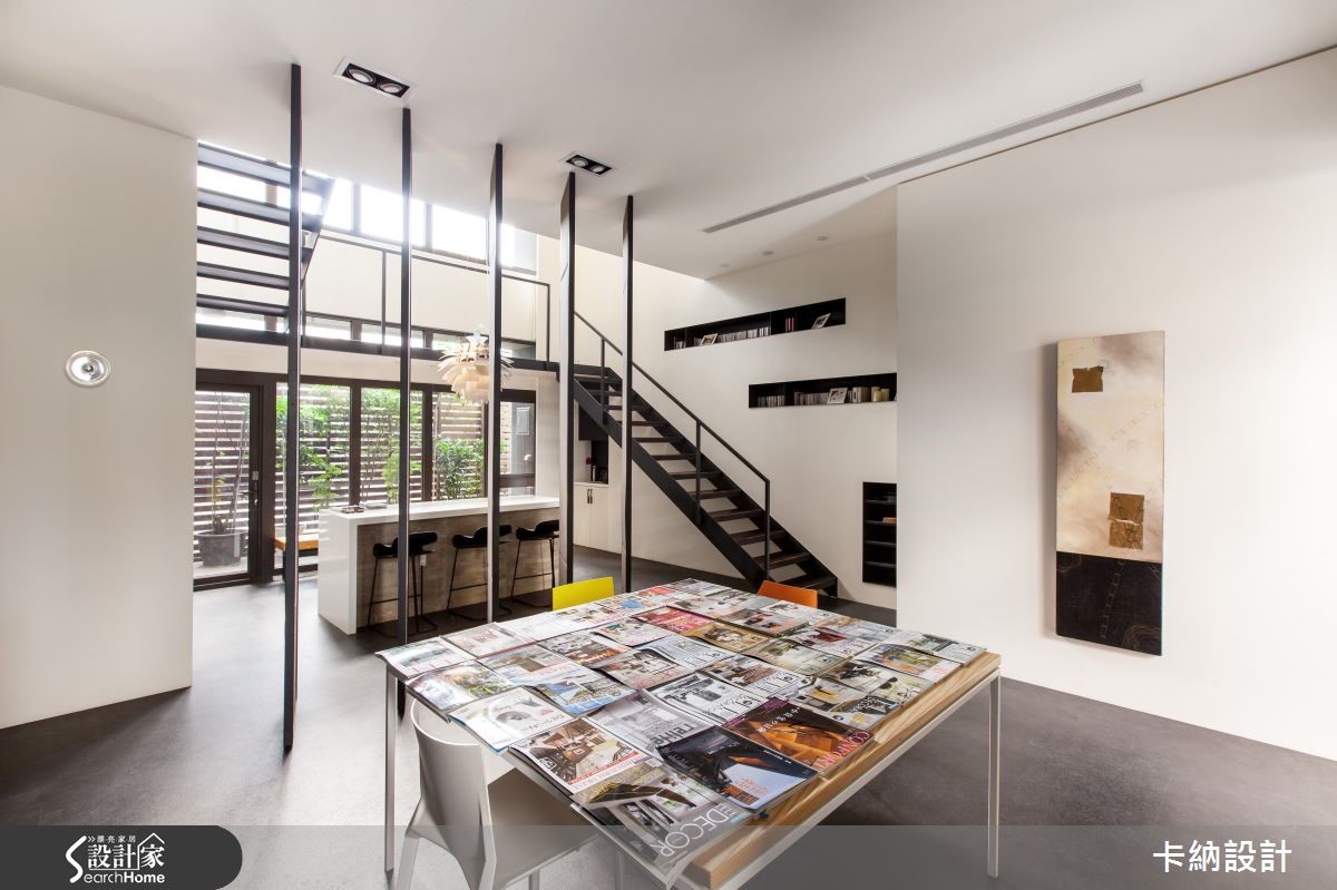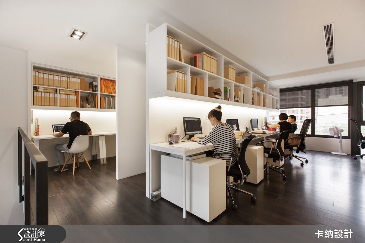 这是一间以现代风的办公室,采双层规划,赋予利落明确的分割,并融入简约的色调与,在循序渐进的格局基础上,配置恰到好处的员工座席,提供符合办公时需要的舒适与温度,快跟着小编一起来看看吧! 【简白色调与自然共存的格局】一楼会议室采以深褐色搭配白色,展现沉稳氛围,并融入大面积书墙与跳色单椅,提升空间彩度,展现具设计感的格调,且配置可灵活转动的格栅做为会议室、吧台区的隔屏,不仅界定彼此范围,更导引户外采光,增添办公室特色。梯间采以黑铁为架构结合木质踏阶,揉入轻盈的表现形式,规避材质本身的厚重感,一旁的白色侧墙则置入展示平台,以黑色带状型塑色彩对比,赋予墙面视觉趣味。二楼为主管与员工办公场域,延续简白的色彩基调,分配开放长型空间,使每位工作者都可感受到丰沛日光,并将收纳机能集中在上方,设计充裕的座位空间,挹注精神感十足的利落氛围。
