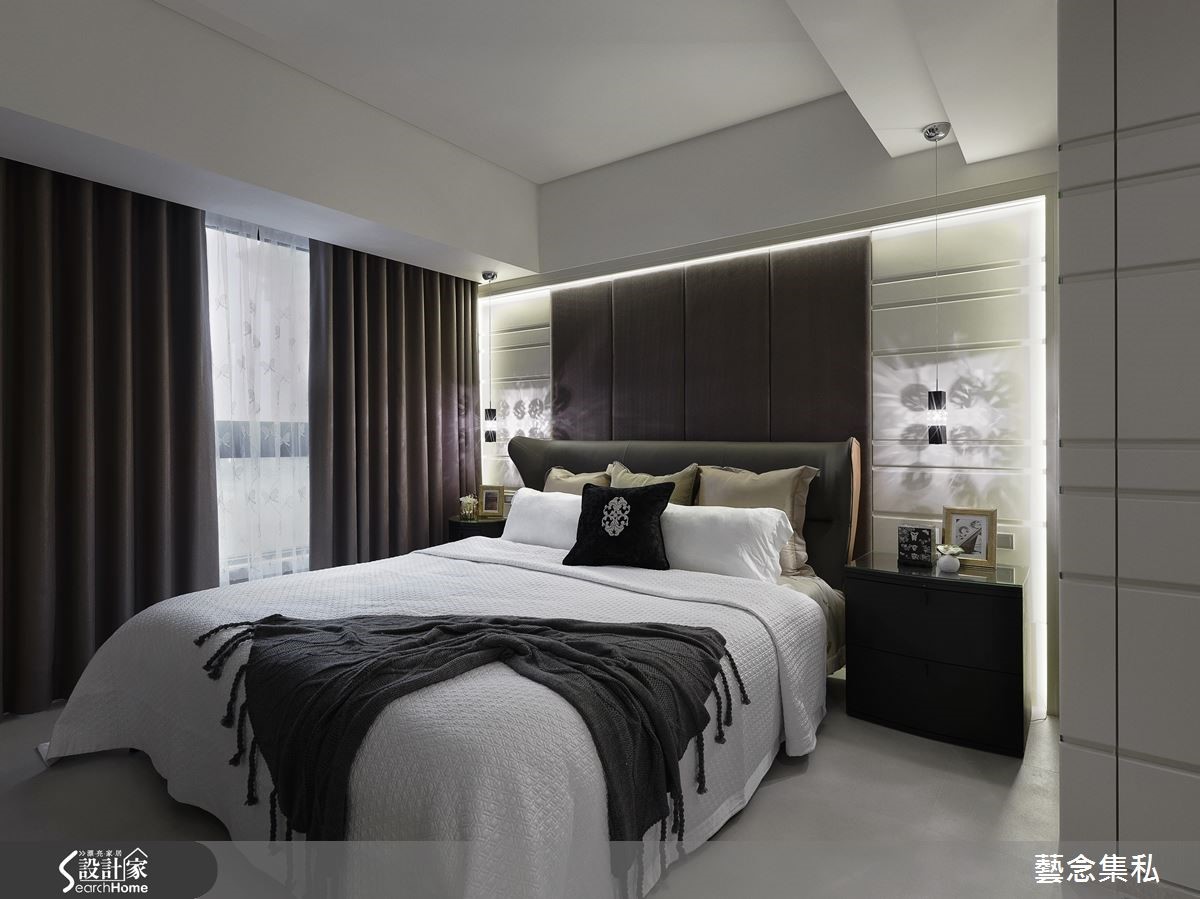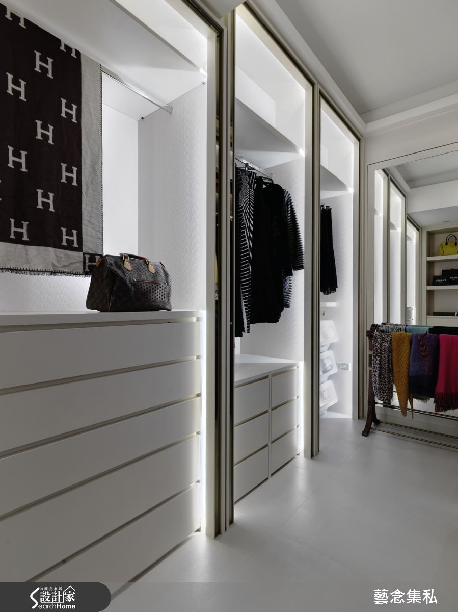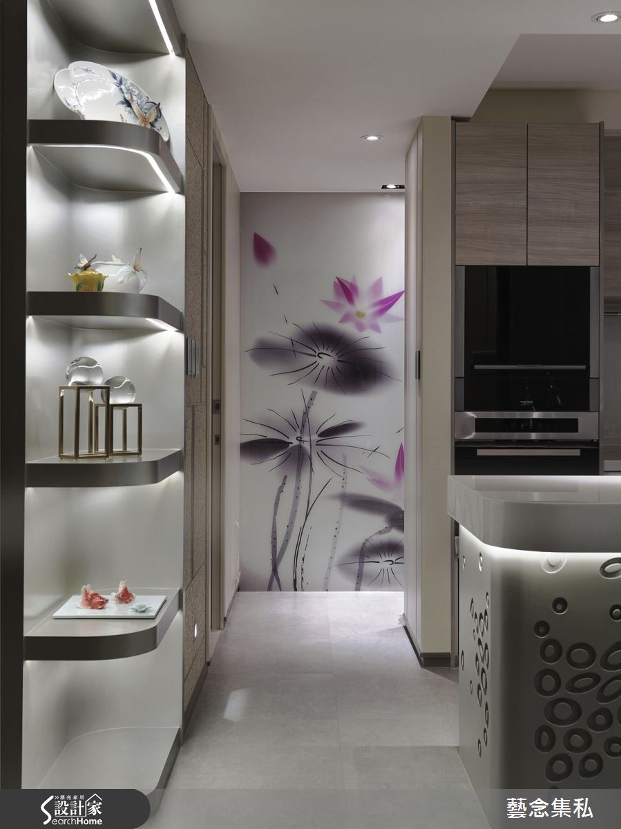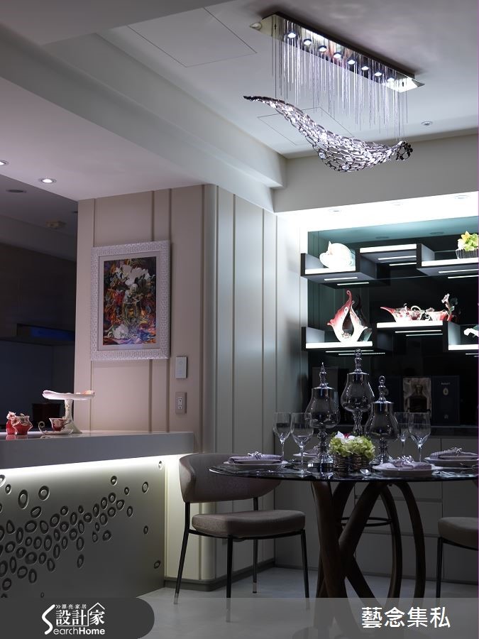 已届退休年纪的熟龄女屋主喜爱旅游,在居家装修上,设计师将既有装潢拆除重整,把三室两厅微调成更符合屋主生活习惯的格局,且挹注低奢混搭风,搭配软件的巧思陈设,利用空间充分表达居者的魅力风韵。【时尚利落打造鲜明入口风景】玄关处,设计师将柜体结合展示功能,巧妙于天花、立面做出椭圆挖空造型形成呼应,并于展示台陈列琉璃且加入灯光照映,构成鲜明的印象,前方则配置穿插金色的黑色折迭铁隔断,摆放带有精致雕花的锡质穿鞋椅,突破金属的阳刚表现,融入雅致的视觉韵味。【尽情小酌的最佳地点就是家里】客厅以浅色为底,透过家饰软件跳出自我风格,释放带有个性的女性特质;餐厅柜体结合灯光或镜面缀饰,展现时尚轻盈感,并规划开放吧台,在台面量体底部做出圆型图案装饰,与流线感吊灯构成摩登氛围,打造出可尽情小酌欢聚的居家派对场合。【大器舒适,柔美光影很纾压】主卧挹注沉稳色彩,给予大器简约调性,床头两侧饰以壁灯挥洒光影,制造别致的浪漫氛围,并规划专属更衣室,赋予超大容量的收纳机能,完美安排屋主的每一个品味收藏!