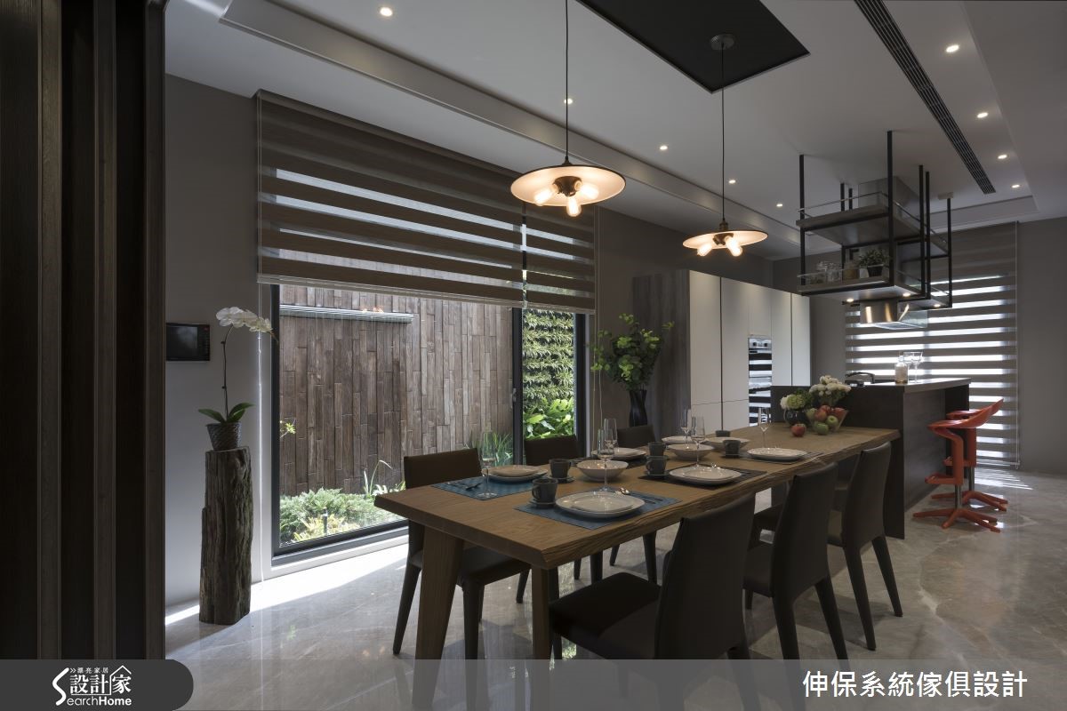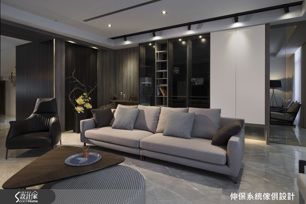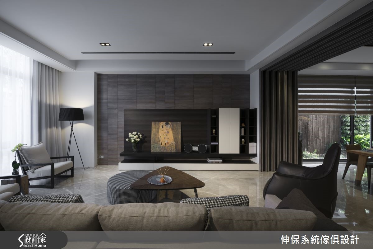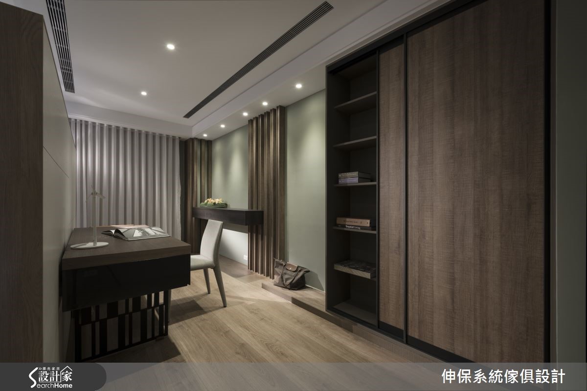 在此宾客招待所内,屋主期望可充分表现自身对品味的追求。客、餐厅之间的过地道带,设计师利用深浅木纹板材、以不同厚薄错层包覆梁柱,令人循着线条作出视线延伸,缔造悠远的景深。【收纳架辅助收纳,扩大空间效益】客厅于沙发后方规划整排连续柜墙,采以悬空设计营造轻盈感,集结茶镜、灰镜、水波米白、茶玻与铝条,并搭衬系统柜,将电器设备稍加隐藏,整合成高雅的立面表情。电视墙采洞石板切割拼贴为主体,周边作出柜体搭配,稳重但不失轻盈。开放式餐厨空间搭载收纳架活化机能,以人造石、木纹板材打造操作台面,实木餐桌透过窗户连结室外,构成美好用餐场景。卧室电视墙构成口字动线,区隔起居及书房并保有串联,床头嵌上壁灯并连结不落地木作柜体,搭衬壁面上的灰与绿色调妆点,盈满纾压气息。