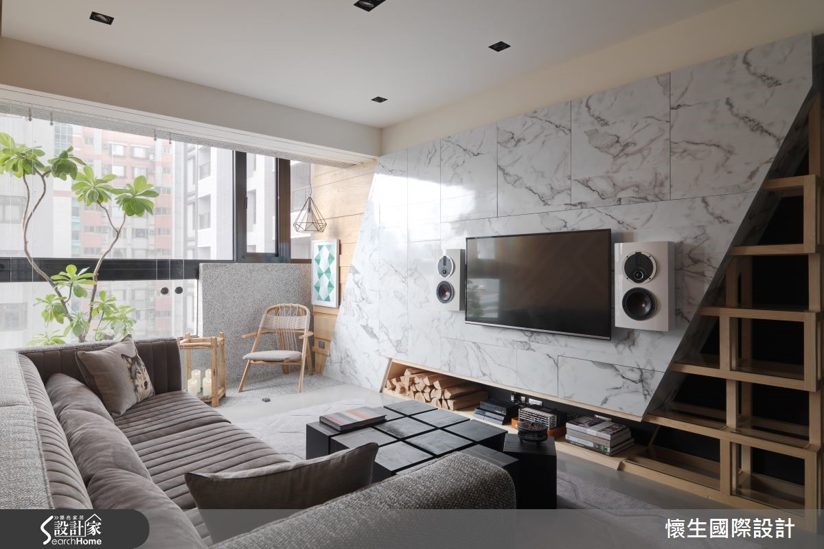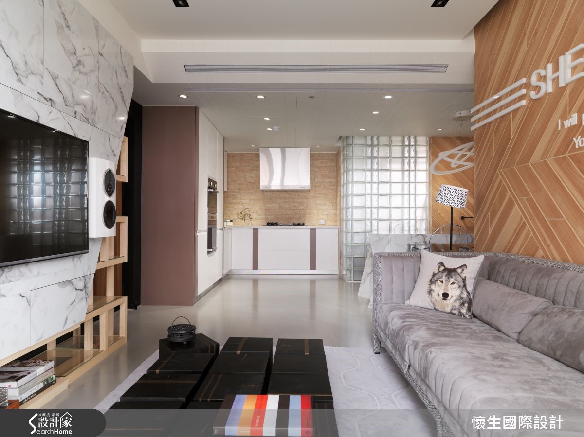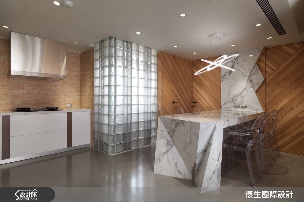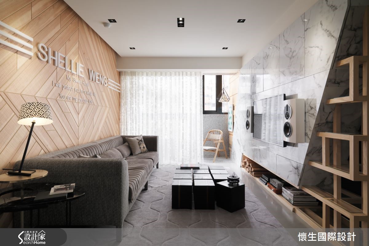 99平方米的二手屋,是设计师献给宝贝女儿的未来礼物,将格局予以重整,在色调、材质上挹注温暖和煦的底调,同时给予独特鲜明的设计语汇,透过不对称的几何线条与立体造型,量身定制出专属风格。【特色背景墙,写入女儿名字】设计师把大量采光带入屋内,伴随植栽妆点,营造休闲惬意的度假感受,且特意采木质铺陈沙发墙背景,融入具层次感的交错纹理,加入女儿的英文姓名字样,成为充满情感记忆的视觉焦点。【餐厨格局对调,型塑开放视野】电视墙则刻意设计为平行四边形,结合木作收纳柜体,隐约呈现裸露的结构意象;且将厨房、餐厅位置对调,改为开放格局,型塑开阔的视野,并在转折处规划玻璃砖墙面,导引阳台采光,改善空气与光线对流。【倾斜柜格设计,衍生扭曲视感】餐桌采以石材打造,巧妙从墙面延伸至量体,透过有力的线条、凹凸的面相呈现雕塑艺术感;书房则刻意让墙面书柜呈倾斜状,衍生扭曲空间的趣味观感,桌体抽屉则突破传统,大胆设计成错落旋转的形式,创造无尽的视觉想象。【线条与材质,型塑强烈印象】主卧于床头取用不同材质、拼凑出线条语汇,并让丰富的石材纹理作出大面积延伸,构成强烈的空间印象,更衣室则明显独立于寝卧一隅,使入口呈不对称状,带给人彷佛进入洞穴探险的意境!
