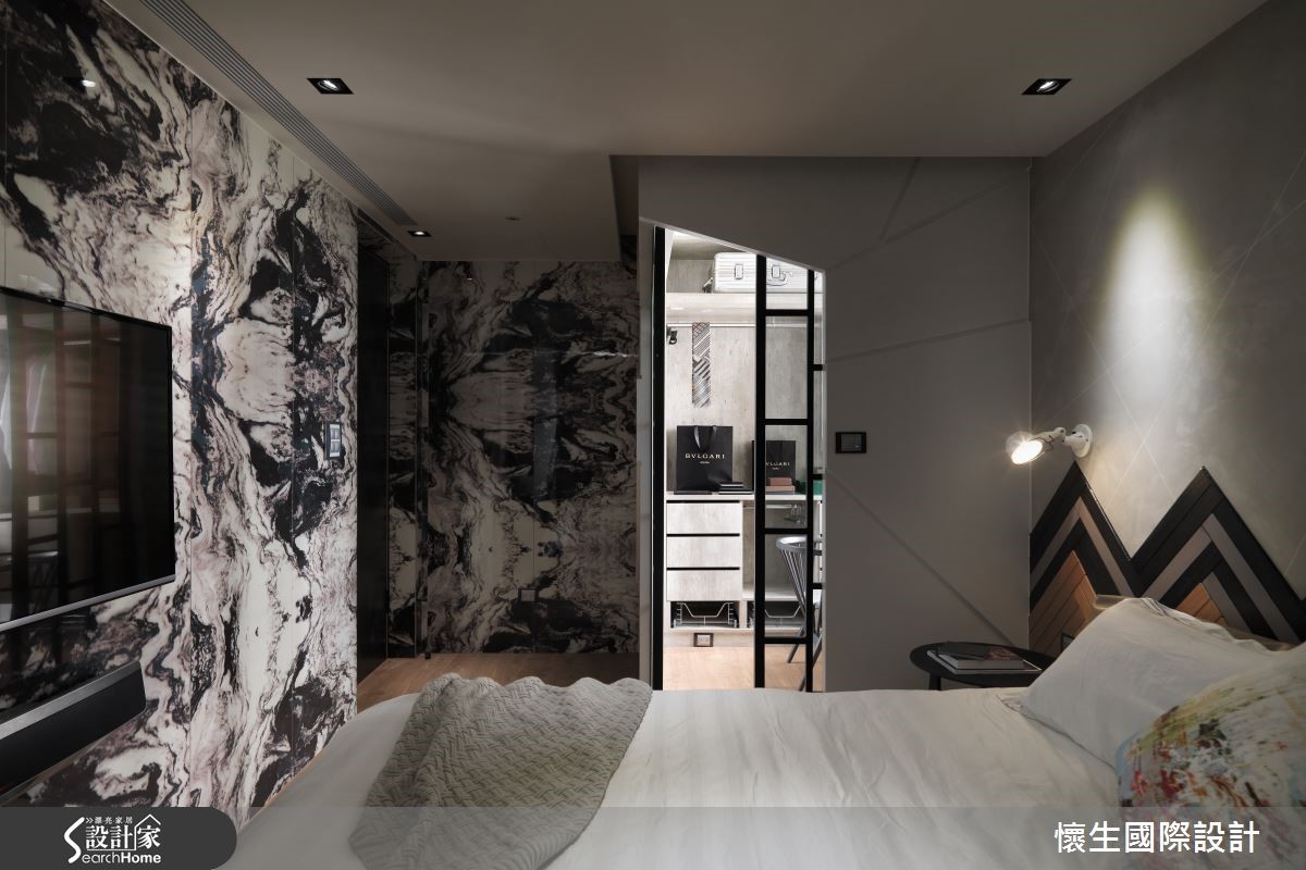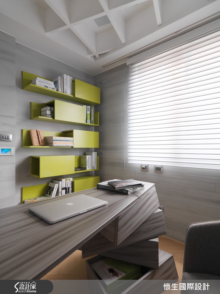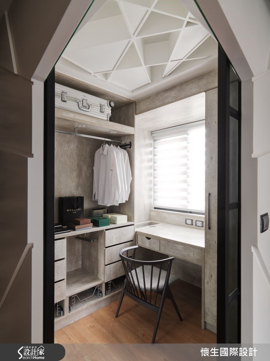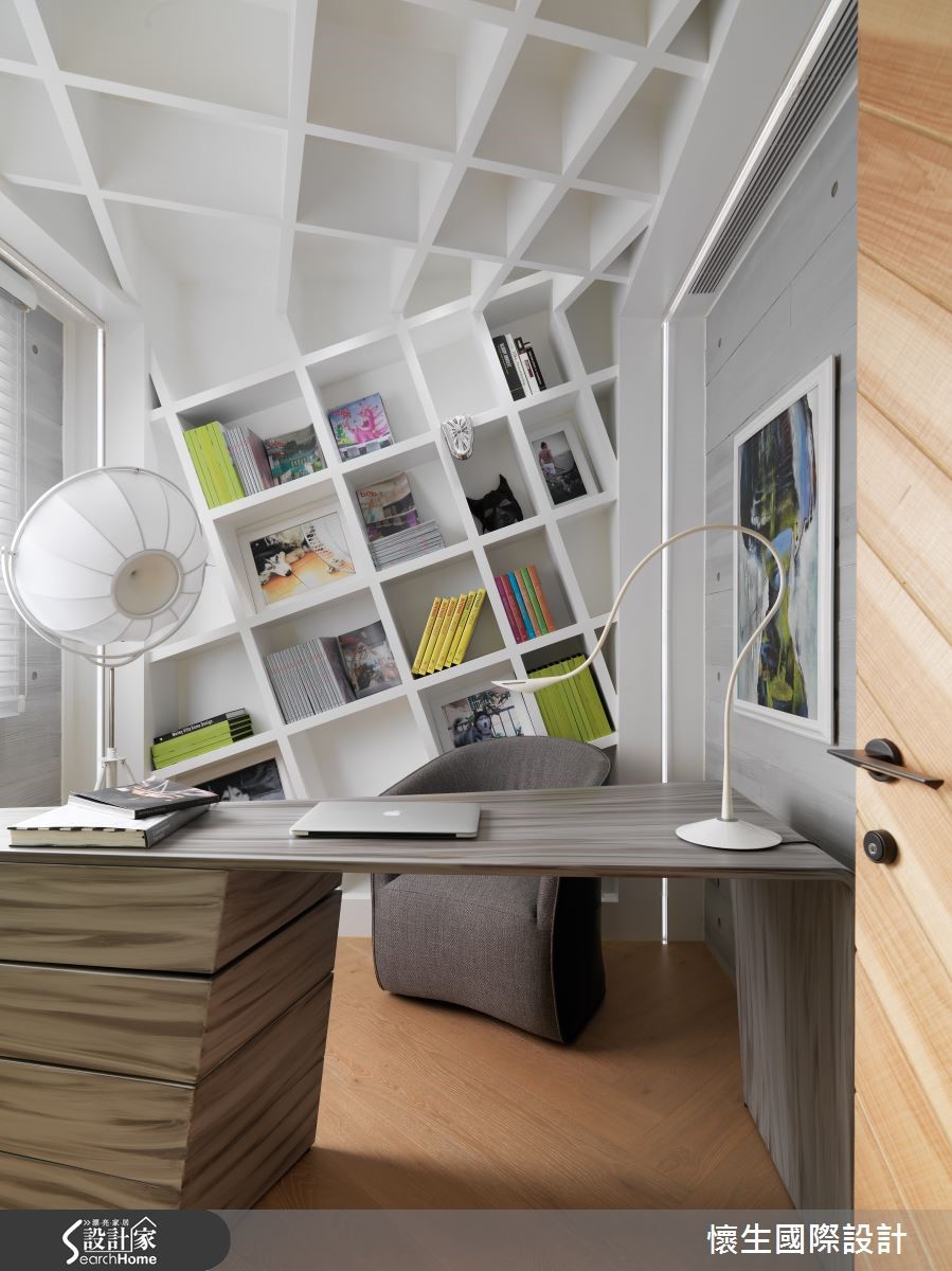 99平方米的二手屋,是设计师献给宝贝女儿的未来礼物,将格局予以重整,在色调、材质上挹注温暖和煦的底调,同时给予独特鲜明的设计语汇,透过不对称的几何线条与立体造型,量身定制出专属风格。【特色背景墙,写入女儿名字】设计师把大量采光带入屋内,伴随植栽妆点,营造休闲惬意的度假感受,且特意采木质铺陈沙发墙背景,融入具层次感的交错纹理,加入女儿的英文姓名字样,成为充满情感记忆的视觉焦点。【餐厨格局对调,型塑开放视野】电视墙则刻意设计为平行四边形,结合木作收纳柜体,隐约呈现裸露的结构意象;且将厨房、餐厅位置对调,改为开放格局,型塑开阔的视野,并在转折处规划玻璃砖墙面,导引阳台采光,改善空气与光线对流。【倾斜柜格设计,衍生扭曲视感】餐桌采以石材打造,巧妙从墙面延伸至量体,透过有力的线条、凹凸的面相呈现雕塑艺术感;书房则刻意让墙面书柜呈倾斜状,衍生扭曲空间的趣味观感,桌体抽屉则突破传统,大胆设计成错落旋转的形式,创造无尽的视觉想象。【线条与材质,型塑强烈印象】主卧于床头取用不同材质、拼凑出线条语汇,并让丰富的石材纹理作出大面积延伸,构成强烈的空间印象,更衣室则明显独立于寝卧一隅,使入口呈不对称状,带给人彷佛进入洞穴探险的意境!