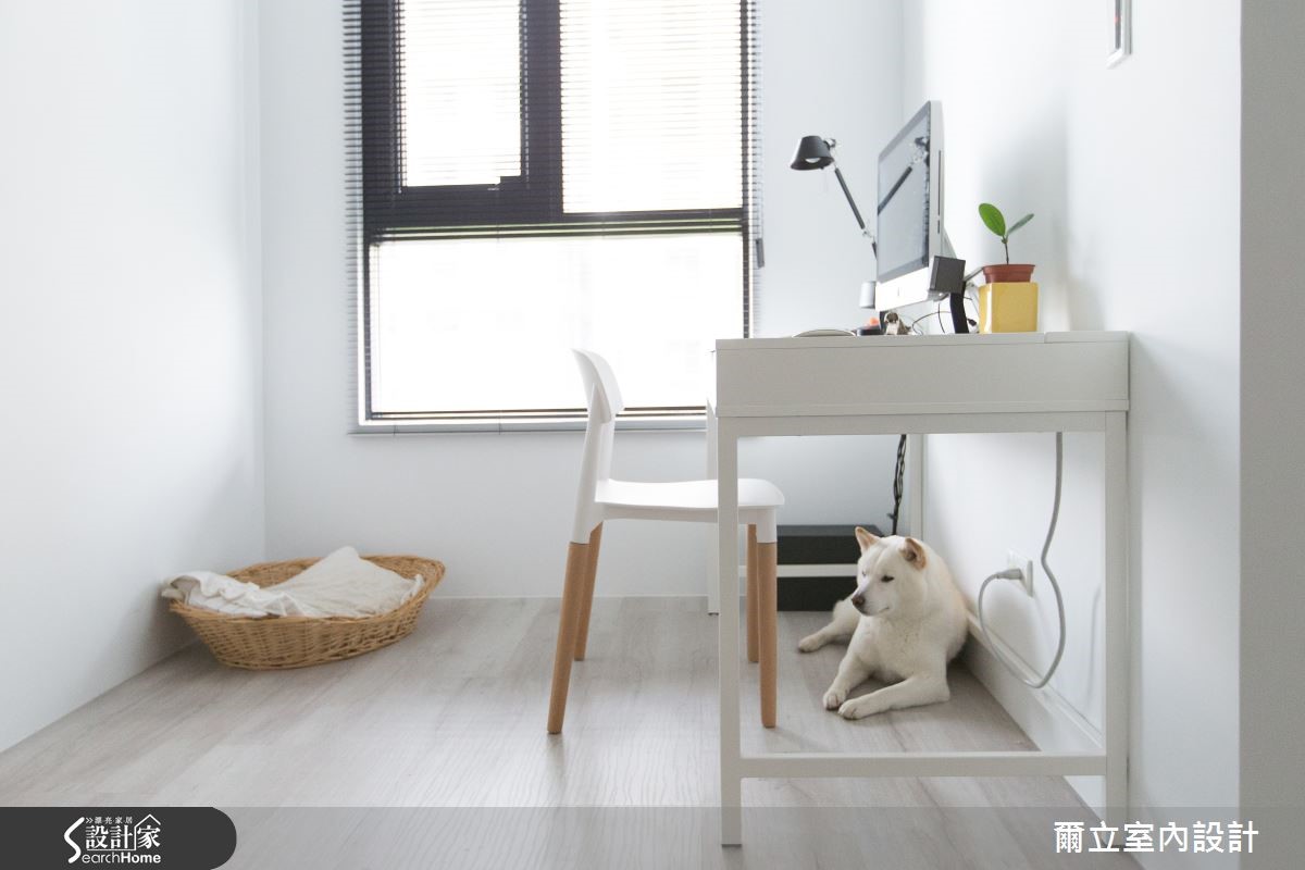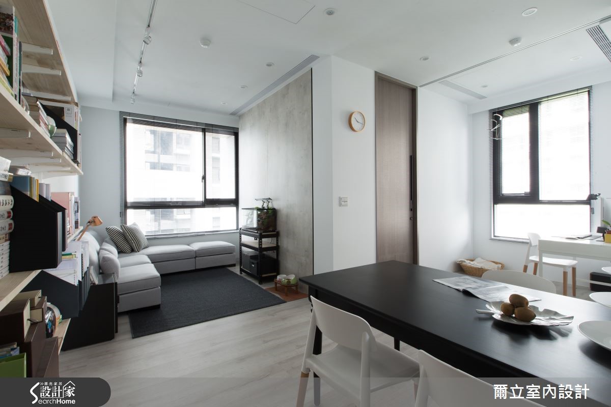 仅49平方米的住宅,空间虽不大,但具备了完整的生活机能。客厅、餐厨、书房及卧室,彼此有着合宜的距离,辅以清爽色调安排,成就舒适自在生活空间。设计师以有限的预算,满足了两人一犬对于幸福生活的期待。【聪明收纳,采光又清爽】在采光明亮的区域分别安排客厅及书房,厨房则加强灯光照明,每个领域不做隔断,获得充裕亮度。为了不显狭小,设计师全室以白色为主色,并以开放式设计破解空间的局限性,并营造流畅格局动线,让屋主能享有宽敞不局促的日常起居生活。至于收纳规划上,设计师利用空间高度,包含厨房电器柜、卧室储藏,所有柜体皆向上延伸。除了增加收纳量,整体视觉更显清爽一致。此外,沙发旁也设置开放的实木展示墙,随心所欲地摆入屋主的书籍和收藏品,呈现丰沛的生活感。