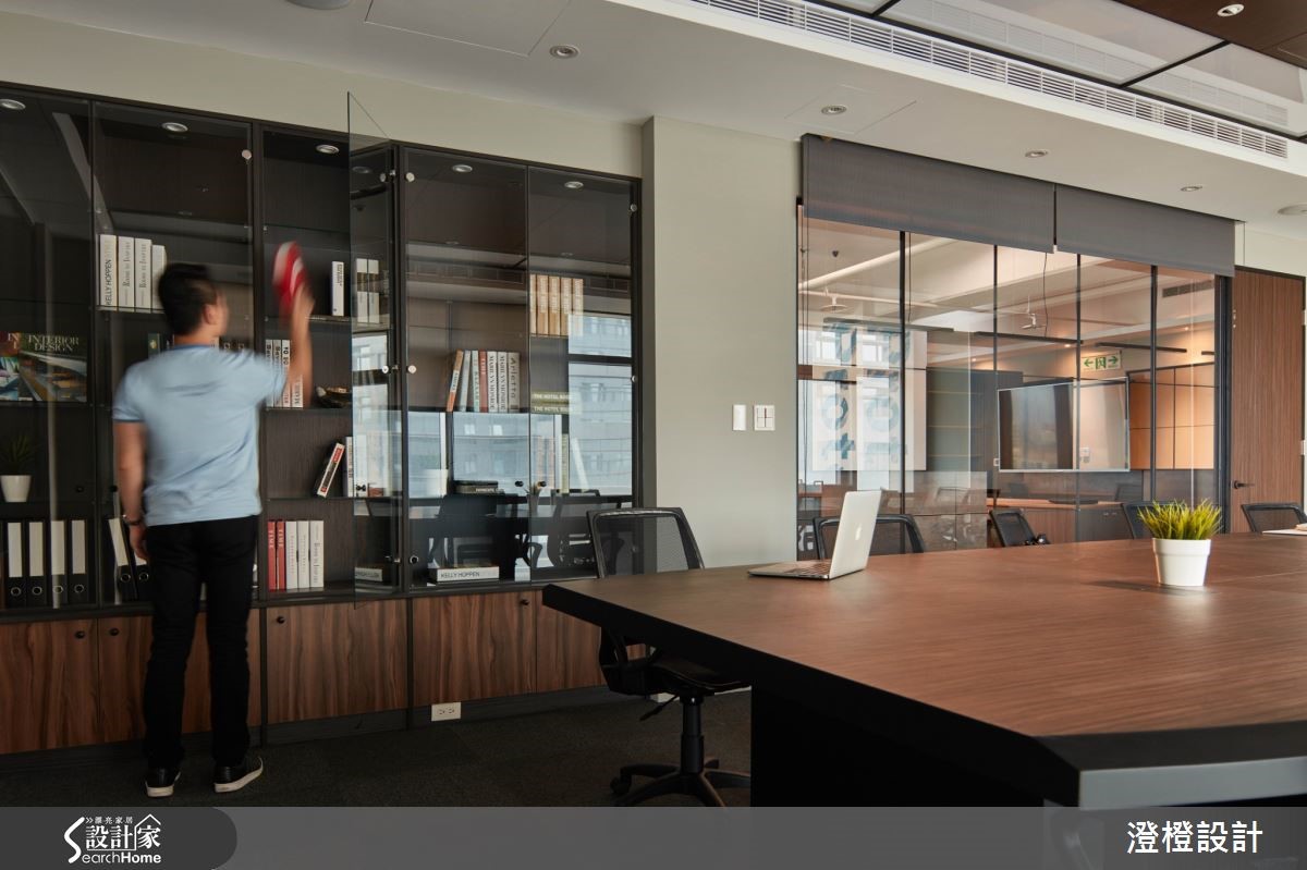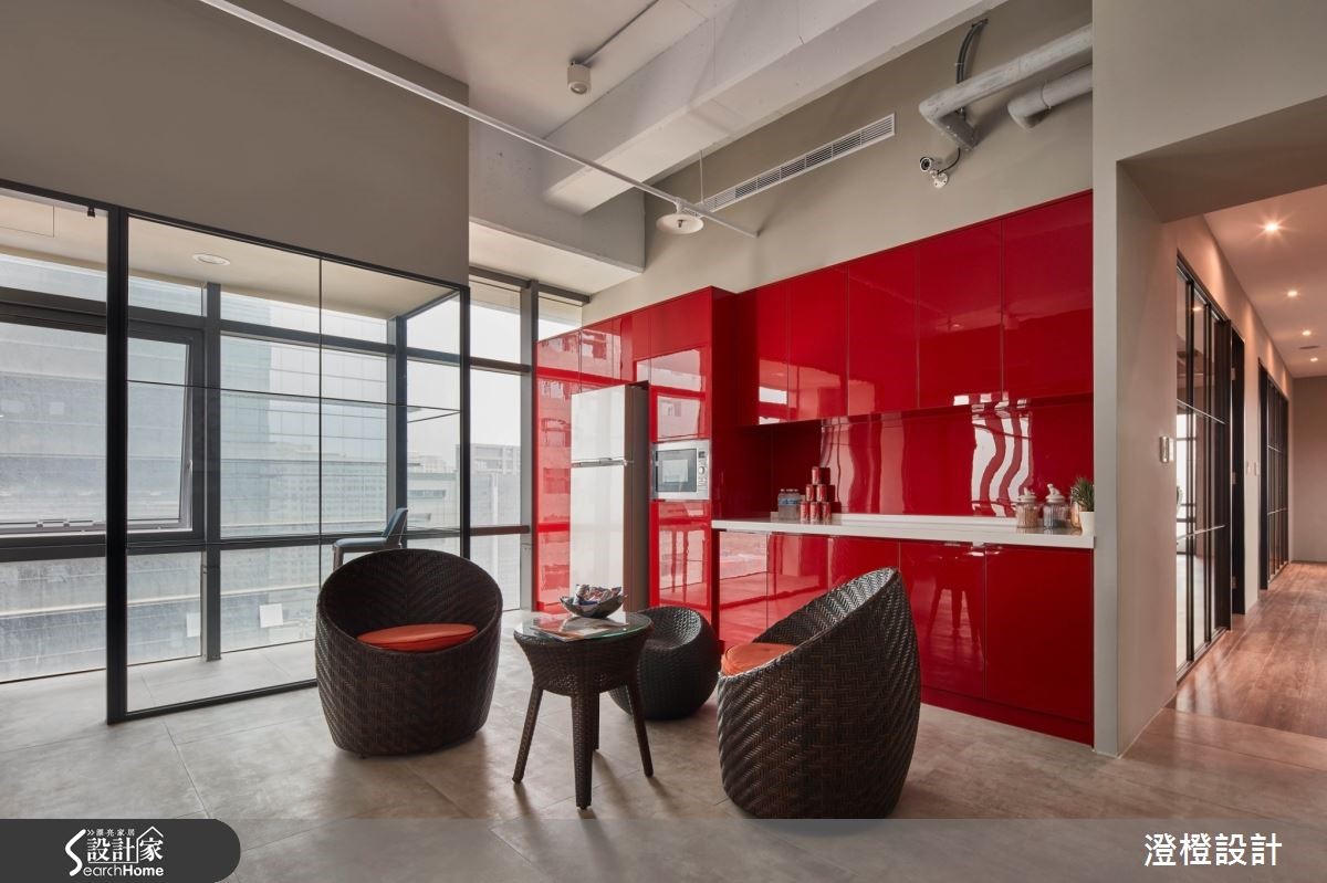 本案为电子科技业写字楼,以Loft风做为风格底调,恰到好处地融入设计亮点,同时保有理性稳定的企业形象,将配色、材质、采光与动线等加以重整,创造年轻不失沉稳的空间气度。【打造恰到好处地视觉表情】入口接待处透过灰阶营造专业氛围,并衬托出醒目的蓝色LOGO。工作区以口字型动线规划,并打破密闭会议室的既定概念,加入清玻璃隔断设计,将采光导引入室,形成明亮敞朗的办公环境,且于结构柱绘制公司LOGO,以手工方式刷出仿旧斑驳感,展现柱体另类表情。会议室墙面则配置产品展示柜,以系统柜为柜身,透过清玻柜门作出清晰的陈列展示,底部则加入不同颜色的木皮跳色,并延续黑色的线条语汇,与窗户、隔断等形成呼应,勾勒利落视觉感。休憩茶水间被安置于大片窗户旁,挹注明亮悠闲的氛围,且于角落规划吸烟区,以与窗型相仿的造型施作玻璃隔间,使瘾君子可享有一方不受干扰的场域,在此吞云吐雾,并居高临下赏览城市风景。