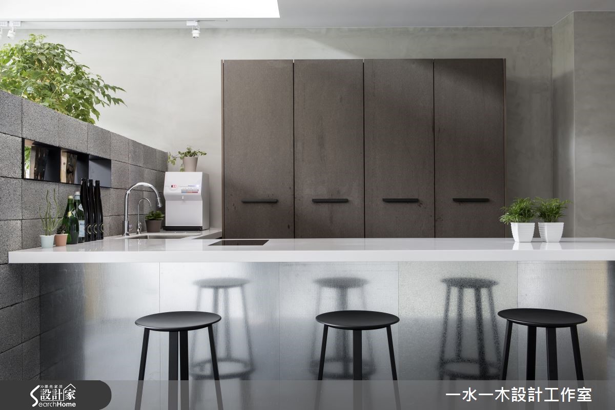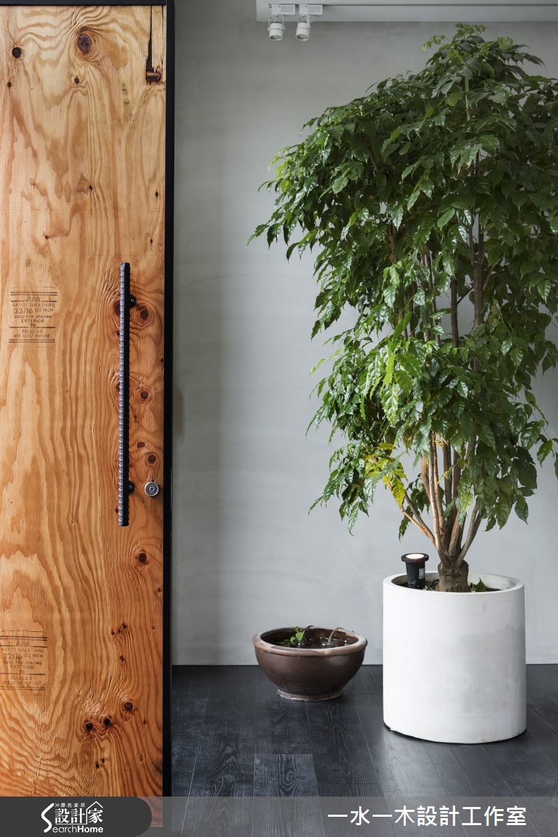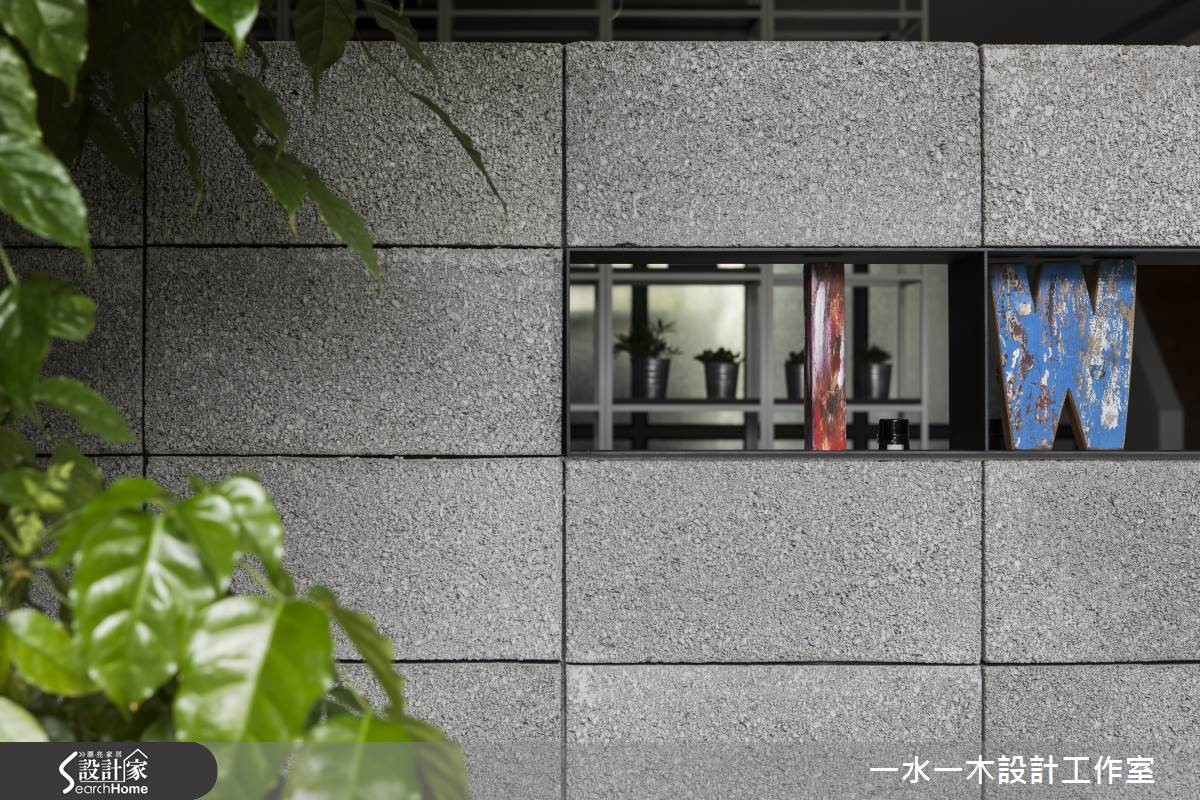 一水一木设计工作室位于约 99平方米大小的双层楼空间,以黑、白搭配木质作为视觉主调,并呼应公司形象,搭衬许多绿色植栽妆点。使整体在阳光、空气、水等元素交融下,创造自然不做作的疗愈氛围。【木石添金属素材,刚柔并济】入口玄关处,规划半高水泥砖墙形成空间里外之分,并给予局部透空,营造隐约的视觉景深。延伸入内,则呈现开放式的格局设定,透过地面材质、吧台安排、穿透感层架等作出空间区隔,保有视线串联、延展视觉。藉由吧台作出导引,区划延伸入内的动线,一旁的白墙也给予挂画与灯光投射,让单纯的墙面表情增添活泼。材质使用上,则在木石底调中,融入铝板金属等素材,于朴实温度里挹注现代专业气息,营造刚柔并济的冲突之美。延伸至二楼,则延续开阔灵活的视野,并沿着墙面安置柜体挹注展示机能,座位隔板则以清新木质打造,跳脱办公室的严肃感,让空间更显温暖! 入口处于灰墙上加入"1"、"W"字样,表示一水一木的Water与Wood,一旁则给予植栽与水钵陈设,轻巧地点出工作室形象!