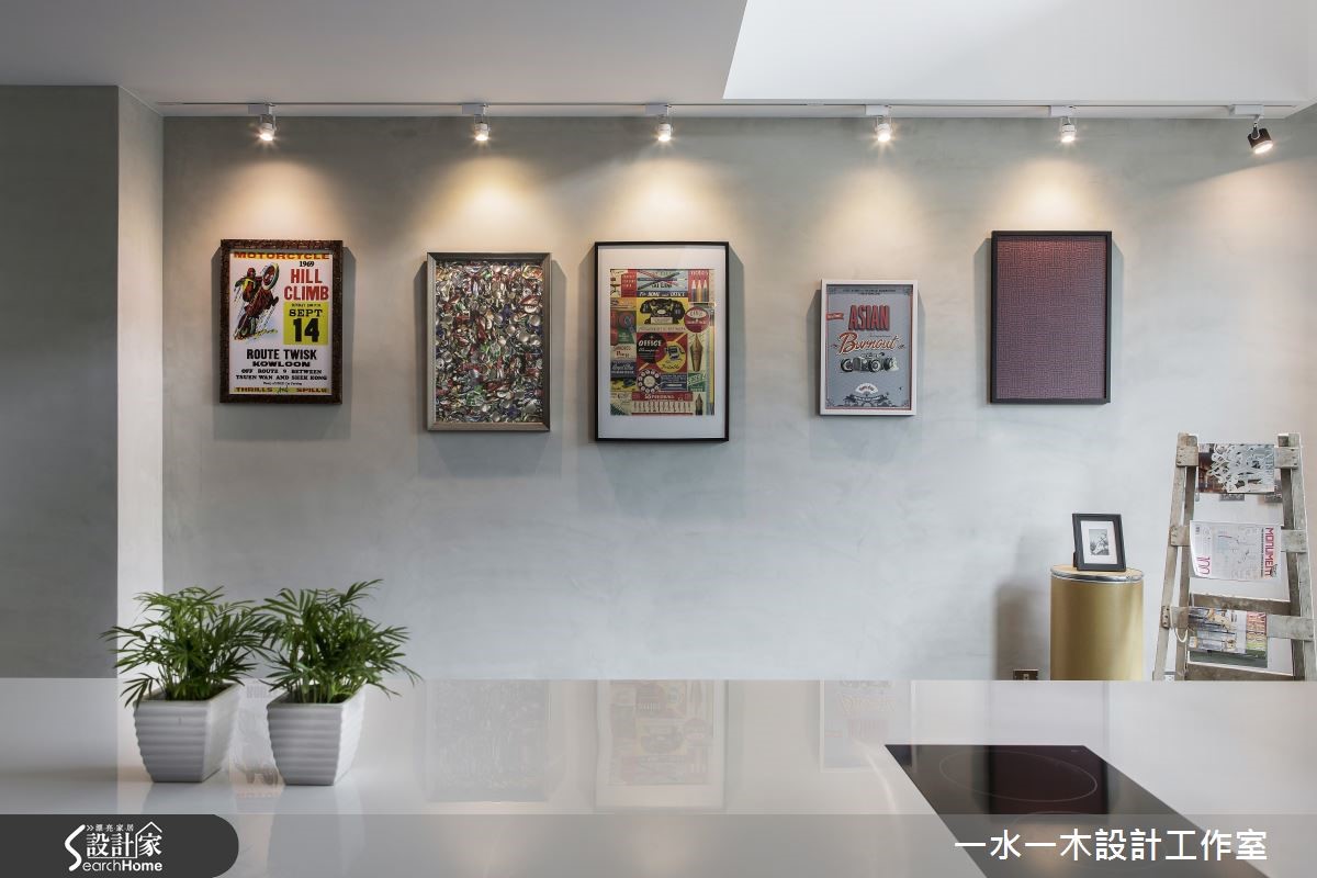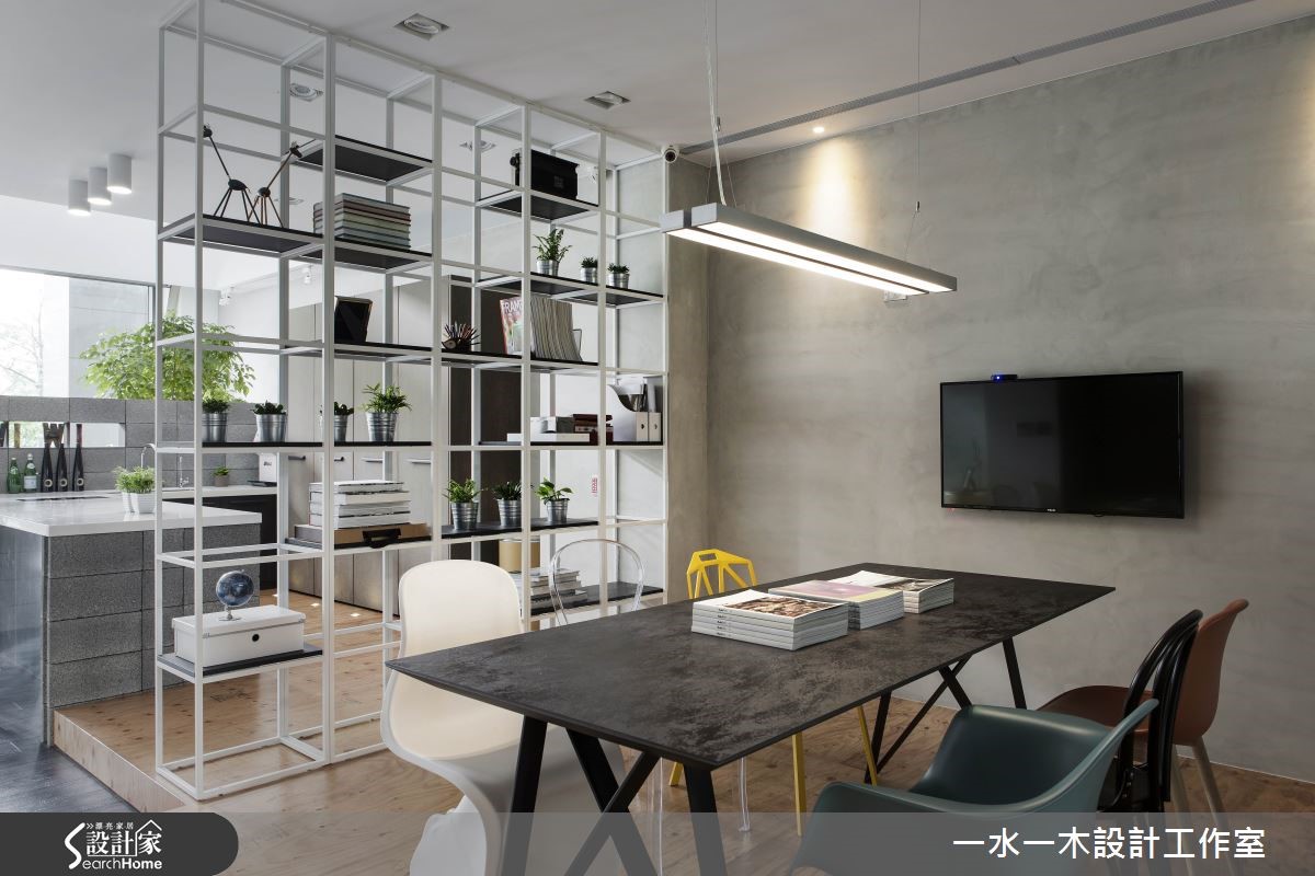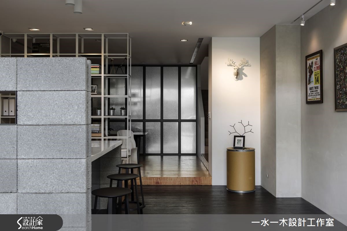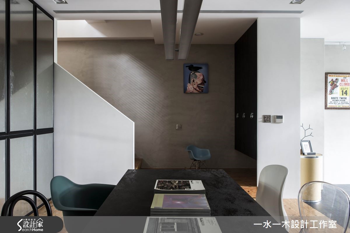 一水一木设计工作室位于约 99平方米大小的双层楼空间,以黑、白搭配木质作为视觉主调,并呼应公司形象,搭衬许多绿色植栽妆点。使整体在阳光、空气、水等元素交融下,创造自然不做作的疗愈氛围。【木石添金属素材,刚柔并济】入口玄关处,规划半高水泥砖墙形成空间里外之分,并给予局部透空,营造隐约的视觉景深。延伸入内,则呈现开放式的格局设定,透过地面材质、吧台安排、穿透感层架等作出空间区隔,保有视线串联、延展视觉。藉由吧台作出导引,区划延伸入内的动线,一旁的白墙也给予挂画与灯光投射,让单纯的墙面表情增添活泼。材质使用上,则在木石底调中,融入铝板金属等素材,于朴实温度里挹注现代专业气息,营造刚柔并济的冲突之美。延伸至二楼,则延续开阔灵活的视野,并沿着墙面安置柜体挹注展示机能,座位隔板则以清新木质打造,跳脱办公室的严肃感,让空间更显温暖! 入口处于灰墙上加入"1"、"W"字样,表示一水一木的Water与Wood,一旁则给予植栽与水钵陈设,轻巧地点出工作室形象!