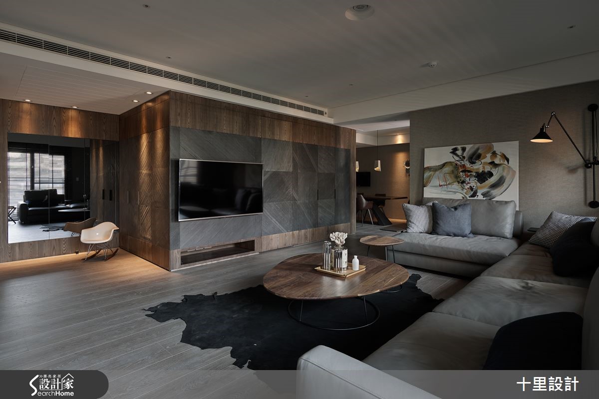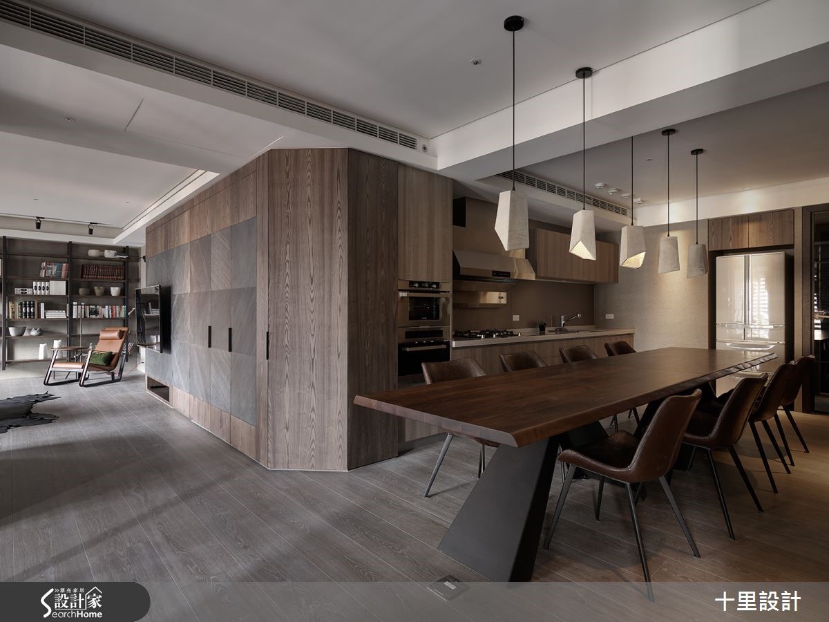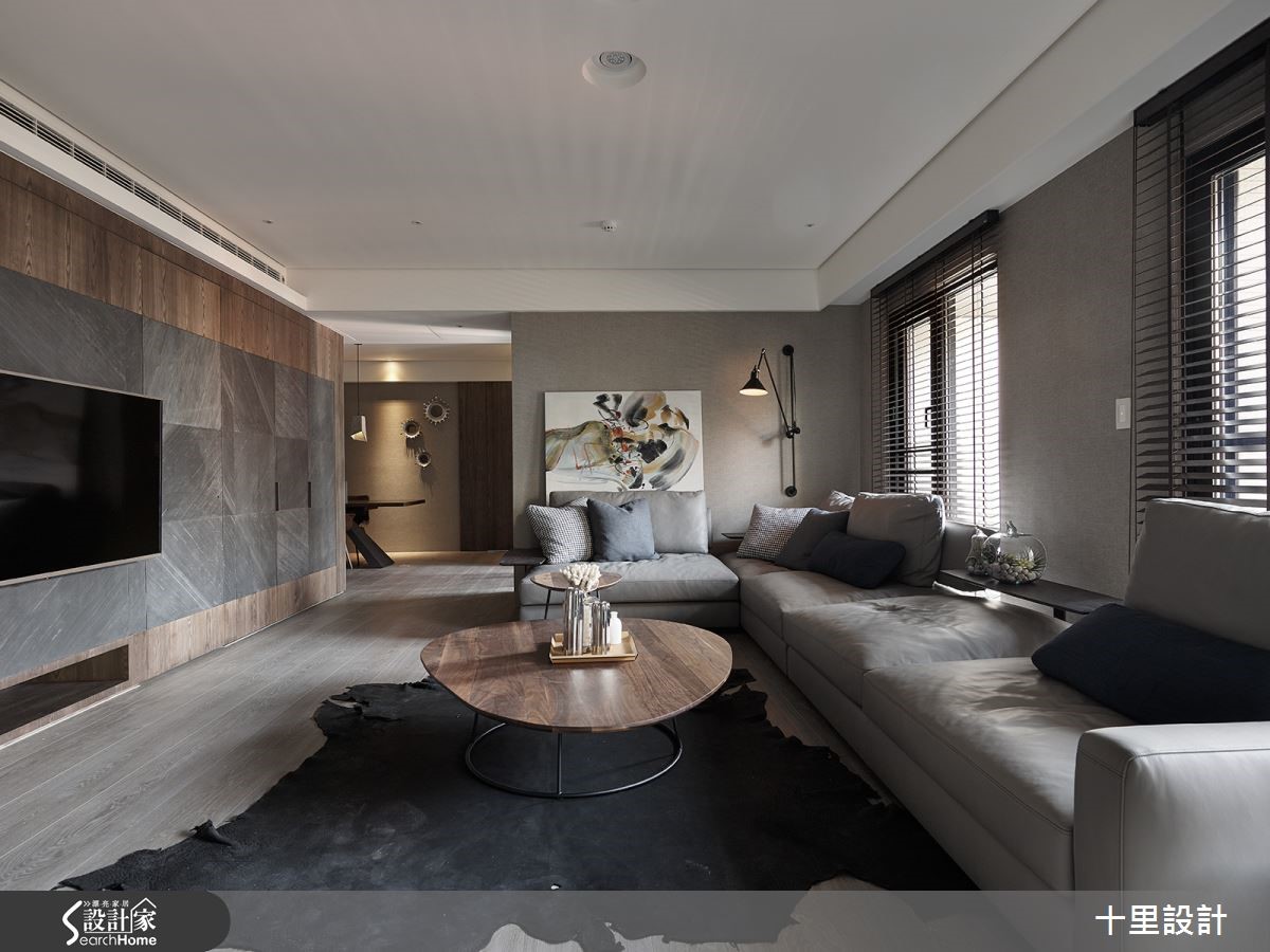 这是为屋主设计的第二间房子,在格局上将原先的四室改为三室,把空间让出,给予较为宽敞的公领域范围,并因应屋主需求,规划整面琳琅满目的收纳书墙,让居家在书香、日光、休闲感的交织萦绕中,共创美好生活氛围。【善用木石纹理,拼接错落之美】从玄关起始,在墙面镶嵌镜面,作为穿衣镜使用,并拼接木皮与石材薄片,衔接玄关和电视墙面,构成连续的动线导引。对应电视墙的石材,客厅墙面也顺势以中性灰作为主色,搭配温润的木地板,形成有暖度的空间。且规划整面开放式书墙,辅佐灯光照明与百叶窗光,注入书香韵味。餐厅一旁配置玻璃门片做出采光导引,且规划开放式一字型厨房分享采光,位于中央的餐厨区不致于阴暗。寝卧延续公领域的素雅基调,将冷调灰色及沉稳木质作出完美结合;墙面悬挂以一幅艺术挂画,透过大胆抽象的图绘替空间画龙点睛。