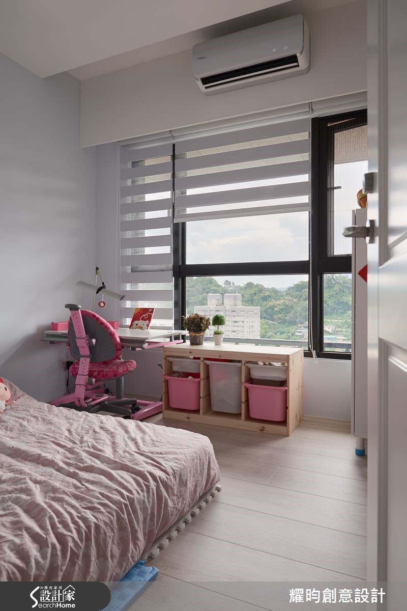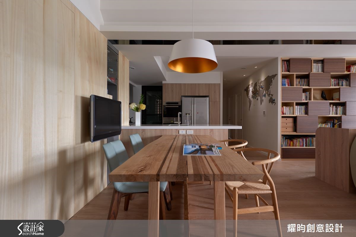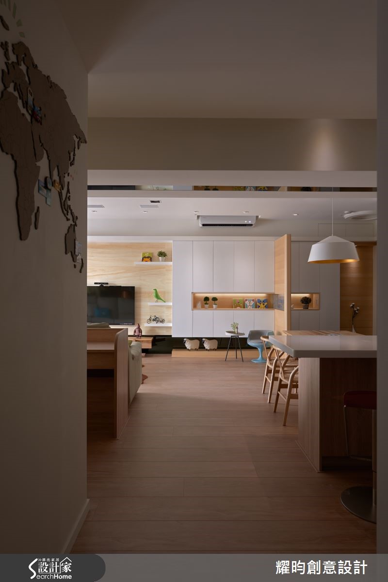 112平方米居宅,设计师拆除既有厨房隔断,给予开阔的公领域范围,并大量运用木质营造冬暖夏凉的悠闲氛围,同时揉入装饰品带出童趣感,使空间洋溢着温暖、活泼的生活质韵。【木质素材,营造放松调性】在空间基调上,设计师加入大量木材质,营造休闲放松的整体调性,并扩大公领域让书房、客厅、餐厨等相互连贯,再藉由落地窗挹注丰沛采光、造就宽敞明亮的相聚场合;另搭衬色彩缤纷的摆件、壁贴等,营造童心感的温馨氛围。电视墙则加入悬吊柜体及展示架设计,透过精心策划的量体安排与切割比例,架构美观实用的立面表情。书房后方则规划造型柜体,透过方块木板材的穿插变换,与书籍色彩错落相间,带出丰富的视觉层次。此外,改造原先封闭的厨房格局,并藉由连结餐桌及吧台,构成开放用餐领域,一方面便于烹饪前的备料工作,同时也让家人的互动关系更为融洽紧密。【引景入室,卧室增添美感】卧房氛围的营造,则运用粉红色彩植入居者个性,也带出些许甜美梦幻的气息;其次,利用大面开窗结室内外视野,让人放眼望去,即可感受到绿意山景的美好,也成为点缀空间的漂亮元素。除了上述巧思,设计师还针对厅区大梁,运用镜面化作线条修饰梁体,且从客厅延伸至餐厅,不仅纾缓压迫、达到视觉和谐,更借着与木质相迥的亮面建材,带出些许现代感异趣!