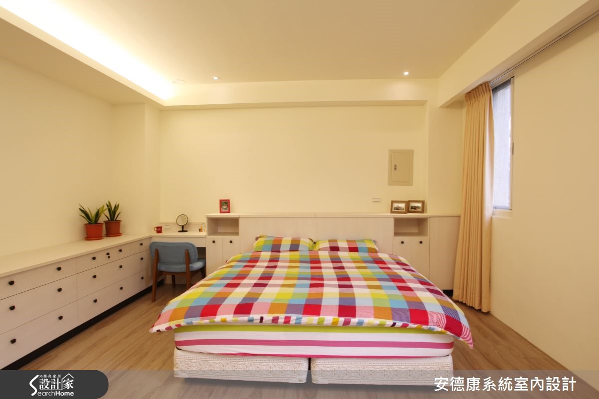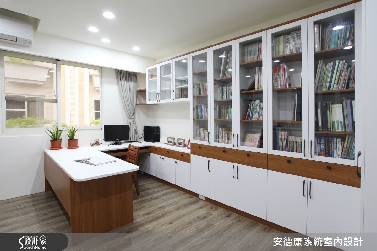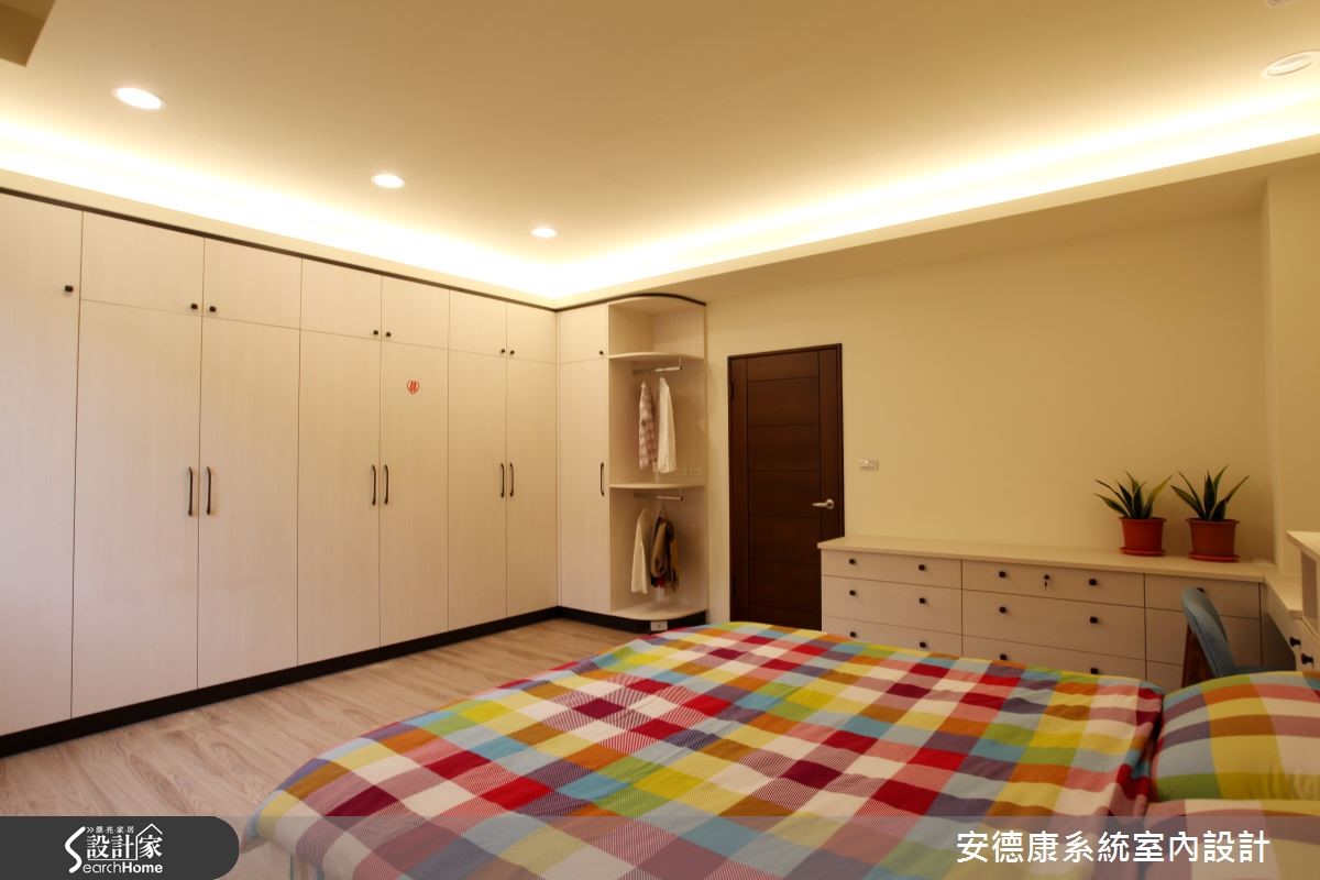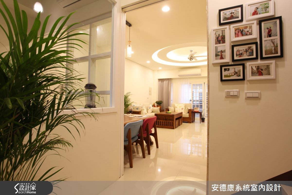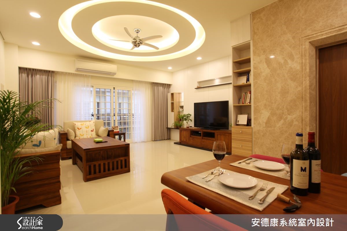 面对现有的实木家具、对风格与设计没有概念的屋主,设计师悉心沟通与引导,以悠闲的度假氛围,衬托212平方米的独栋楼。同时善用系统柜优势,兼具风格营造与收纳机能。 【双圆天花规划,吸人眼球】配合现成的实木家具,设计师善用系统柜的简洁特性,打造合宜风格。同时,藉由开放空间设计解决采光不足的问题。风格的营造上,因应屋主需求,将"圆融"意象纳进客厅天花。细腻工法打造双圆造型,加入柔和照明,呈现东方禅意气息。开放公共区域以简约线条与展示柜,凸显实木家具的沉稳质感,并利用格状玻璃推拉门,隔绝厨房油烟,也兼具客厅与餐厨的通透性。在楼梯墙面打造照片墙,成为全家人的温馨背景。书房与主卧则发挥系统柜整洁特性,打造大量的收纳机能。