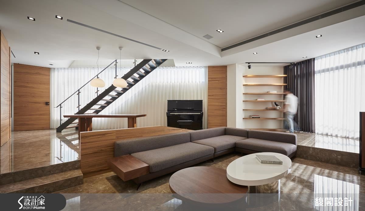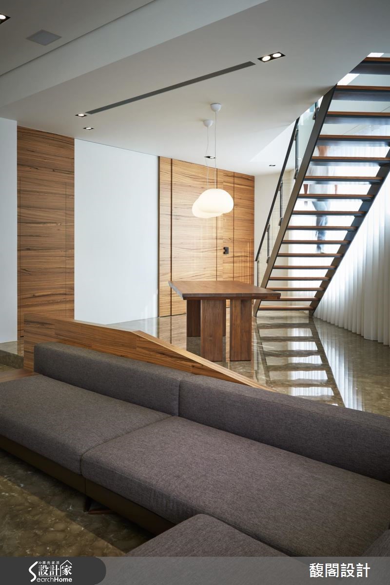 这是一块三角畸零地,自无到有的自地自建别墅。1楼作为营业空间,2至4楼则是住宅,于空间内挹注崭新的建筑思维,在水泥丛林与铁皮屋林立的都市里,创造出截然不同的风景。 【错层手法放大格局、制造光影】客厅空间顺应既有格局,运用错层结构,刻意架高阅读区与餐桌区,使客厅有如山坳般存在,达到凝聚家人情感作用,为居住者带来安心舒适的感受,并藉由不同尺寸的动线开口,使空间自然地连贯延续。透过楼梯串联上下,巧妙连结公共及私人起居。以踏阶创造格栅般的层次效果,赋予掩映的唯美光影,并使梯间适度保有与户外的连结,随时于室内感知自然时序的微妙变化,型塑每个转折空间的美丽时刻。