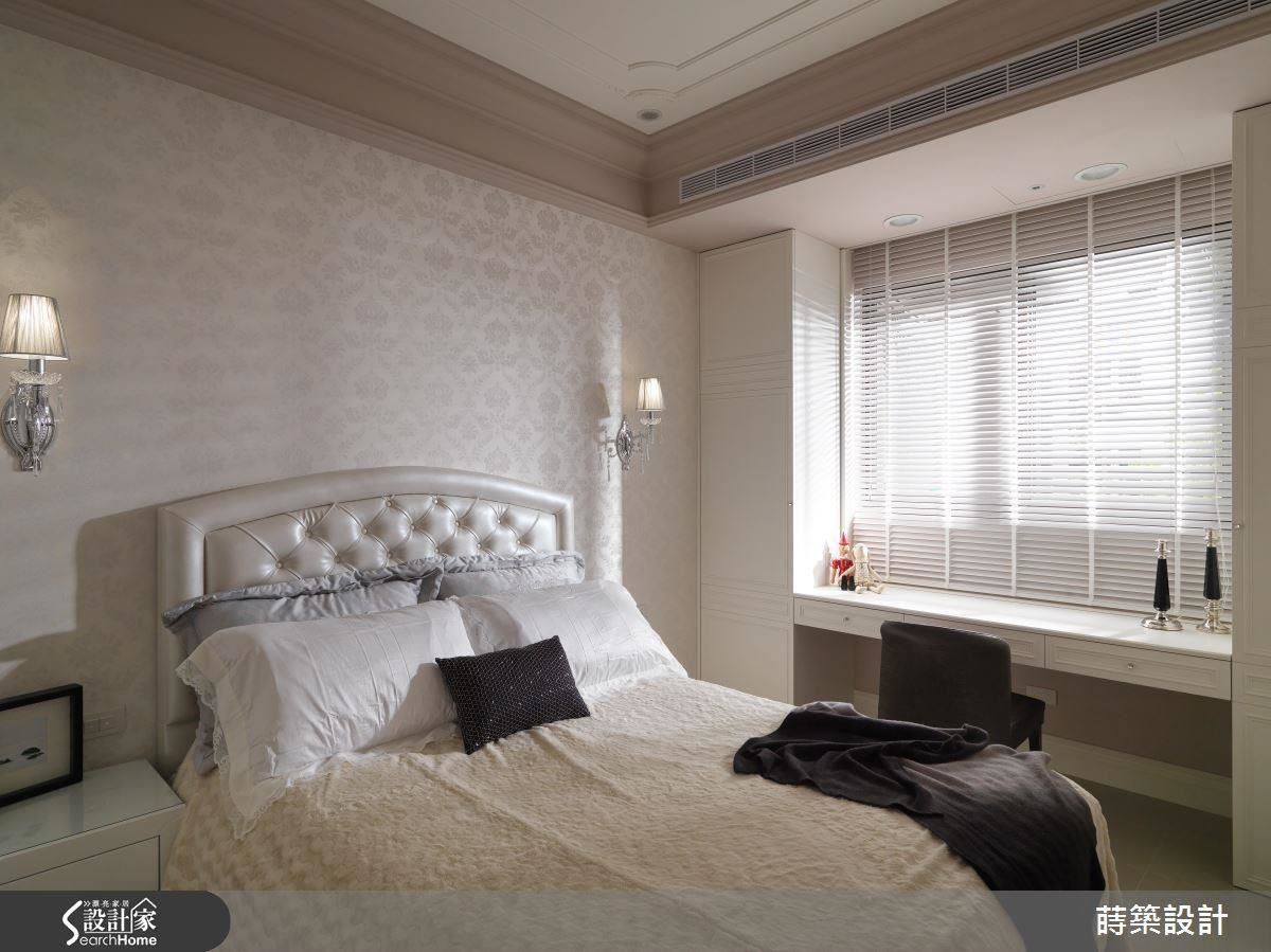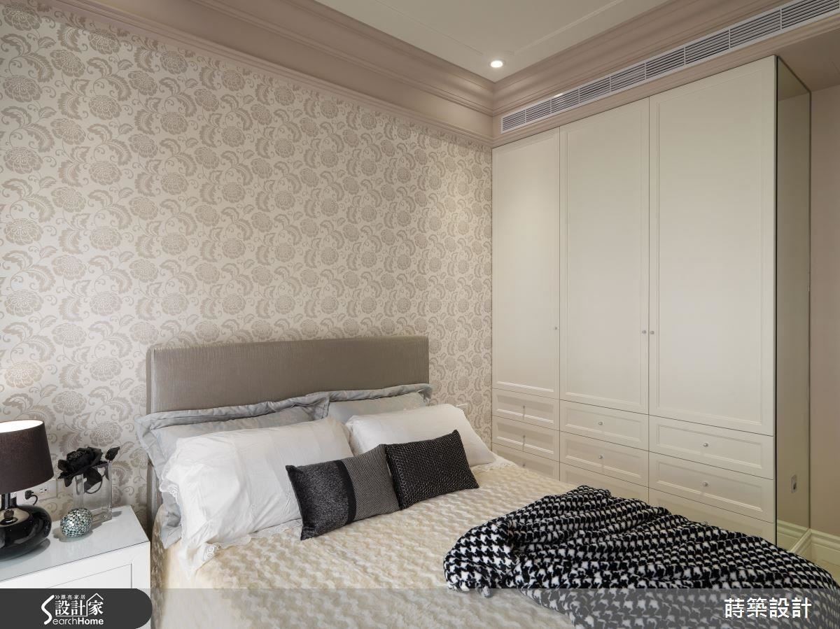 私密空间的主卧室采取温暖的豆沙色调,主墙也以若隐若现的墙纸装饰,强调柔和的氛围。其次,随着主卧门往玄关方向挪动约60厘米,多出的宽度刚好可以打造收纳柜及梳妆台;并且巧妙的将化妆镜藏在靠床头侧的收纳柜后,有需要时再拉出即可。