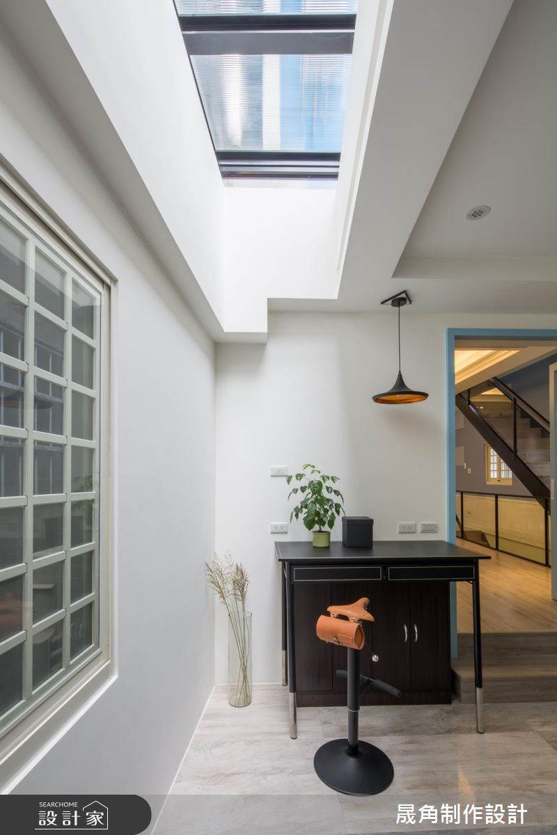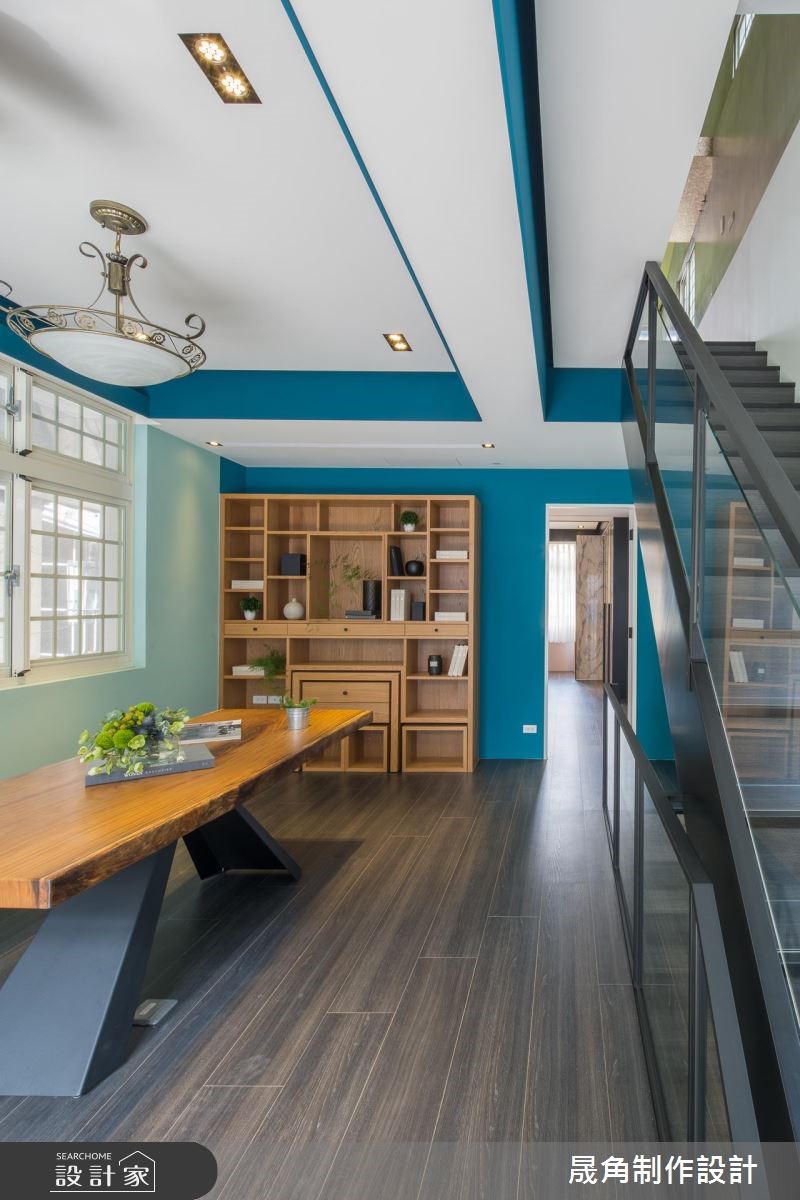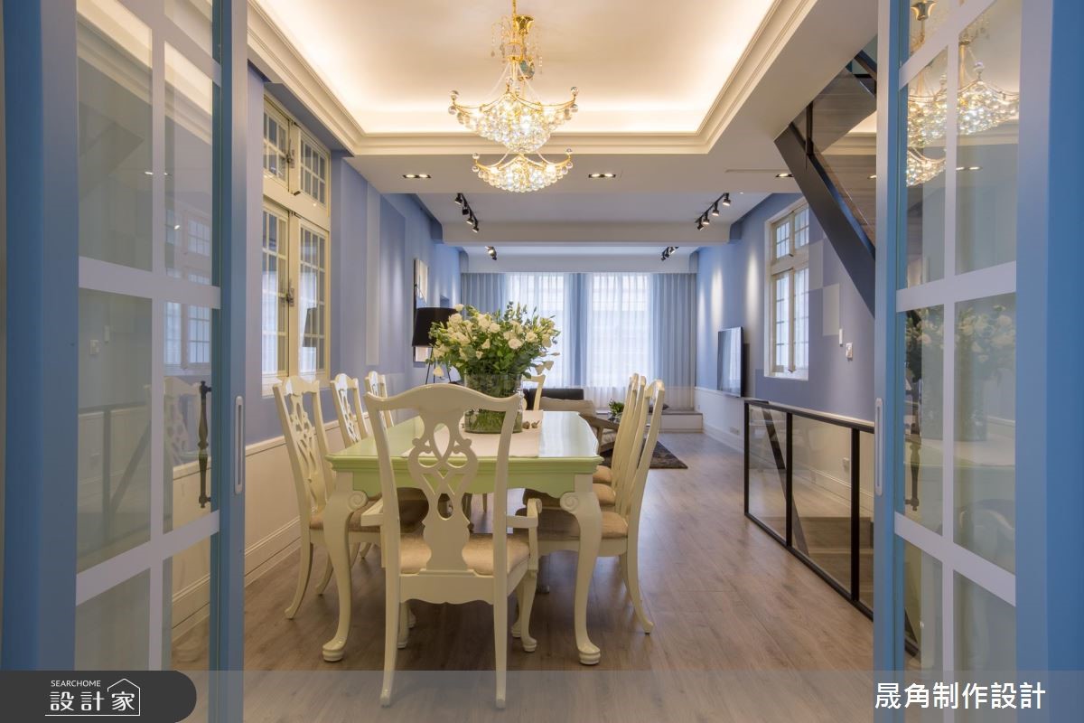 屋龄超过40年的独栋楼,以多层次的蓝为主色,混搭各式风格元素,让396平方米大宅重现生机活力!从外观设计开始,设计师即为独栋楼营造与众不同的缤纷感受,蔚蓝墙面搭配拱型窗与雕花设计,显现浪漫的法式风格。 【运用色彩,营造不同空间风情】 进入公共空间,墙面与格状门片漆上婴儿粉蓝,取代外观的鲜艳明亮,转化为含蓄温柔的氛围。而餐桌上方悬挂的水晶吊灯、嫩绿色桌面以及带着优雅弧度的桌椅设计,则延续了法式情调。 拾级而上,来到公私领域的交界处,湖水绿及宝石蓝的色调,搭配线条明确的楼梯与大量原木设计,成为秾纤合度的混搭风景。主卧区则利用亮眼的鲜黄色墙面,与大理石纹路柜面营造有趣的冲突美感;卫浴空间以马赛克砖拼贴而成,配上吊灯,形成时髦且复古的气息。