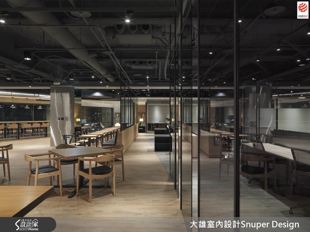 设计师取自空间与自然共存的设计理念,将旧厂粗犷的工业元素,与建筑条件相融合,揉出既内敛又霸气的空间表情,开创深具魅力的工作场域。【相异材质,碰撞出前卫办公室】空间突破传统的封闭写字楼,运用铁件、木质、深色玻璃完美搭衬,使异材质碰撞出时髦前卫的设计感,同时舍弃隔断配置,反以铁网、灰玻区隔场域,让光线可自然流动,型塑宽敞通透的空间感,使员工随时随地都能彼此脑力激荡,挹注振奋人心的正向氛围。【沿窗陈列单椅,享受美丽景致】空间除了作办公使用,更结合迎宾接待区与轻食机能,巧妙将咖啡厅形象带入商业办公空间,配置吧台与木制餐椅,并循着窗户沿面陈列单椅,藉由落地窗引入挑高美景,让人无论在此休憩或洽谈,皆可同时享受居高临下的美丽视野,提供员工可纾压疗愈的休憩天地!