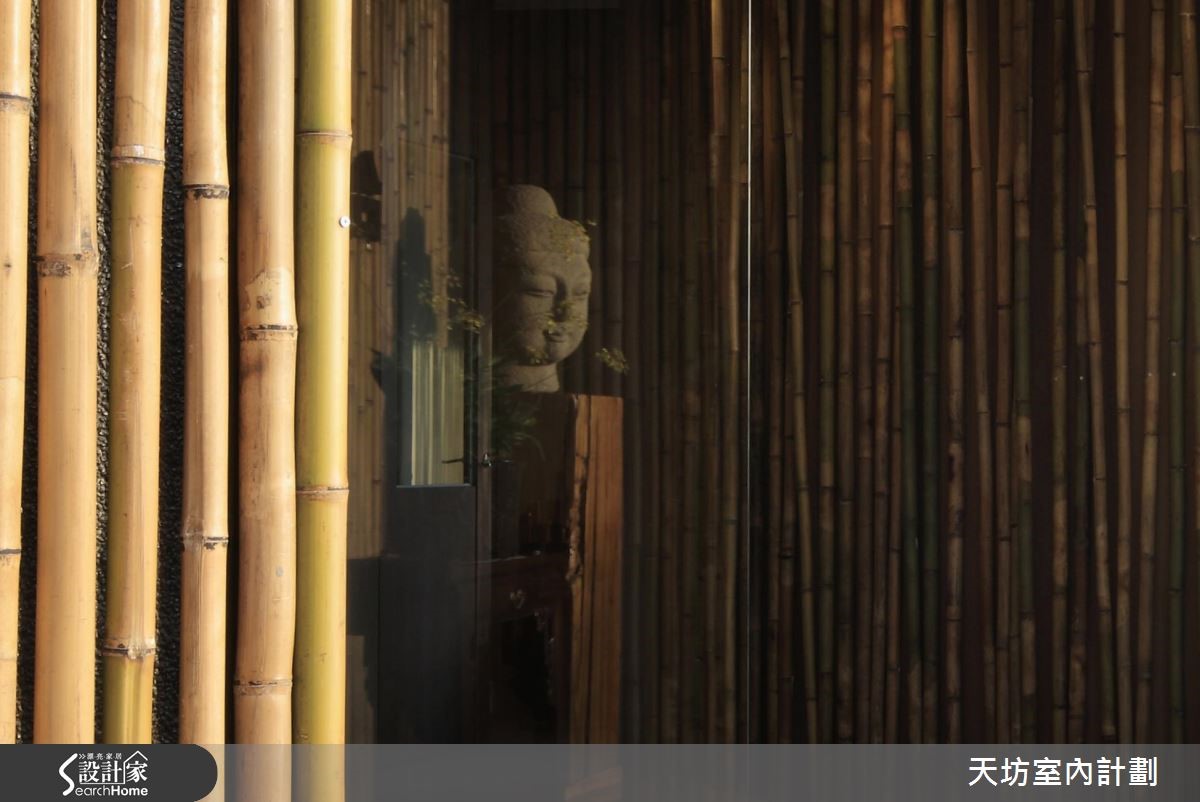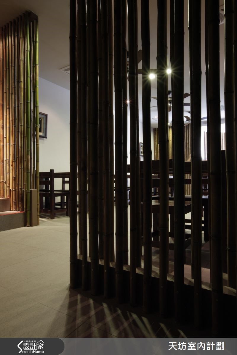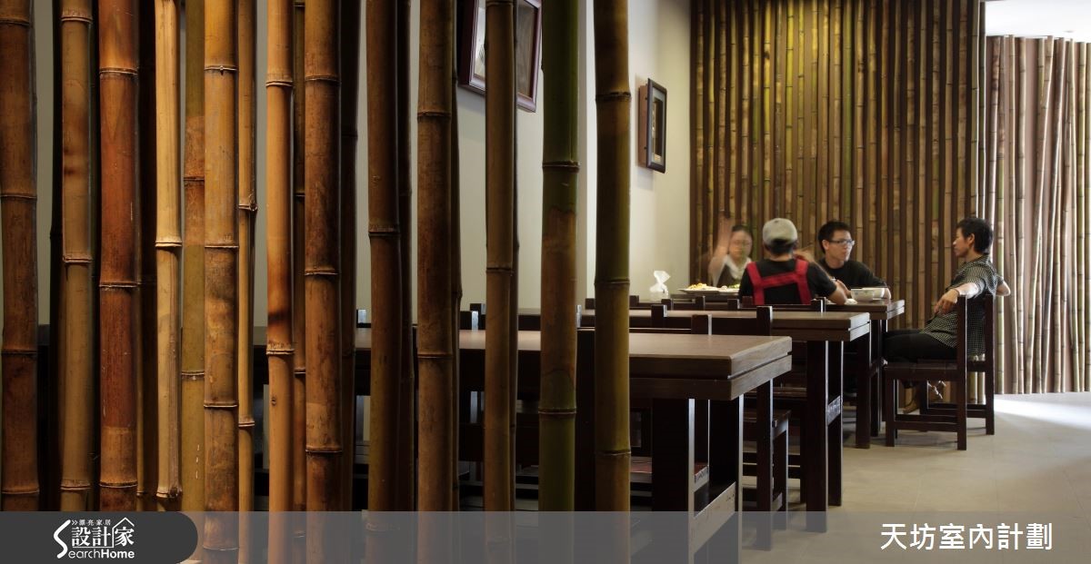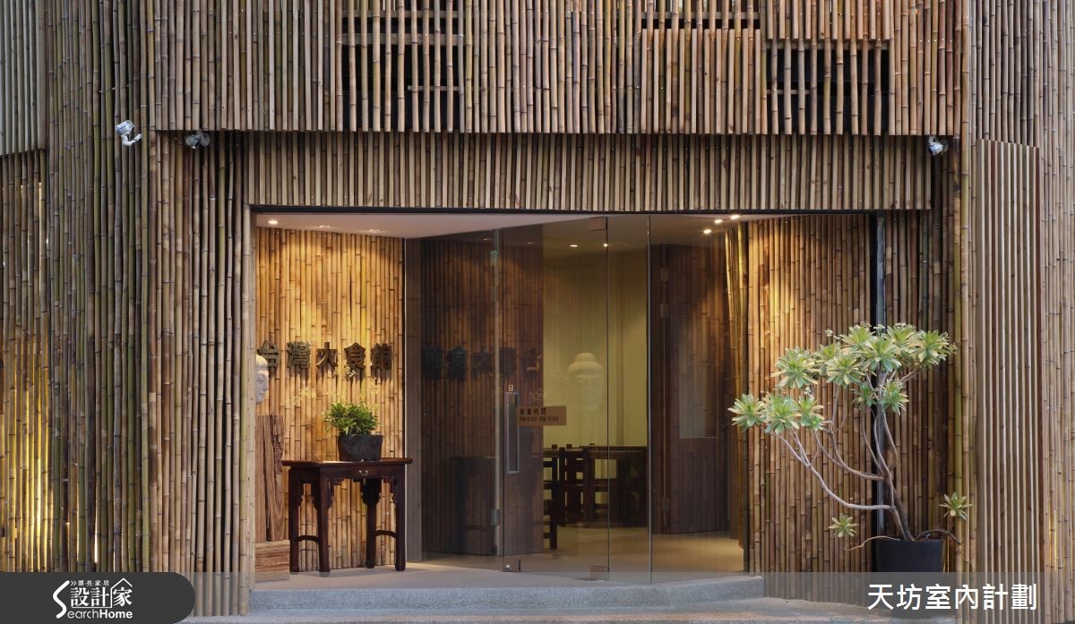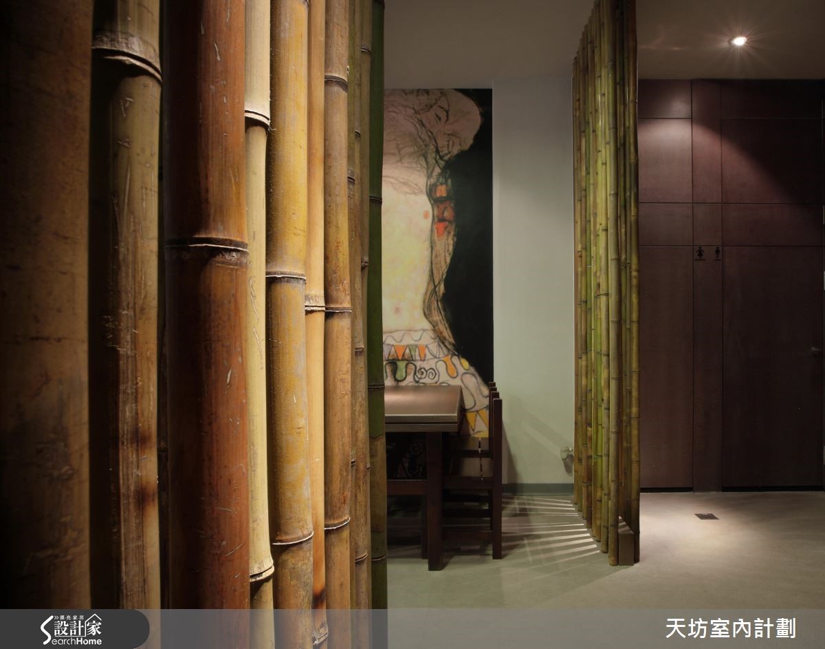 无菜单料理”台湾大食馆”,设计师赋予静中造境的理念,以简约的竹为色彩,表现清爽,尽显出食之色。以单纯的竹子为概念,勾引出食之香;以素雅的竹为结构,引渡出食之味,让人心境平和,可自在享用食之色香味,显露平和的禅意,替客人带来五感满足。【在光影中,体验东方禅的乐趣】建物透过桂竹建立竖向线条,赋予简洁利落的外观,诠释自然元素与建筑的完美结合,带出浓郁的东方禅元素,传递具有象征意义的君子气节,使空间印象显得脱俗不凡。地坪踏阶则采用抿石子铺陈,使顾客可在一步一履之间、脱离外在城市喧嚣,感受到质朴恬静的意境。入口处则陈列木桌、佛像与装饰灯光,搭衬绿意植栽造景,构筑生生不息的禅风意趣。室内透过竹材建构格栅,导引每个行进动线,并让自然光可借着缝隙筛落至室内、引流空气与光线,让斑斓光影化作空间中的美妙表情。